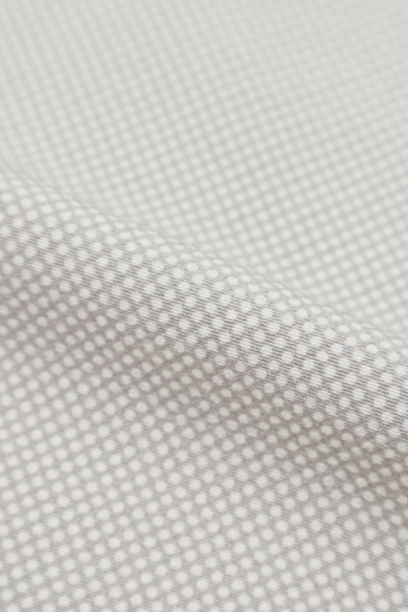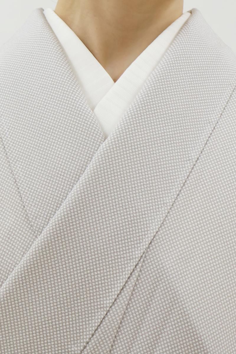 桜鼠色が近いでしょうか、温かみのある薄グレー系の地に行儀を染めた単衣の江戸小紋です。
