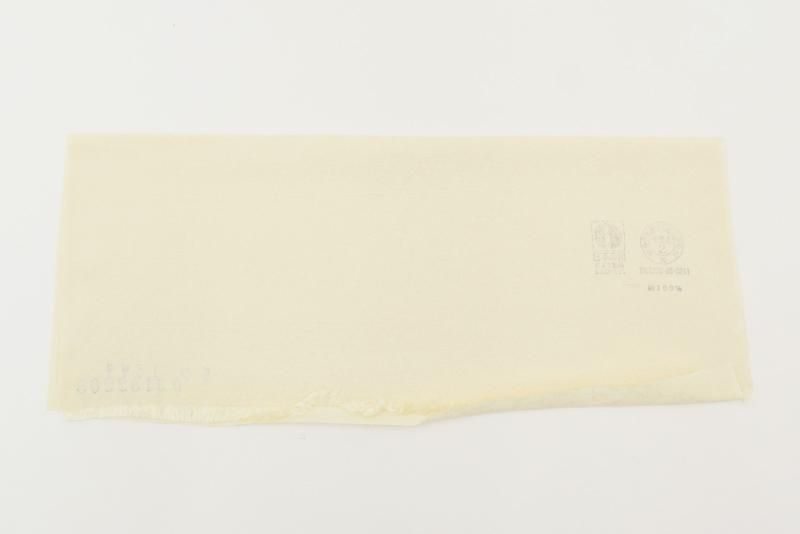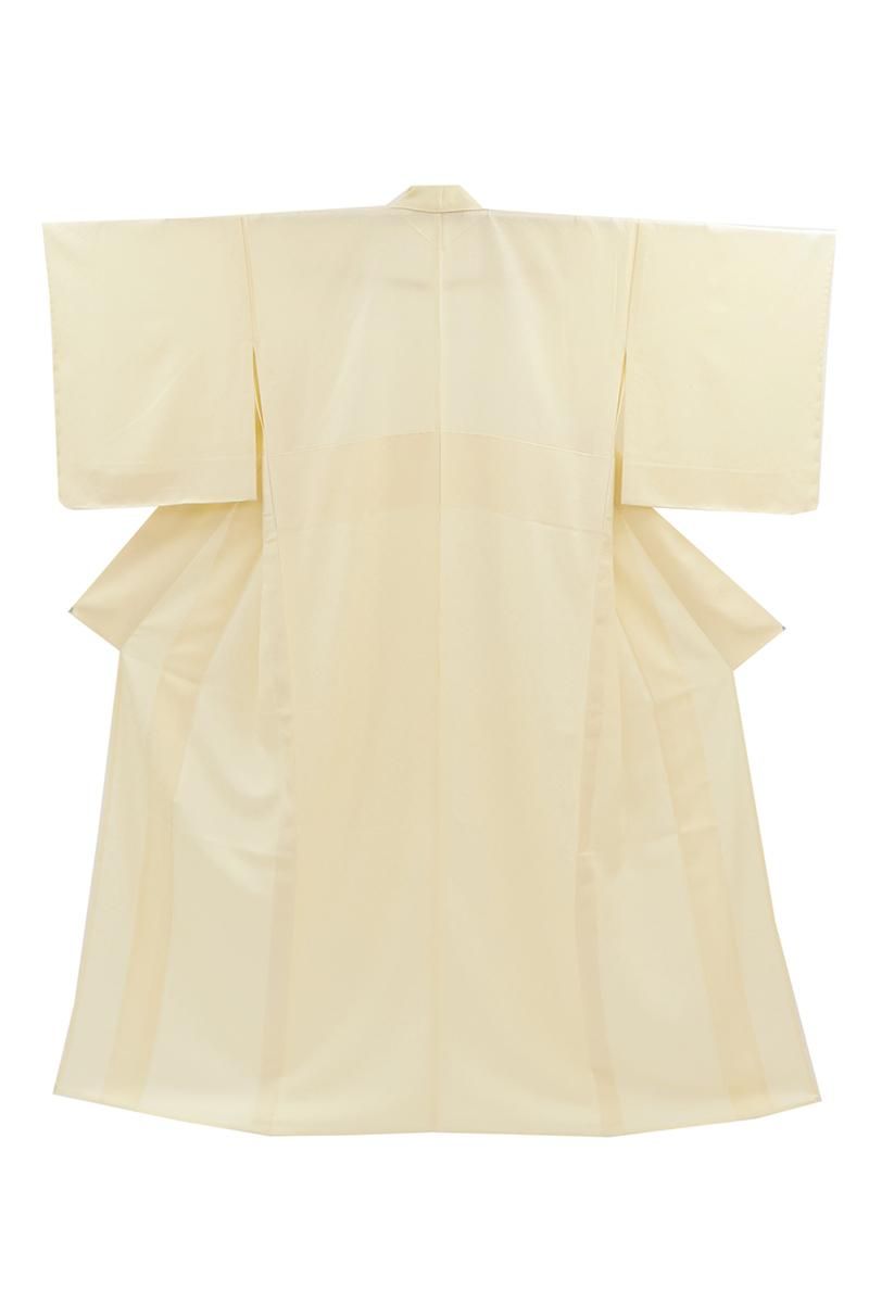 色を薄めたクリーム色が近いでしょうか、ごく淡い黄色系の地に、細かな横段に花唐草の地紋が浮かぶ単衣の色無地です。絹糸の光沢を豊かに映す、明るく女性らしいお色目が目を惹くお品、合わせる帯によってモダンにも古典的にも様々な雰囲気の着こなしをお楽しみ頂けることと思います。改まったお席やお呼ばれ、パーティなどにいかがでしょうか。