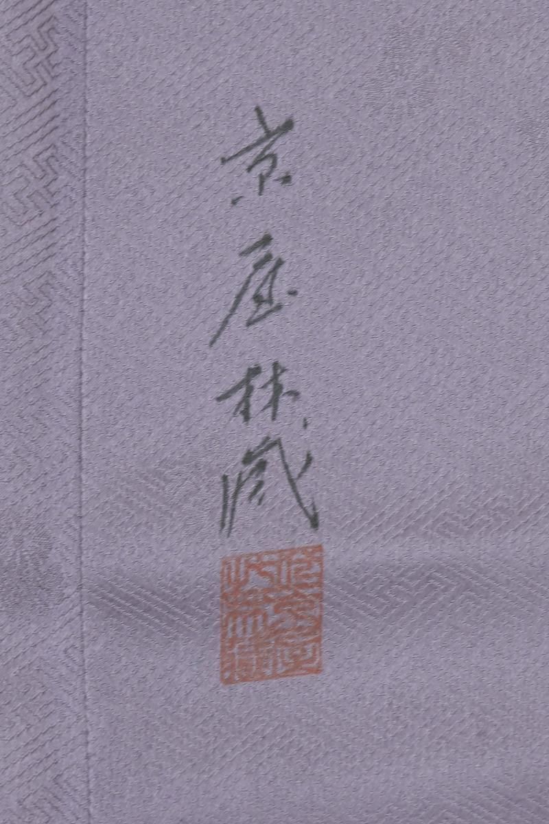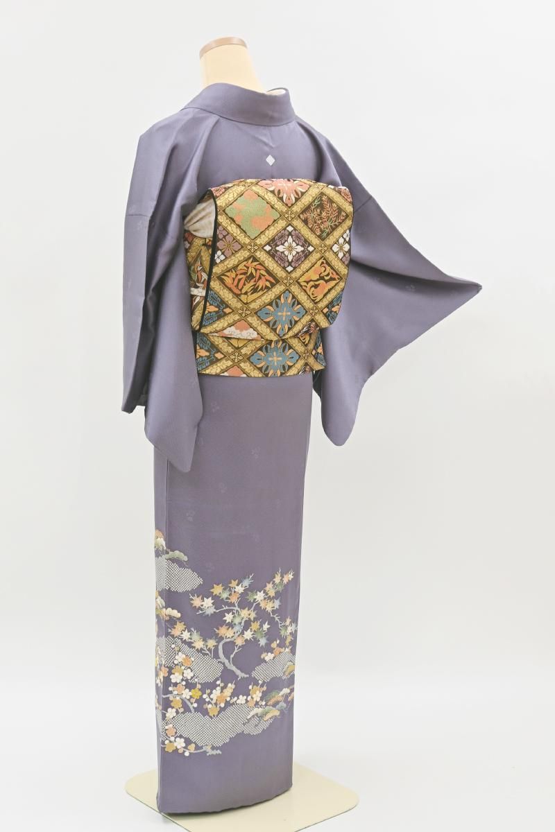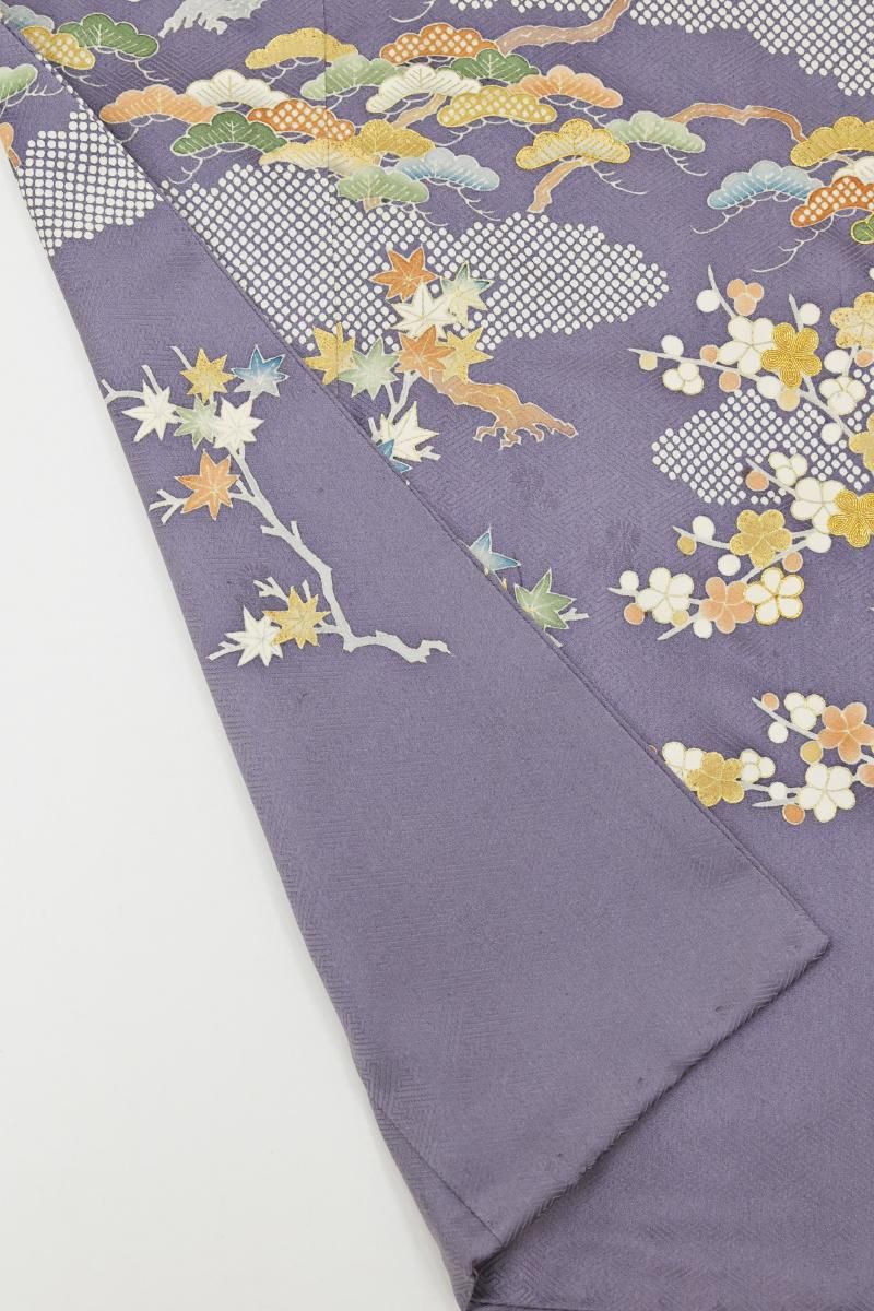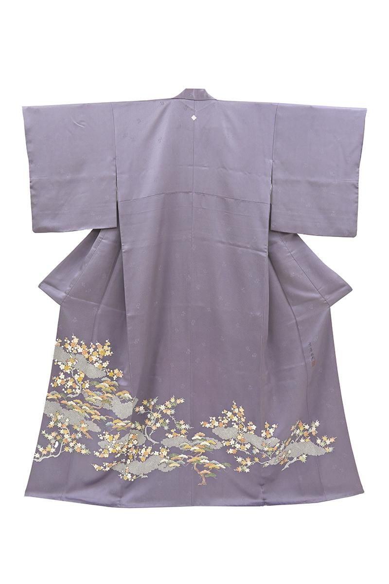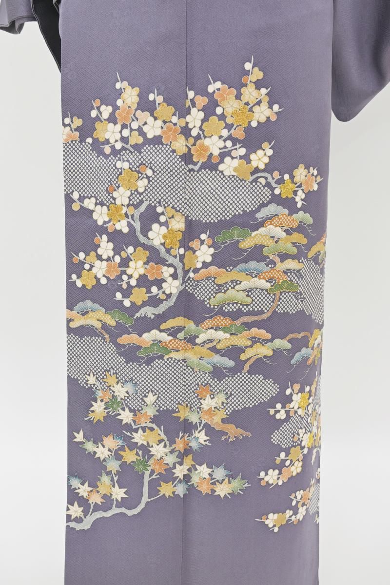 着物雑誌などでもお馴染み、豪華なフォーマルの着物で定評ある銀座・十七代目京屋林蔵の色留袖です。こちらは鳩羽紫色が近いでしょうか、紗綾形に花文の地紋が浮かぶ灰みの深い紫色の地に、梅や松に楓の図を描いたお品、金彩や金駒刺繍の煌めきが気品を添え、装いをしっとりと引き立ててくれることと思います。色留袖のかたちですが染の一ッ紋付きですので、訪問着感覚で着用の幅も幅広くお召し頂けそうですね。お祝いのお席やパーティなどの場面にいかがでしょうか。