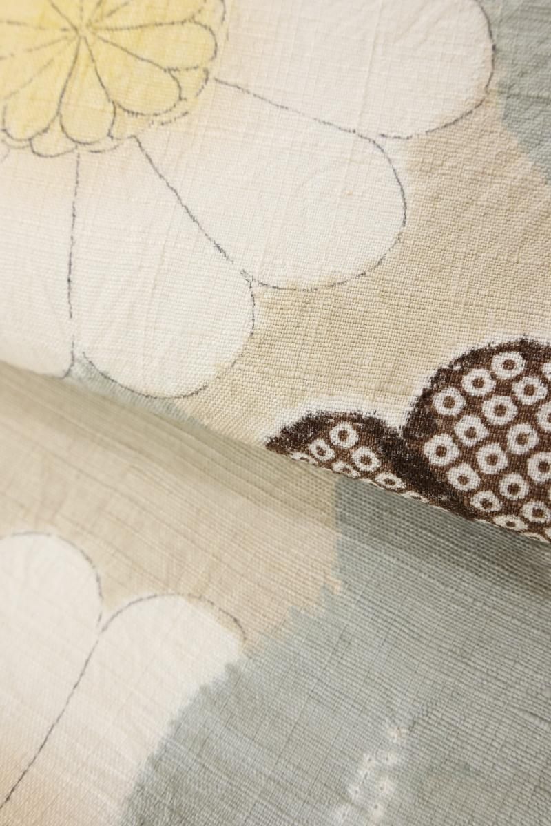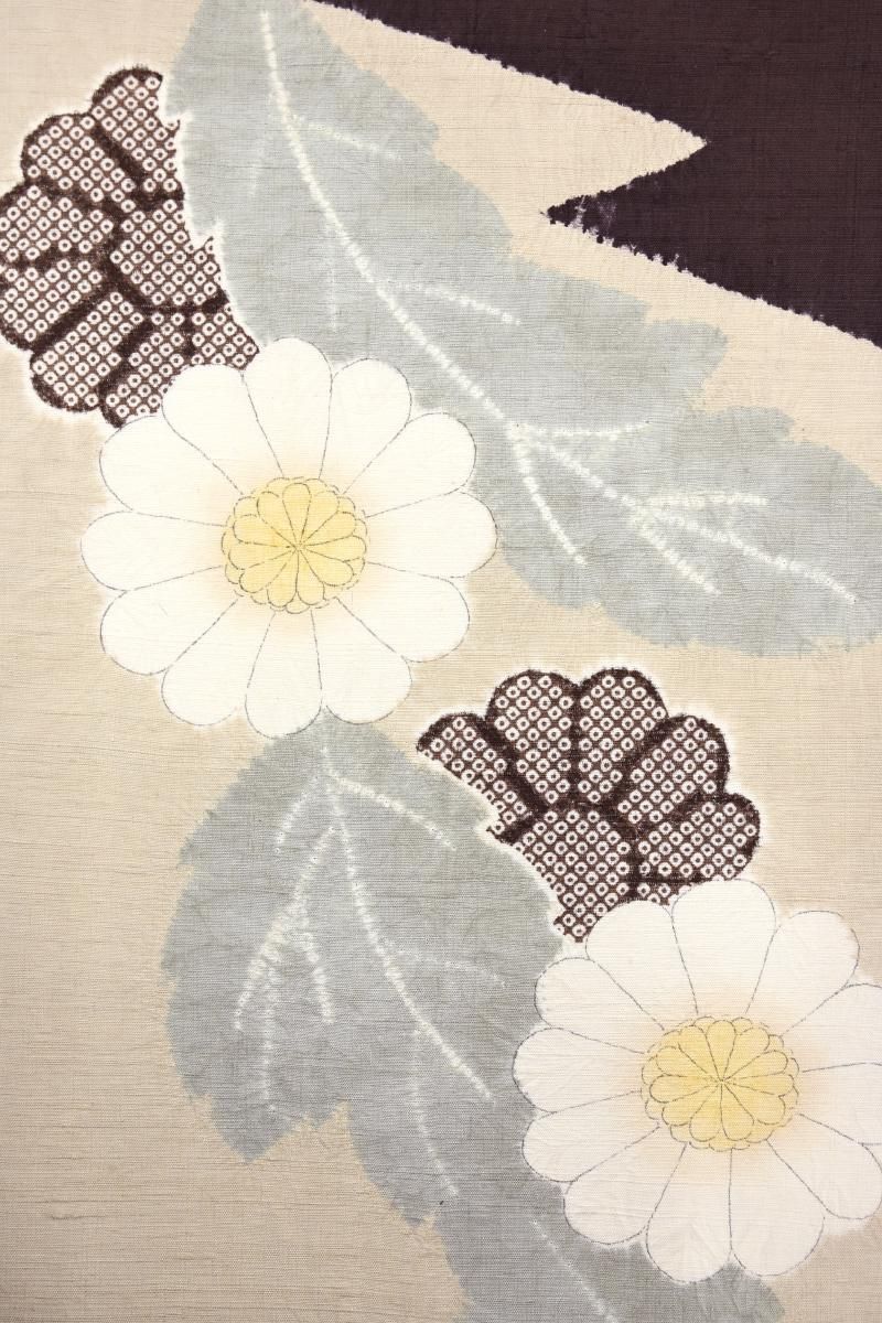 素色とココア色が近いでしょうか、灰みのベージュと深い焦茶色で場を分けた地に、絞り染めで菊の図をあしらった名古屋帯です。ぽつぽつと節の浮かぶ地風に、おおらかに表現された意匠が味わい深い趣のお品、絶妙な色の取り合わせがモダンな雰囲気も添えていますね。紬や小紋などに合わせて、上品なカジュアルをお楽しみくださいませ。