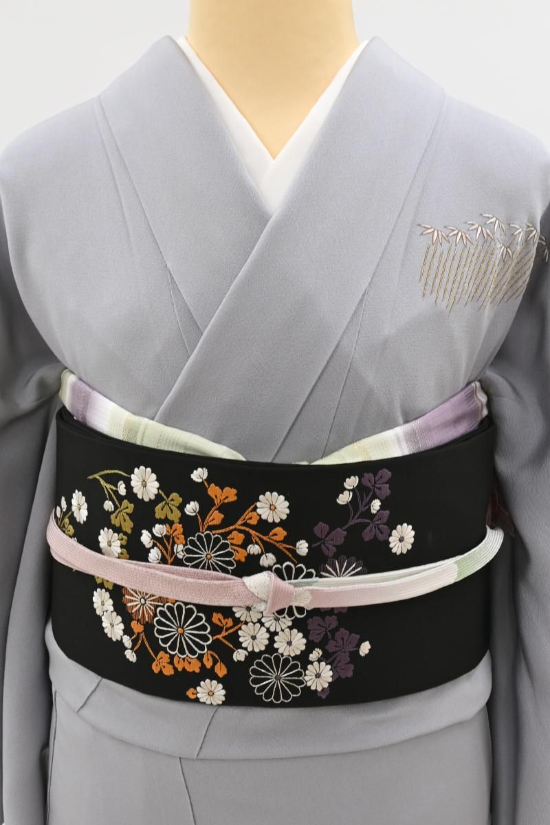 シックなお色目に鮮やかに浮かび上がる優雅な意匠が後ろ姿を印象的に引き立てるお品、繊細な刺繍が大人の気品あふれる華やぎを創り出してくれることと思います。銀糸の煌めきがさりげないアクセントとなり、エレガントに装いを彩ってくれそうですね。格高の小紋や色無地、付下げなどに合わせて、お茶席など改まった場面にいかがでしょうか。