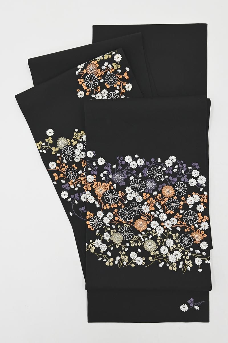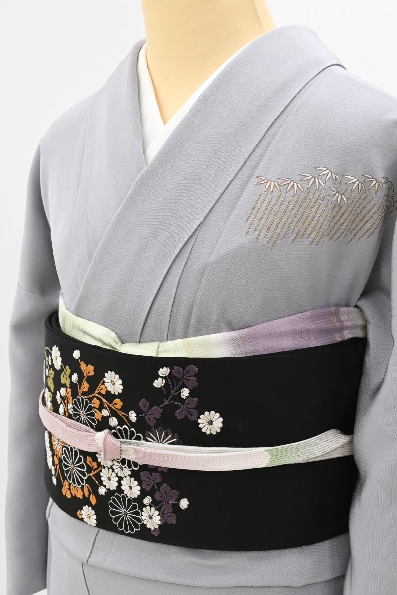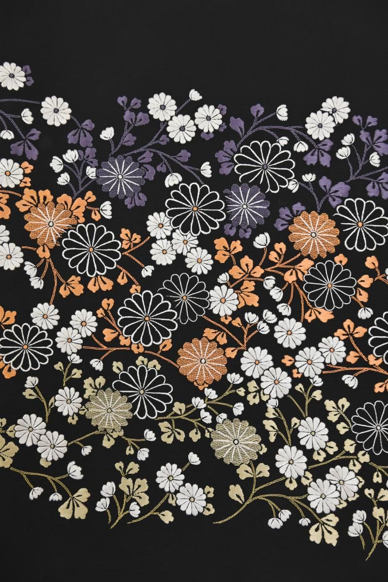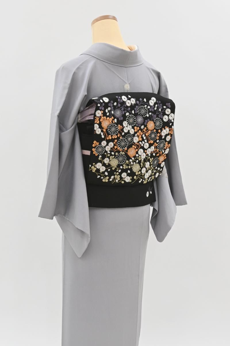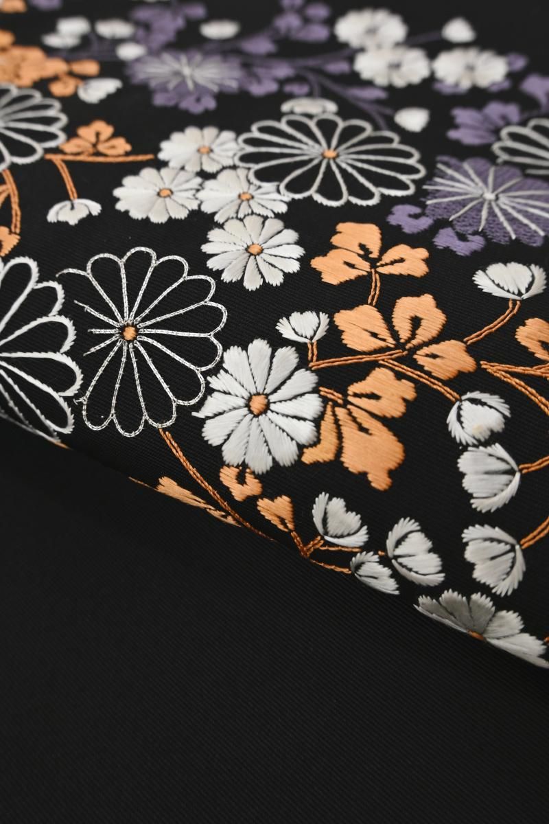 きりりとした黒色の地に、刺繍で菊の図をあしらった袋帯です。