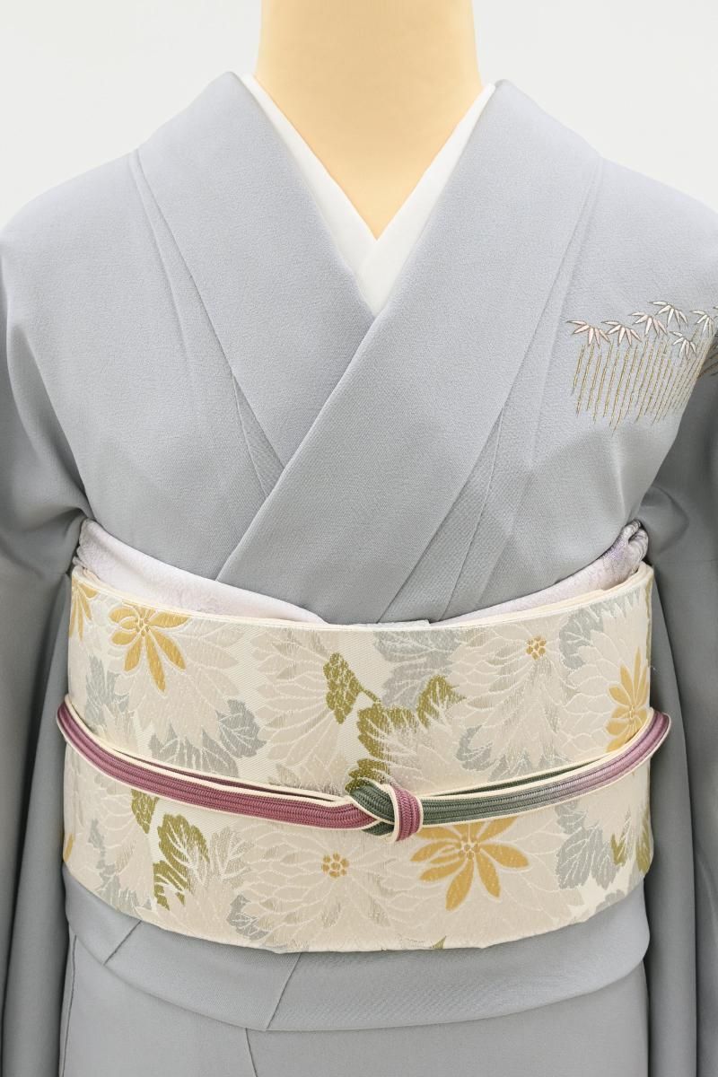 白を基調とした清々しい景色に、楚々とした気品が感じられるお品、甘撚りの絹糸の光沢や金銀糸の輝きが控えめな華を添えていますね。白系の帯は合わせる着物のお色目も幅広く、格高の小紋から色無地、付下げなどの装いをはんなりと引き立ててくれることと思います。これからの季節のお出かけにいかがでしょうか。