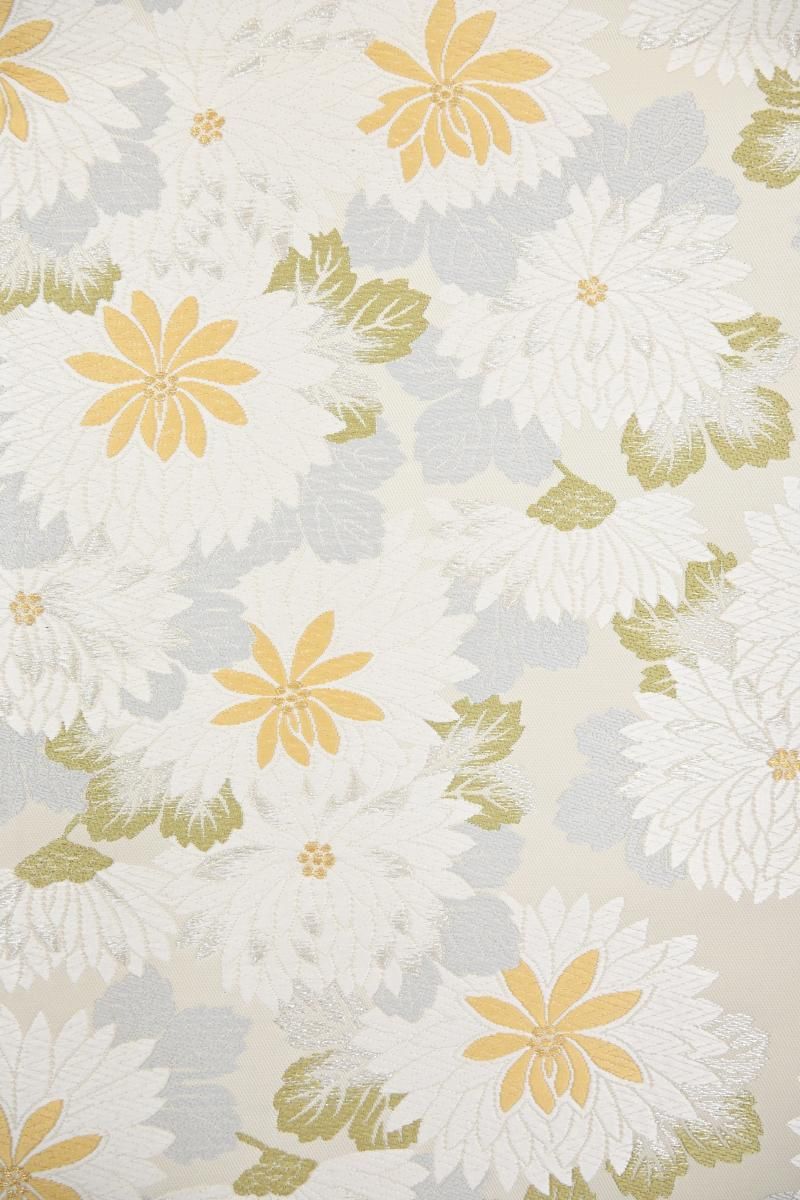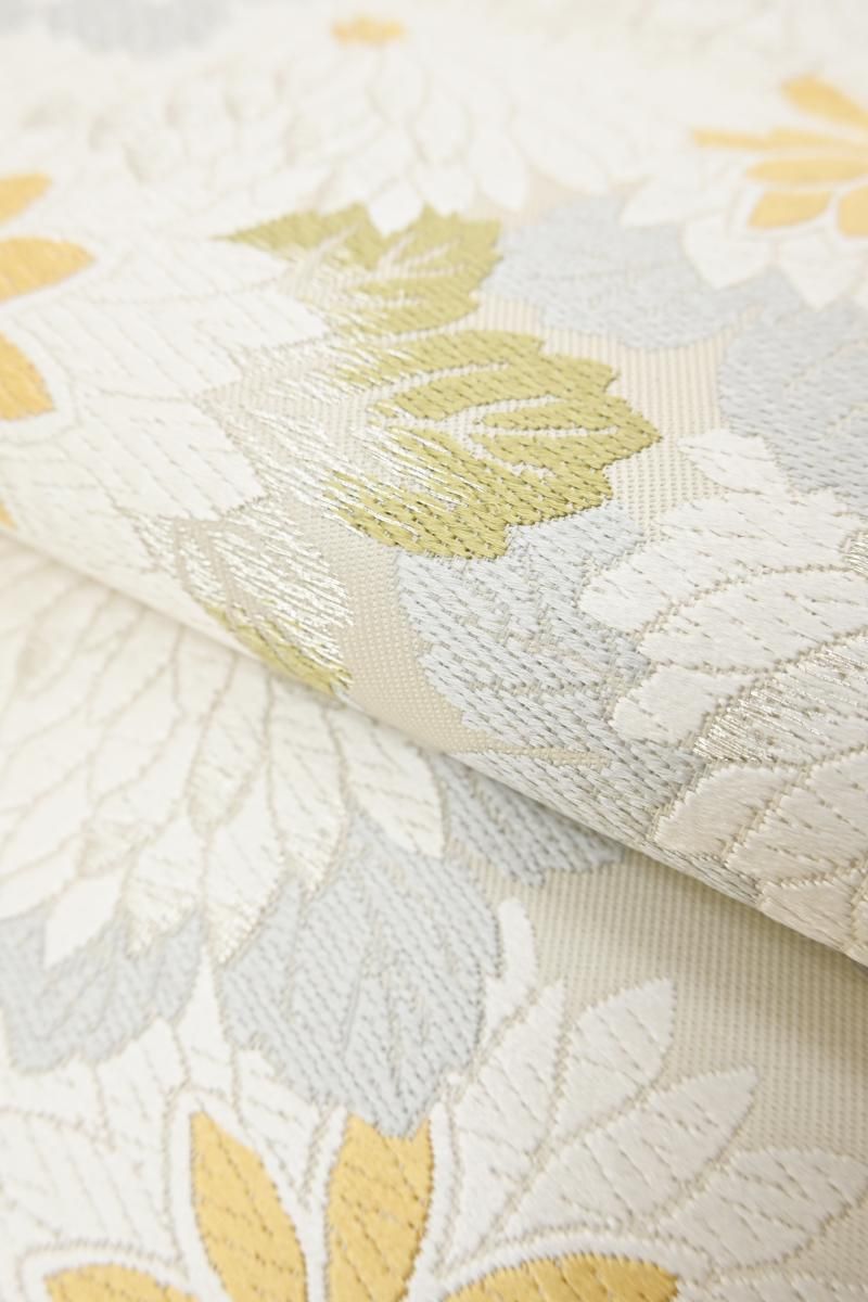 乳白色が近いでしょうか、明るいオフホワイトの地に、ややおおらかな菊の図をいっぱいに織り出した袋帯です。