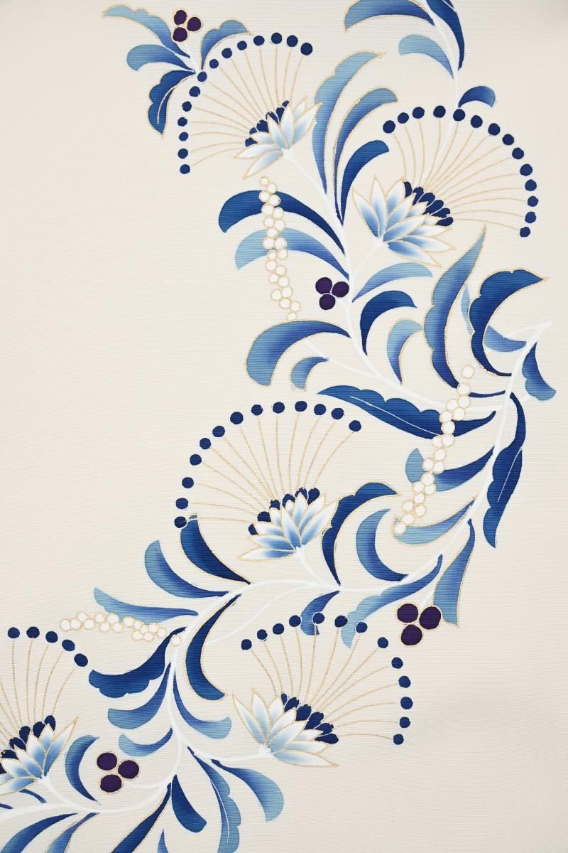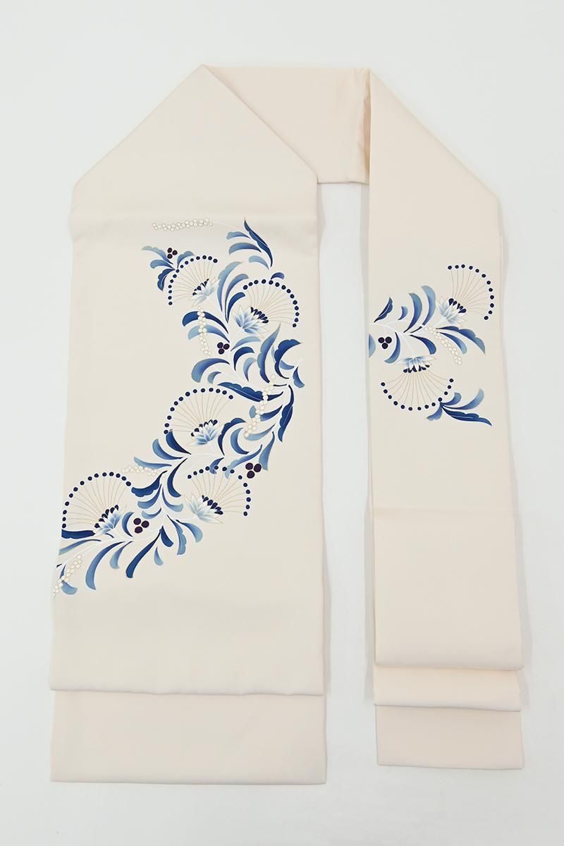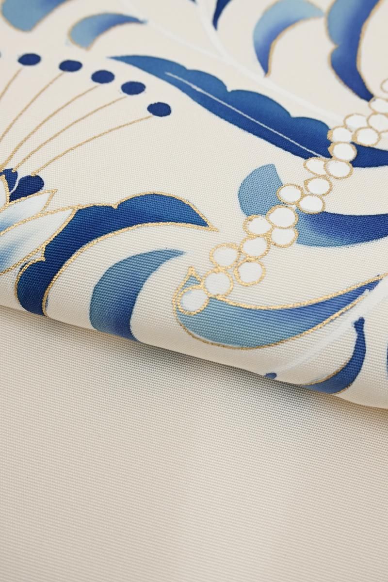 やや色を薄めた薄香色が近いでしょうか、クリームベージュの塩瀬地に、更紗文を描いた名古屋帯です。さらりとした地風の明るいお色目に、鮮やかな青の濃淡や金色を基調とした色遣いで表現されたモチーフが上品で爽やかな印象のお品、ほんのりエキゾティックな趣きで、異国情緒あふれる装いをお楽しみいただけることと思います。紬や小紋に合わせて、お友達とのお出かけやお食事会などにいかがでしょうか。