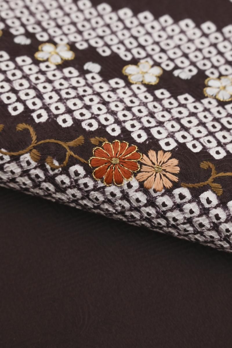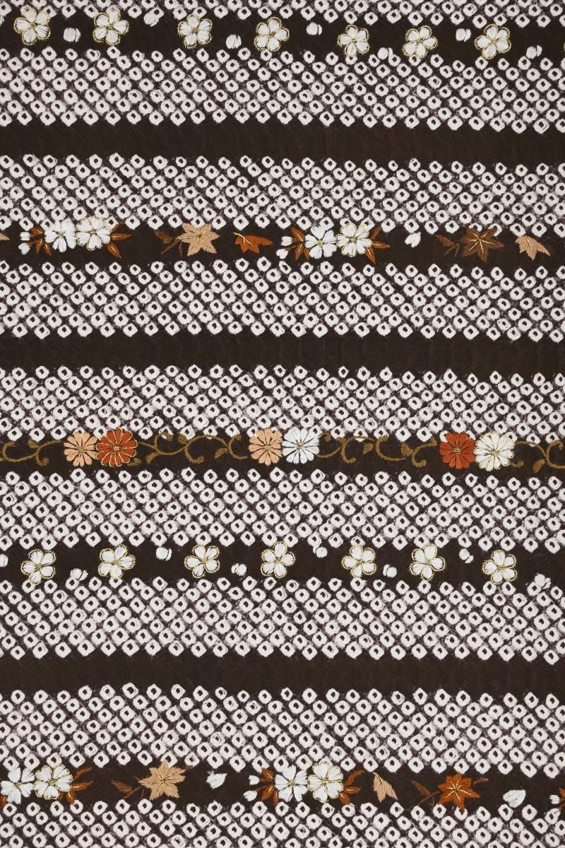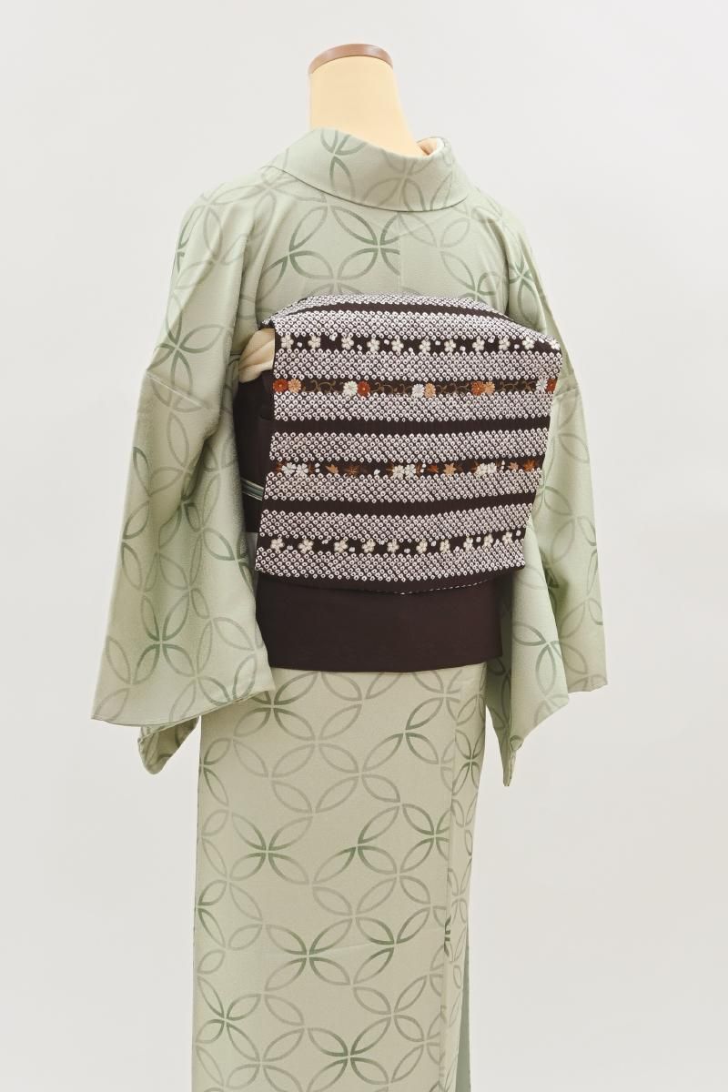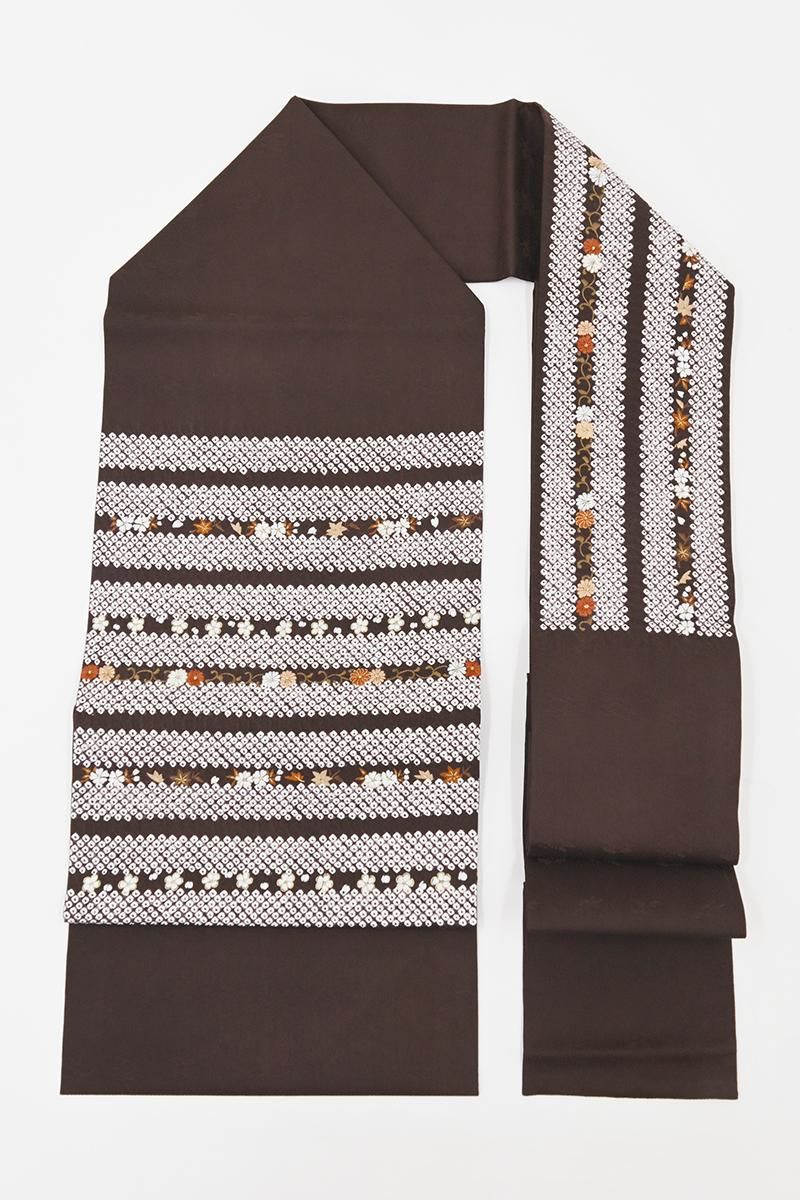 桧皮色が近いでしょうか、ごく深い赤みの焦茶色の地に絞り染めで疋田の横段を配し、重ねて繊細な刺繍で桜や楓、菊など小花の刺繍をあしらった名古屋帯です。紗綾形に花の地紋が浮かぶシックなお色目に、金糸を添えたふっくらとした刺繍の風合いがはんなりと優しい華やぎを感じさせるお品、ドレッシーな小紋や紬、色無地など様々なお着物に合わせて上品な愛らしさのある装いをお楽しみ頂けることと思います。これからの季節のお出かけにいかがでしょうか。