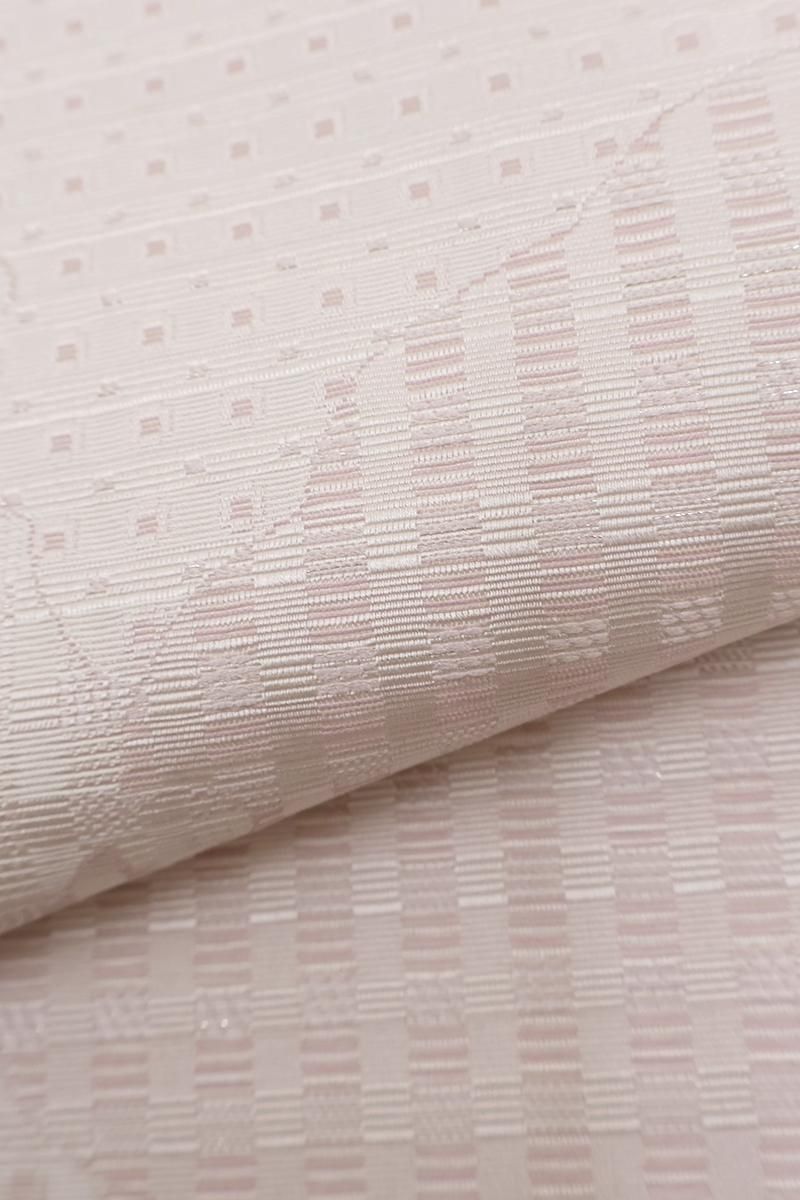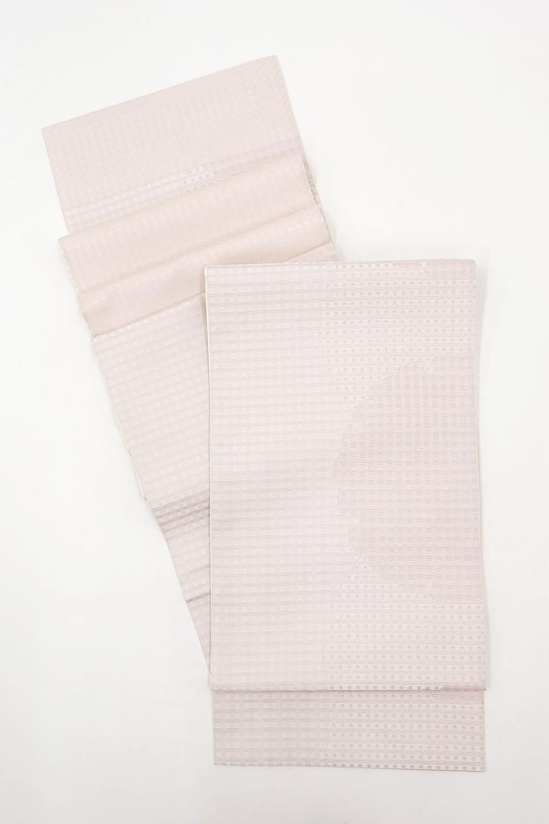 こちらは色を薄めた灰桜色が近いでしょうか、灰みの薄ピンク色の地に、格子に雪輪重ね文を織りだしたお品、細やかな銀糸のきらめきが気品を添え、すっきりと都会的な印象で装いを引き立ててくれることと思います。博多織ならではのキュッとした締め心地をお楽しみくださいませ。