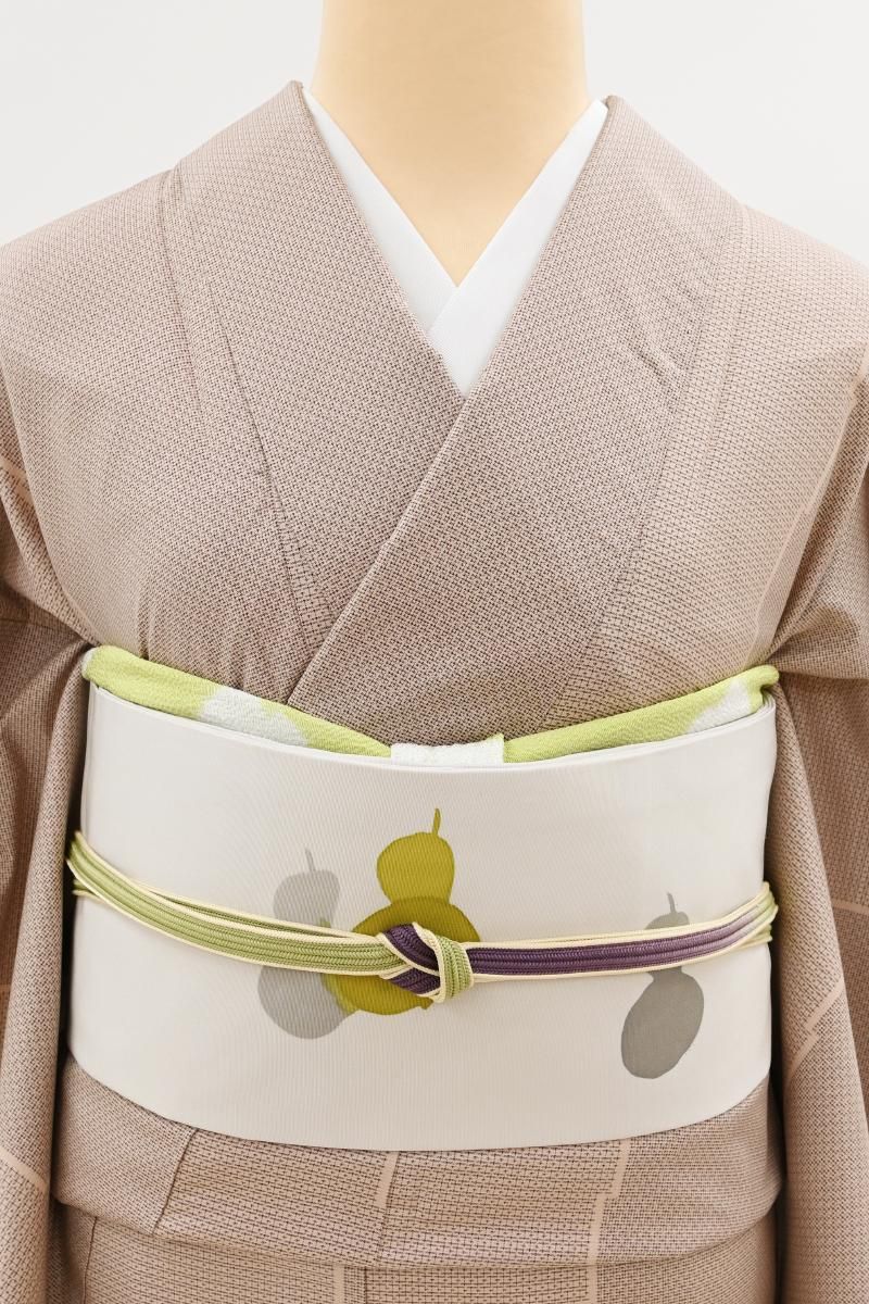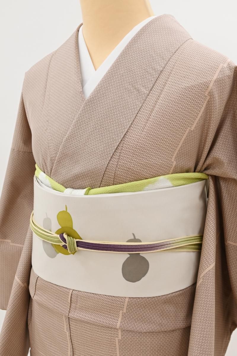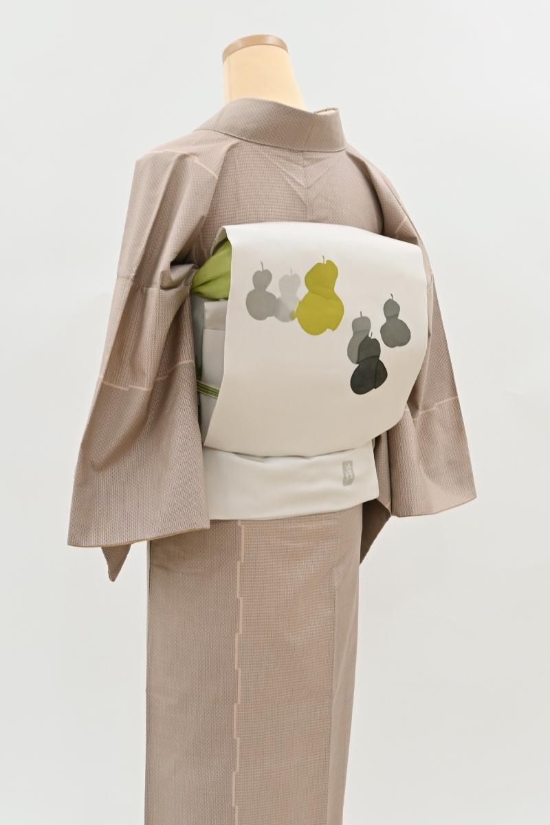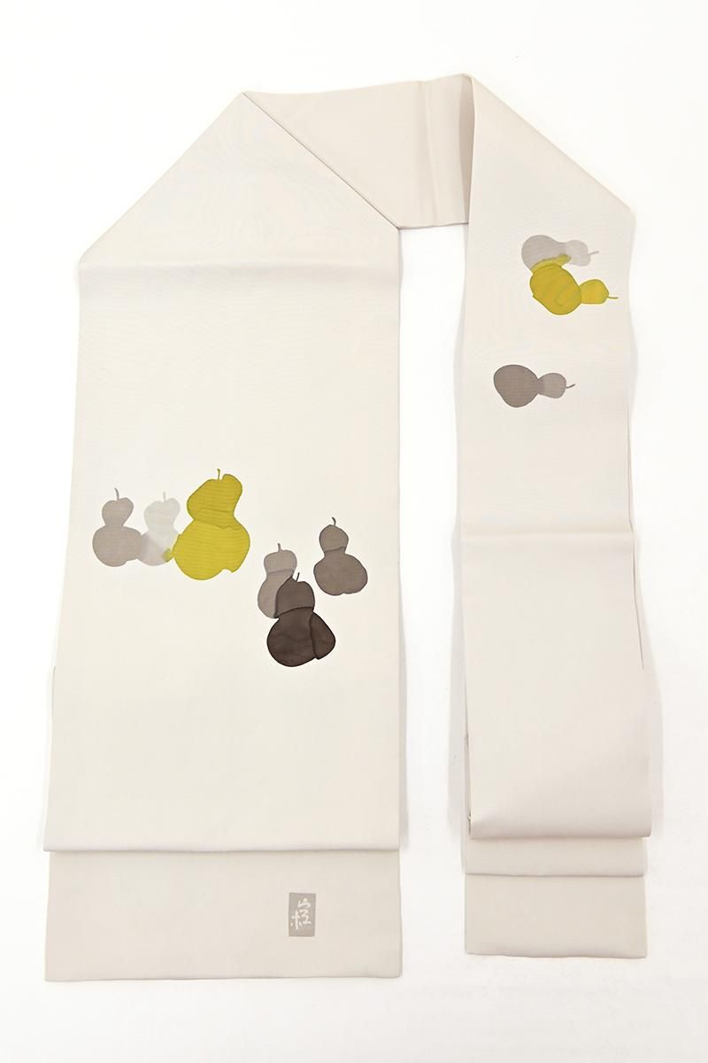 優しい中間色を生かした軽やかな意匠で独自の世界をつくる臈纈染め作家・故 高久空木さんの塩瀬地染名古屋帯です。こちらはぐっと色を薄めた灰色が近いでしょうか、ごく淡いグレージュ系の地に、ころんと愛らしい六瓢文が配されたお品、瓢箪は六つで無病(六瓢)息災と言われていることから大変縁起が良く、昔から愛されている吉祥文様です。糸目のない柔らかな描線が溶け込み、重なり合う景色が実に繊細な美しさを見せてくれますね。一見控えめながらお着物に合わせていただくと意外なほどの存在感を見せ、装いに上品な洒落みをプラスしてくれる逸品、ぜひお手元にてお試しくださいませ。