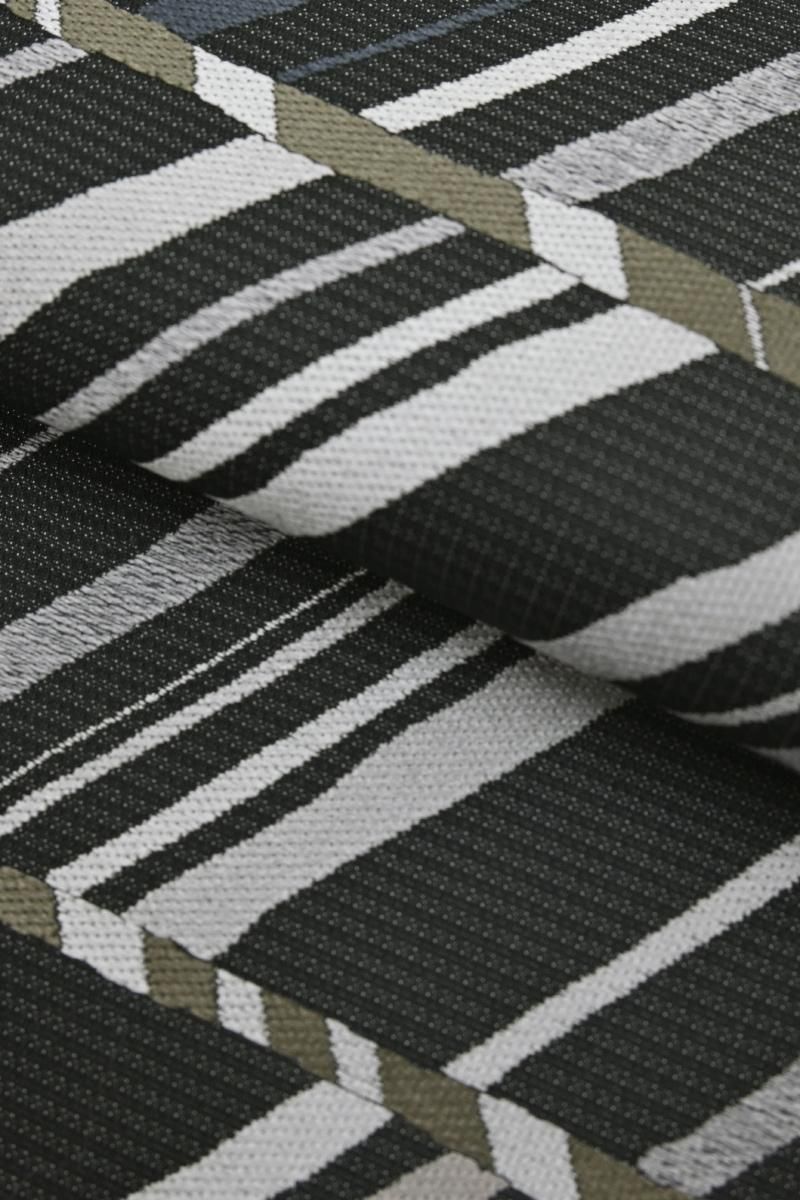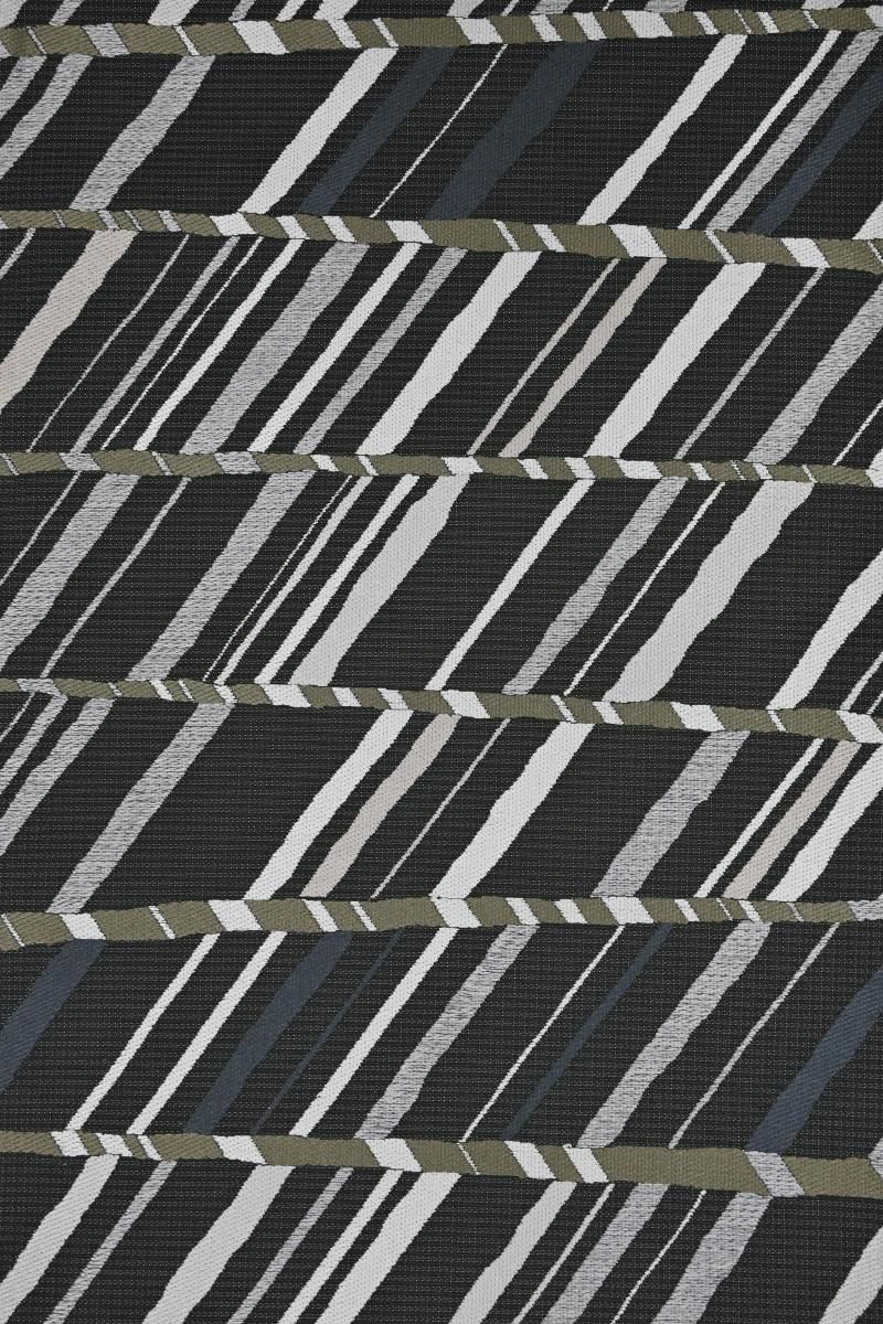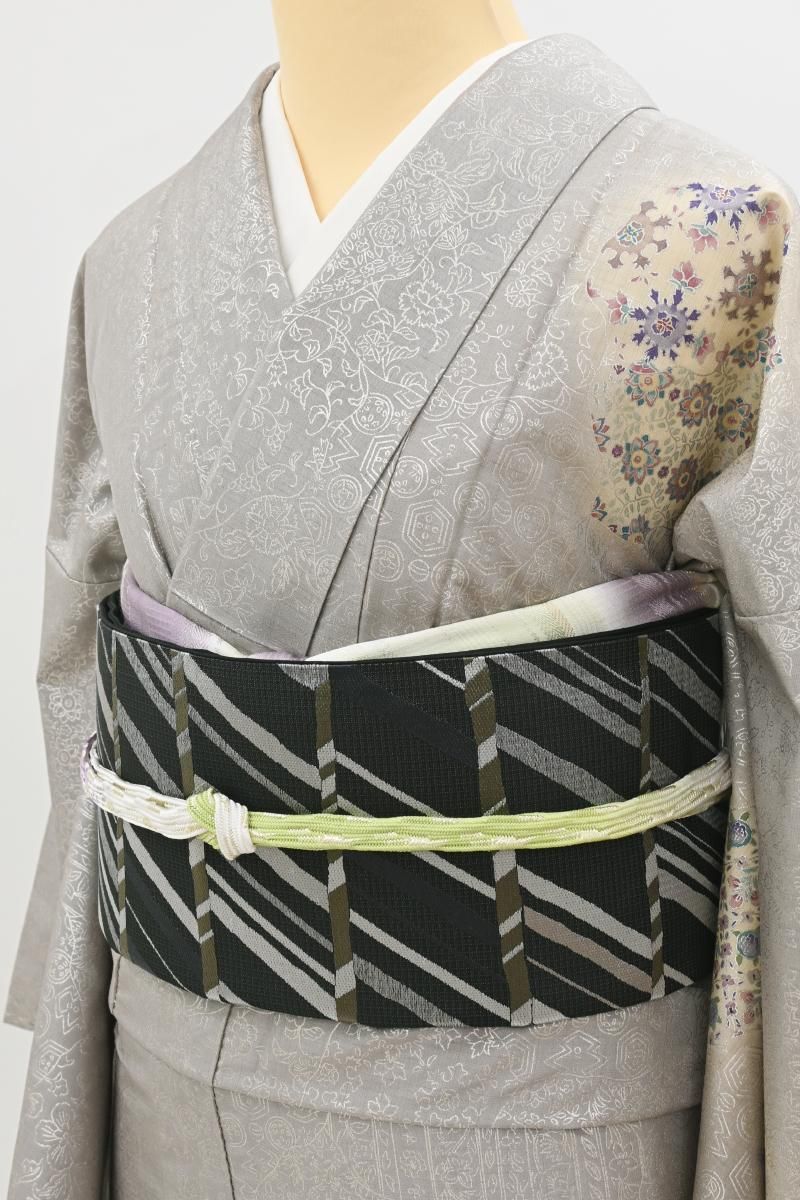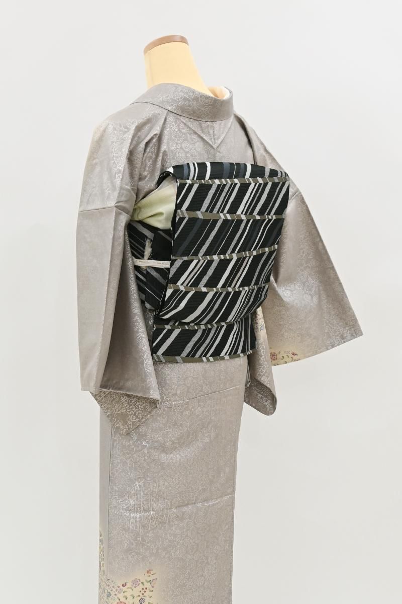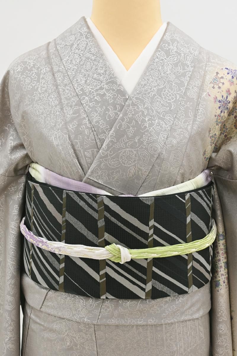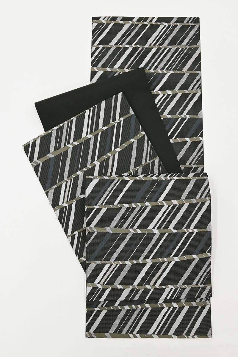 墨色の地に横段や斜め縞を組み合わせた幾何学的な文様を織り出した洒落袋帯です。