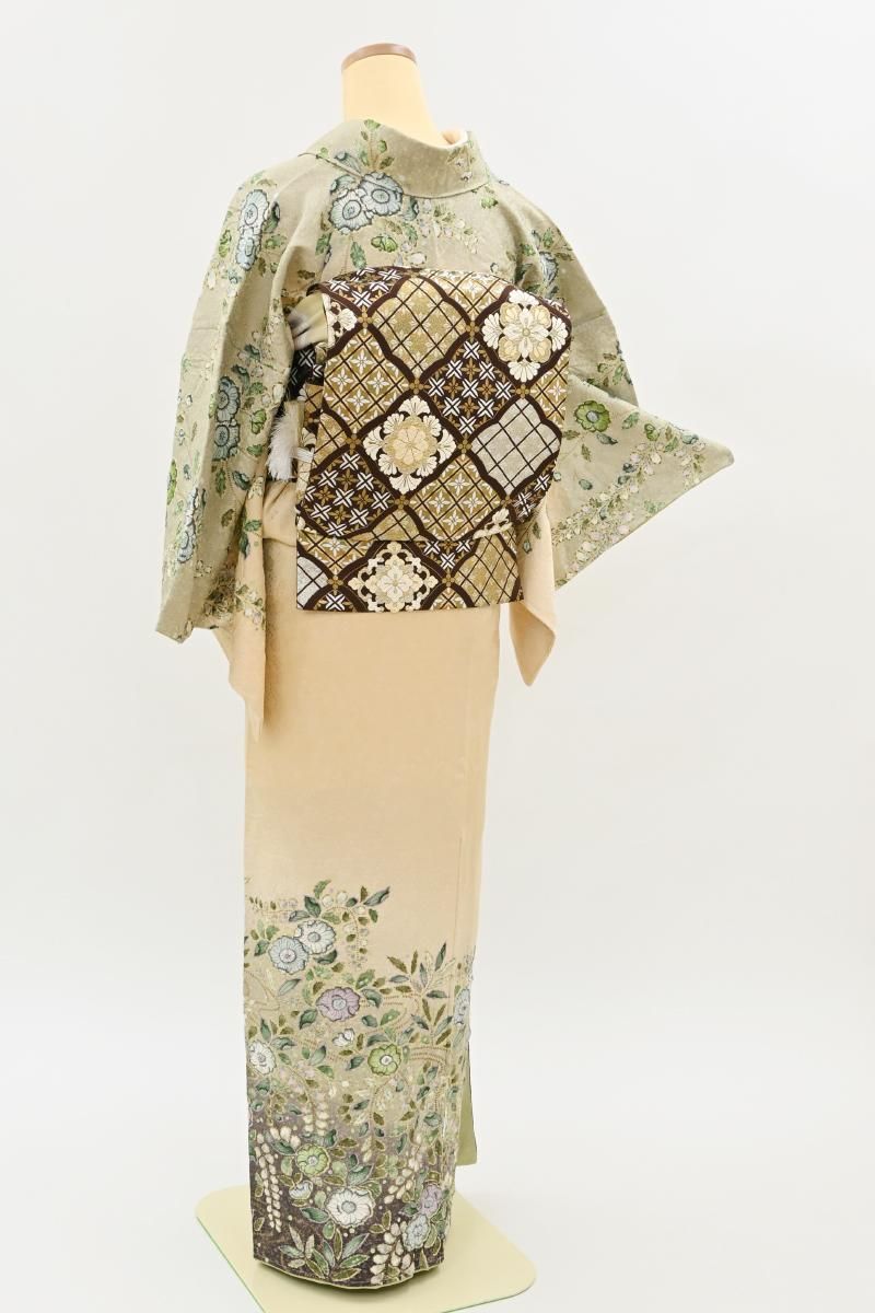 こっくりとしたイエローベージュの地に、裾と肩に深い紫と灰薄緑系の暈しを配し、重ねて辻が花文をあしらった訪問着です。