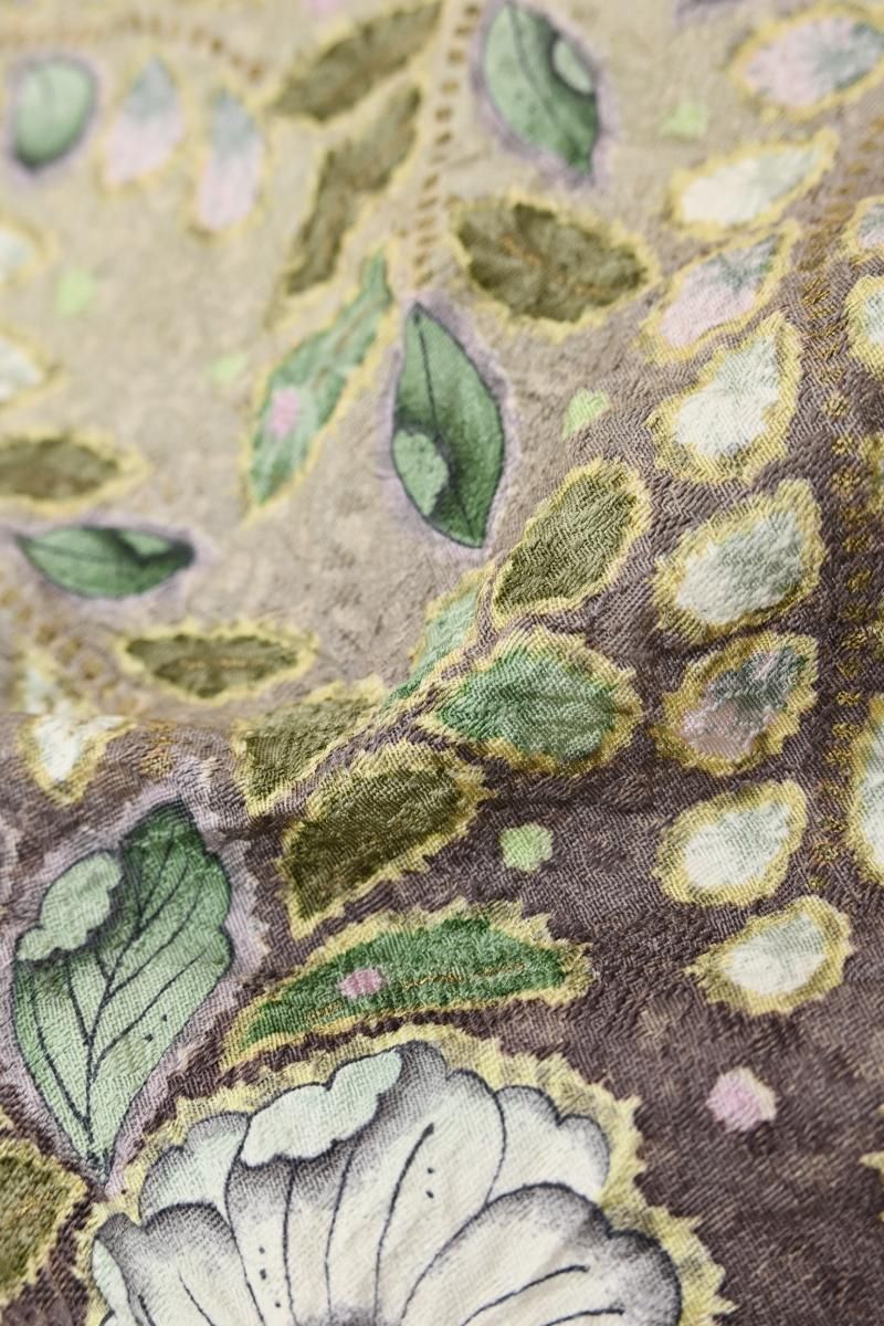 辻が花の地紋の浮かぶニュアンスある地を背景に、優雅な意匠を落ち着いた彩りで表現した一枚、絞り染めの柔らかな描線をカチンの筆が引き締め、凛とした気品香る景色を創り出していますね。お召しになる方の年齢も幅広く、お祝いのお席やパーティなどに趣深い上質な大人の装いをお楽しみいただけることと思います。