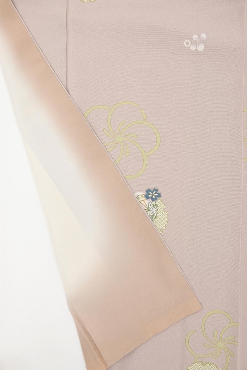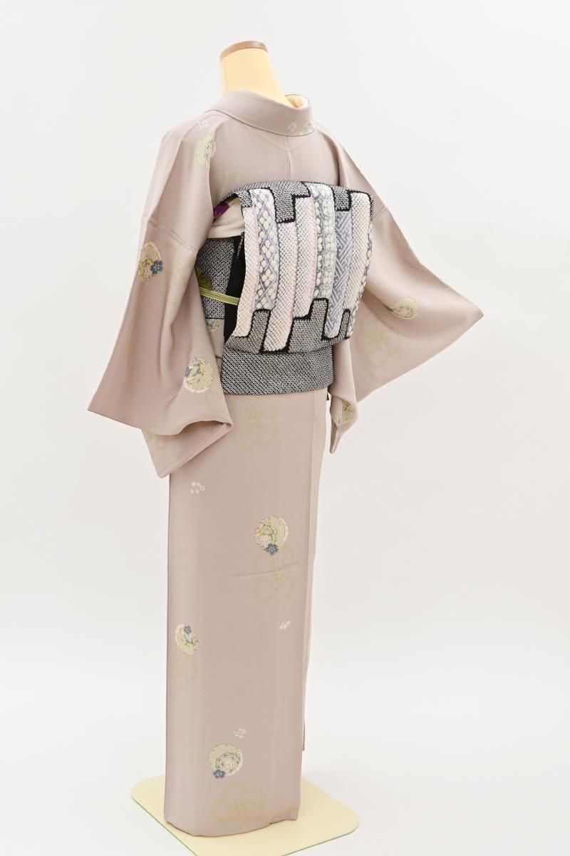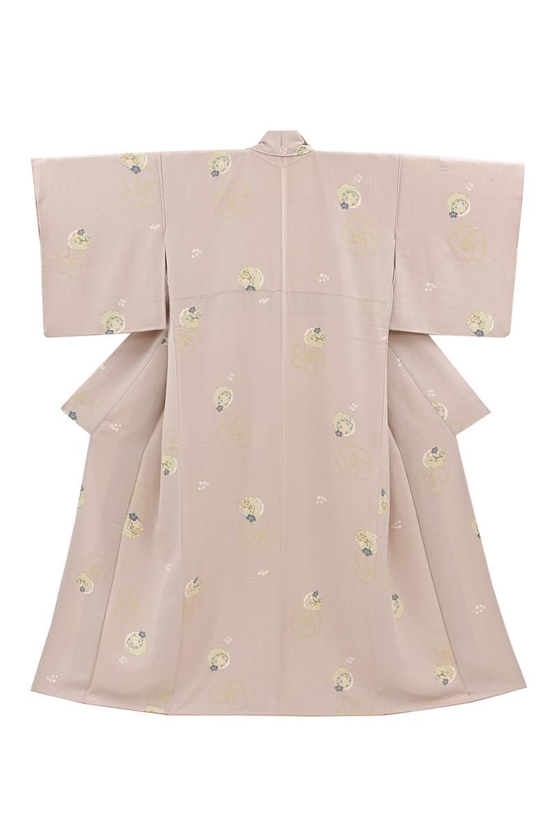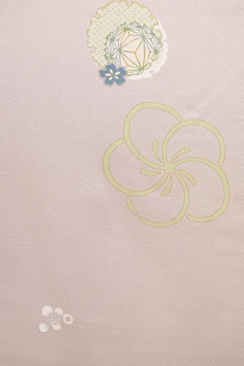 灰みの強いピンク色の地に、おおらかな捻り梅や雪輪文などを散らした小紋です。