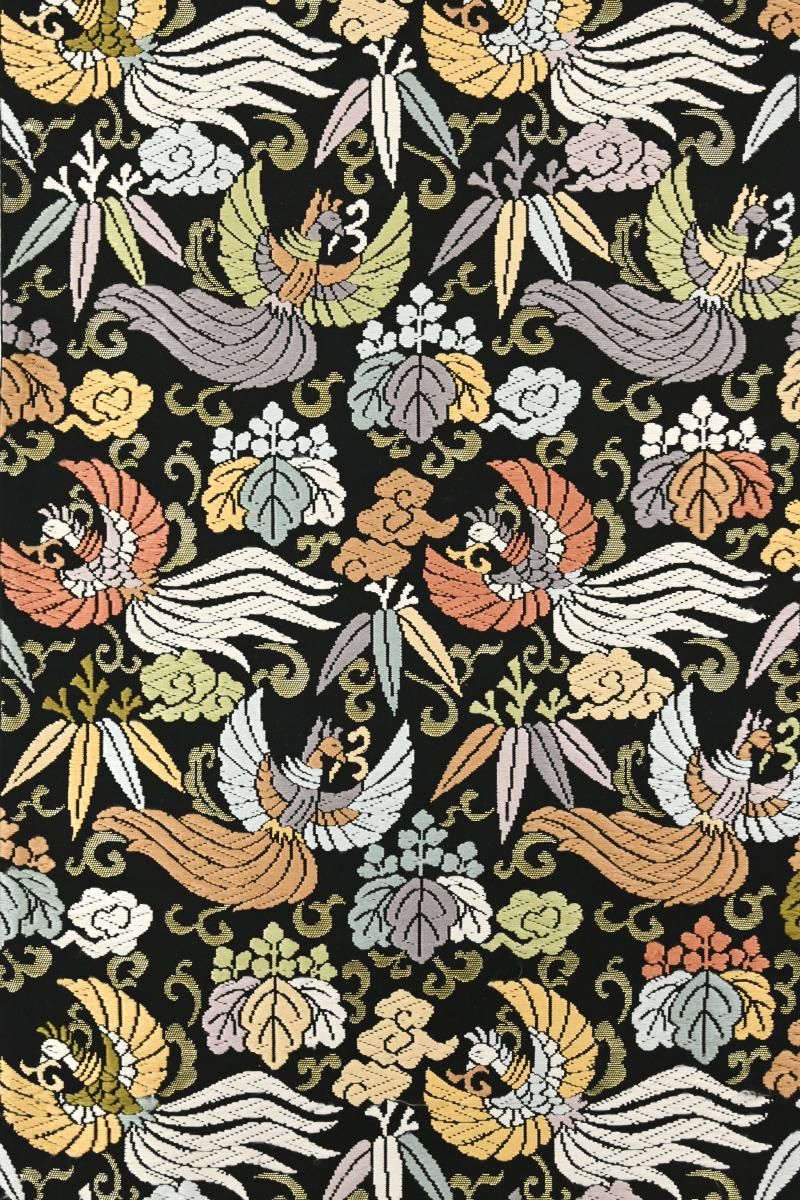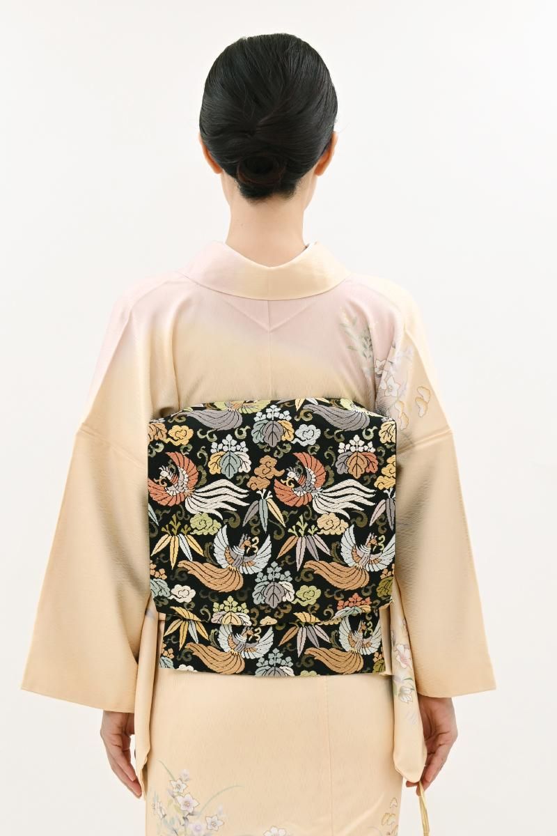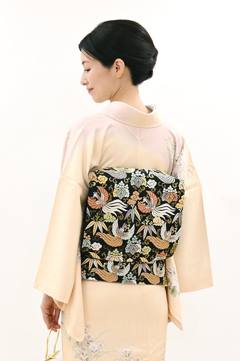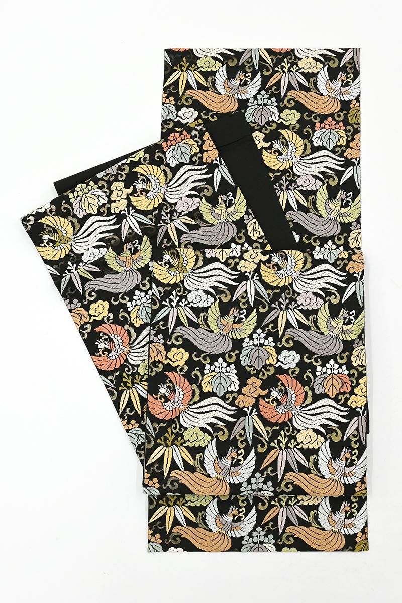 黒色の地に彩り豊かに桐竹鳳凰文を織り出した袋帯です。