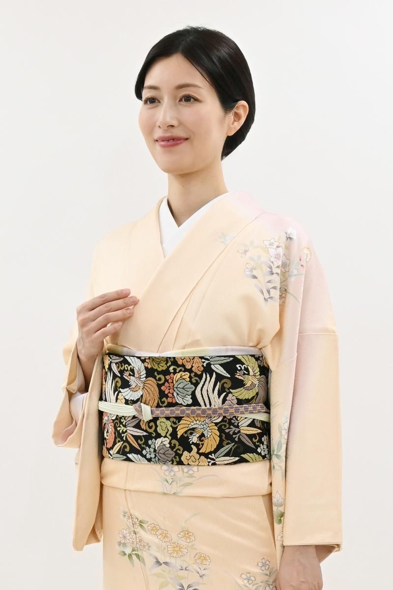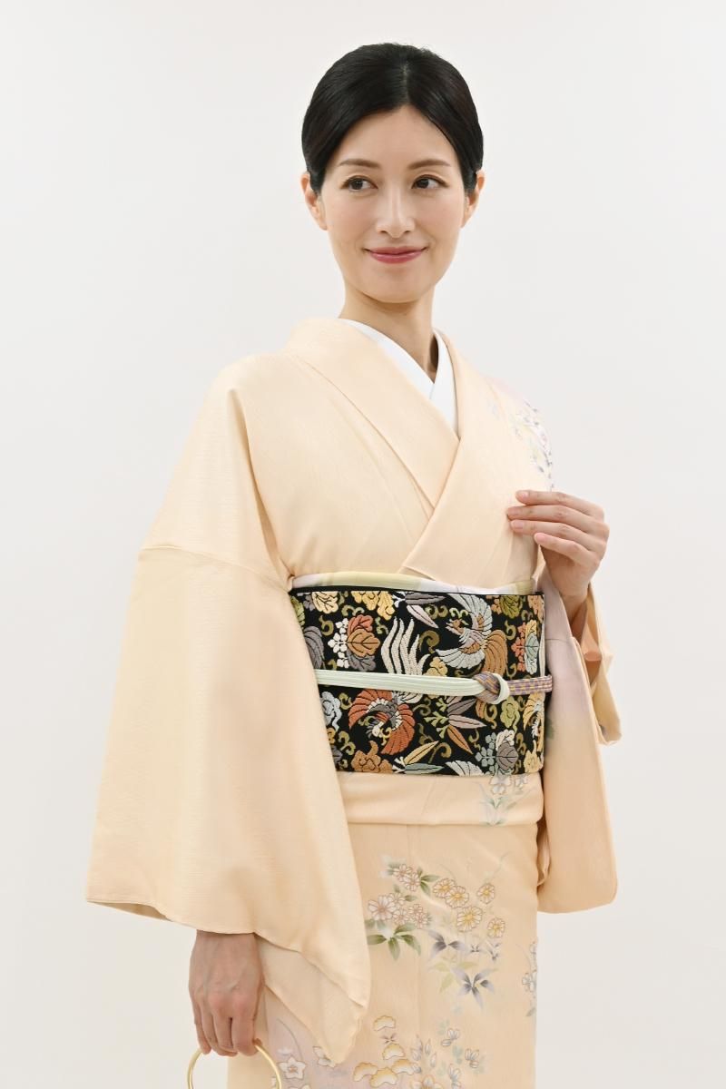 唐織ならではの甘撚りの絹糸のふっくらとした風合いと金の平箔糸のマットな輝きが調和し、陰影豊かな景色を見せるお品、フォーマルな装いに気品と格調を添え、優美に引き立ててくれることと思います。合わせる着物の色柄も幅広い一品、色無地や付下げ、訪問着などに合わせてお茶席などの改まったお席や、パーティなどにいかがでしょうか。
