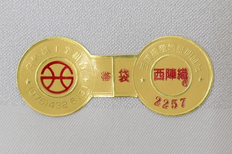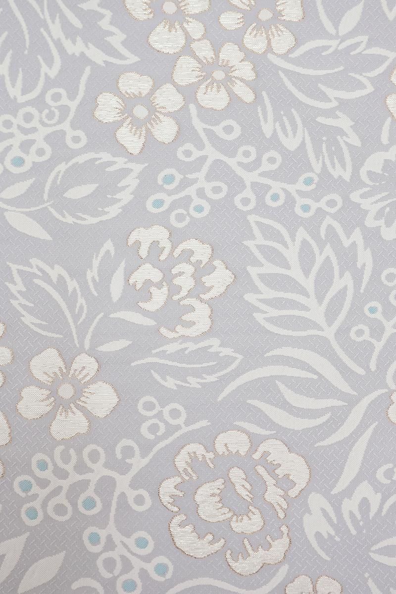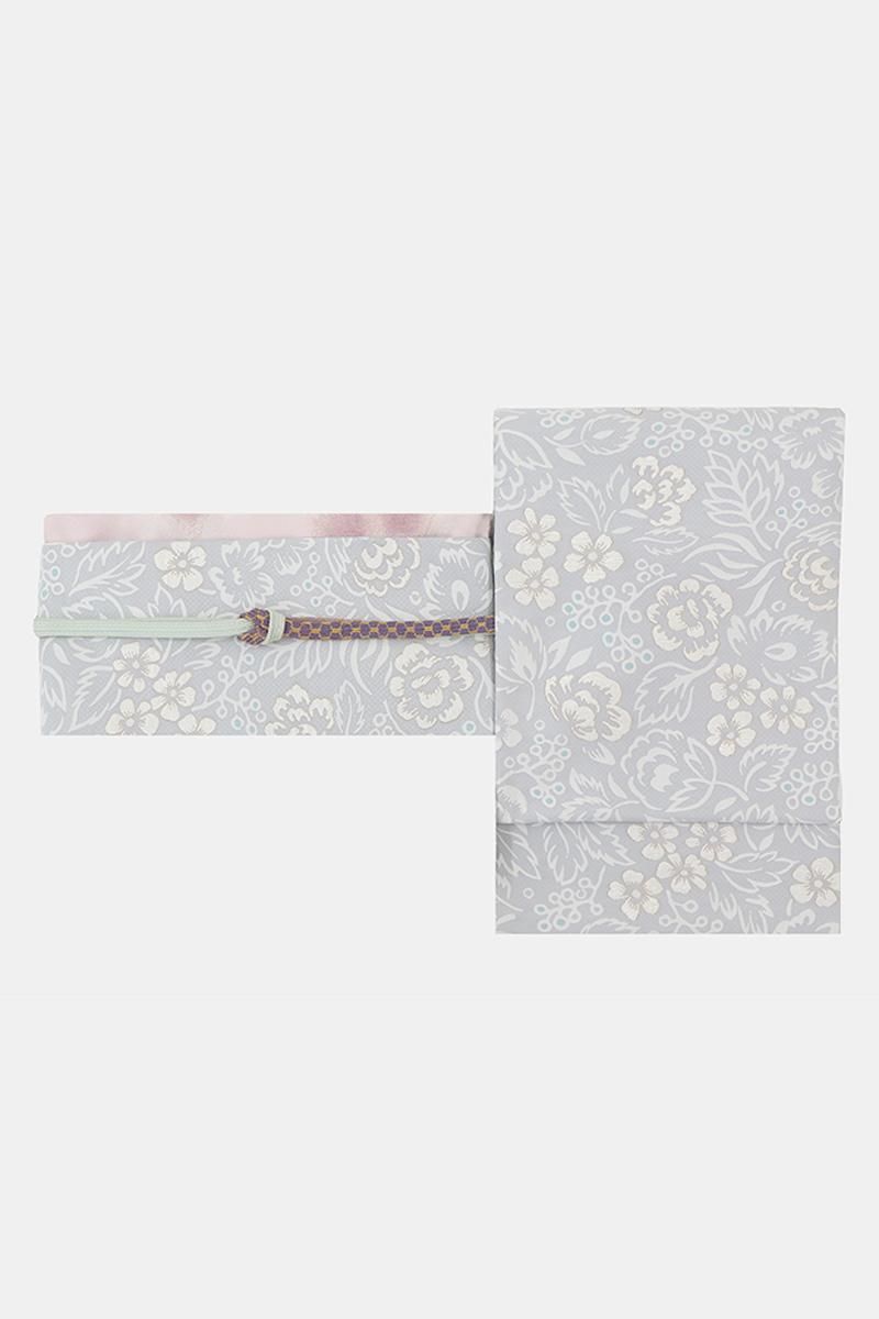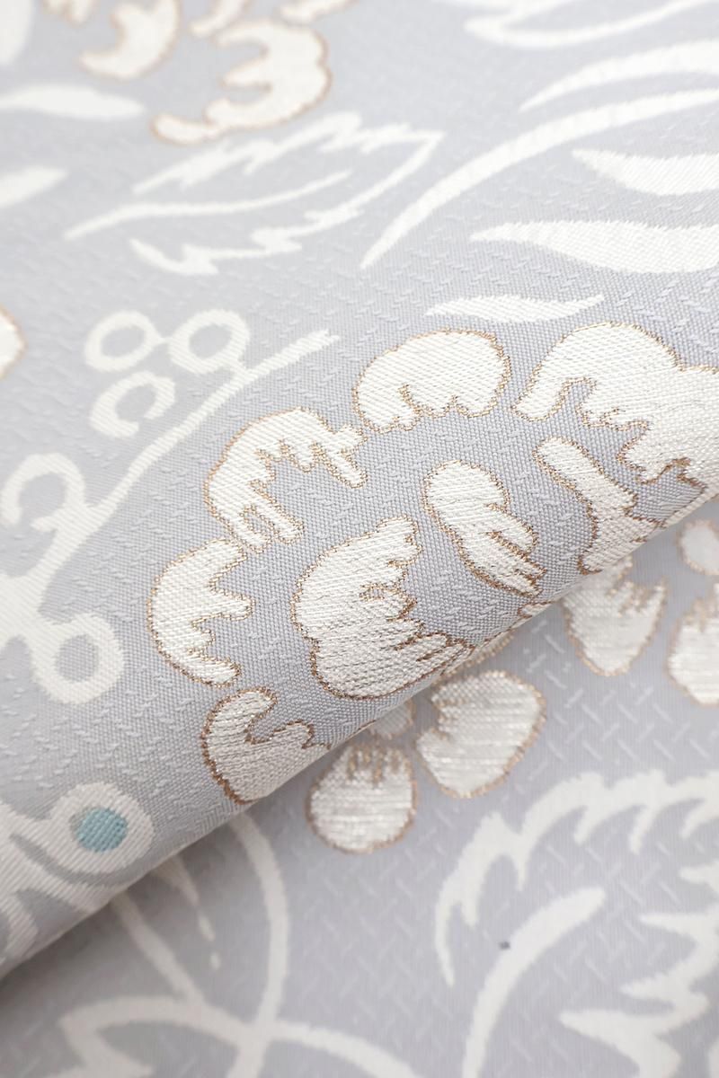 ごく明るめの灰青色が近いでしょうか。細かな網代のような地模様が浮かぶ青みのライトグレーの地に、白色と銀鼠色を用いた立体感のあるふくれ織りで、モダンに図案化された花唐草文様が表現された袋帯「花しらべ」です。絹糸そのものの光沢を生かした織りに、ほっそりとした縁取りの金糸や細く絡めた銀糸の煌めきが、清々しい華を添えるお品。エキゾチックで軽やかなモチーフや優しい彩りが、装いに上品な甘さを運んでくれそうですね。こちらは古典を基調としながらも現代の空間に映えるモダンな帯作りで定評のある西陣 織楽浅野さんの作。色数を抑えたシンプルな構成に織楽浅野さんらしい洗練と洒落みが光る優品です。ドレッシーな紬から小紋、軽めの付下げなど幅広い装いに合わせて、様々な場面でお楽しみくださいませ。