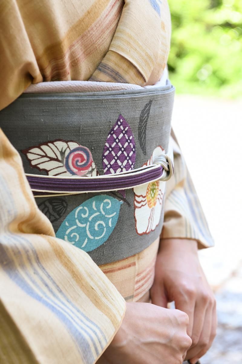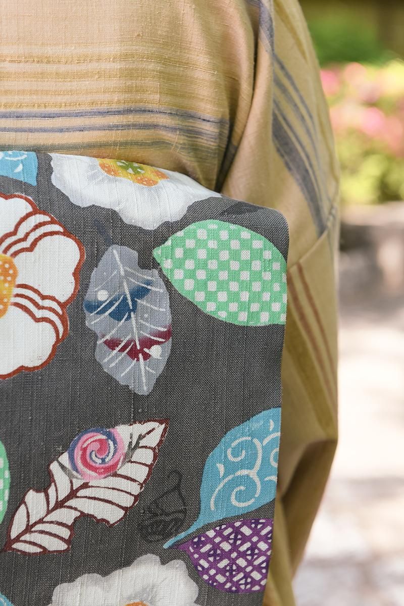 明度を上げた墨色が近いでしょうか、落ち着いたグレイの紬地に満開のシャラノキの花と共に葉っぱやカタツムリ、どんぐりなどが並べられた型絵染の名古屋帯です。「沙羅樹」と銘されたお品、シックな地色から白や水色、杜若色や若竹色など、それぞれ主張のある彩りが様々なモチーフと共に浮かび上がり、輪郭のはっきりとした個性が帯からあふれんばかりに輝いていますね。沙羅といえば初夏の花とされていますが、さっくりとした地風に加え、どんぐりも添えられていますので、袷時期から単衣の頃まで長くお使いいただけるかと存じます。こちらは柳悦孝さんや柚木沙弥郎さんに師事、国展にも入賞を重ねる荒川眞理子さんの作品。型絵染らしい確かな存在感が後姿を印象的に引き立ててくれる一点ですね。ちからのある明朗な色構成にほんのりと滲む、荒川さんらしい上品な可愛らしさが、見る人の心をほっと和ませてくれることと思います。ほっこりとした紬や木綿から光沢のあるドレッシーな織りなど様々な着物と共に、作り手の個性が光る素敵なカジュアルスタイルをお楽しみ下さいませ。