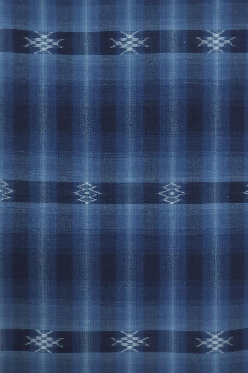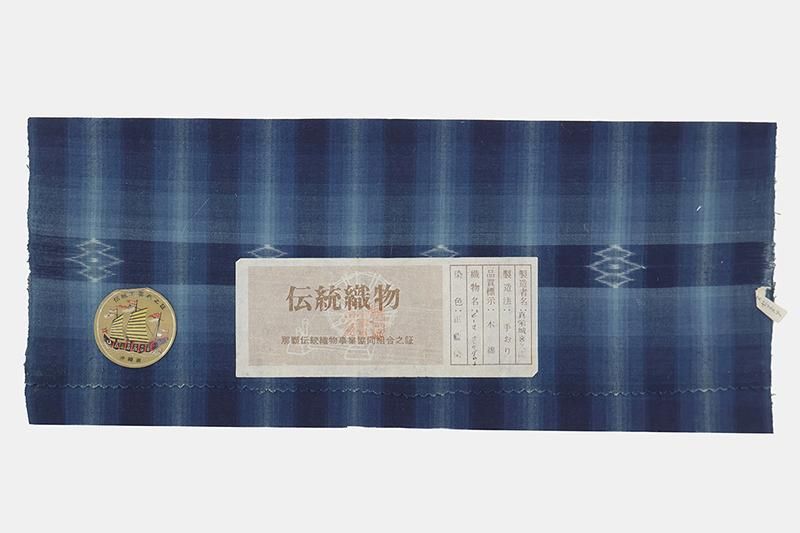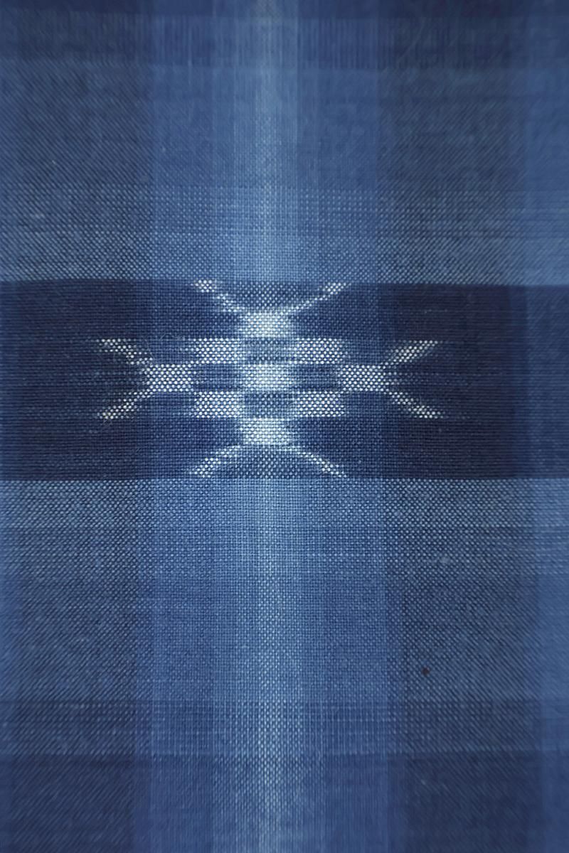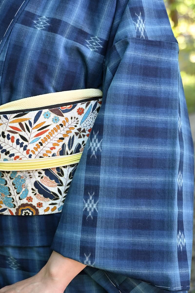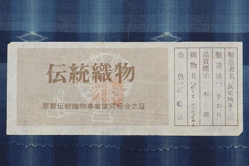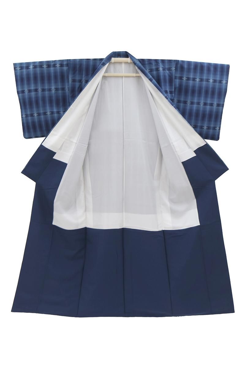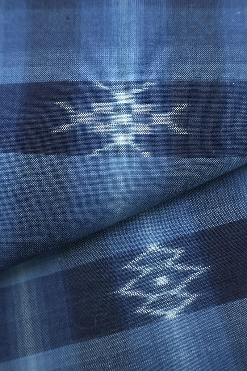 深々として透明感のある藍の色が見事な「琉球美絣」の木綿着物です。こちらは日本工芸会正会員として極めて美しい作品の数々を制作なさった真栄城喜久江さんの作。夫 興盛さんと共に「本物」だけを守り続けたいという信念に基づき、自ら藍を育て泥藍をつくるところから始まる手間暇を惜しまぬ丹念なお仕事を重ねることで、琉球美絣という新たな織りの世界を創り上げた方。心洗われるような清々しい藍のいろは、真栄城家の藍への惜しみ無い愛情の賜物ですね。こちらは藍の濃淡の縞と美しいグラデーションの横段が作る格子を背景に、2種類の絣がそれぞれの横段に並べられたお品。琉球美絣ならではの澄んだ彩りのバリエーションを駆使したモダンな景色が、これからの季節に爽やかに映えることと思います。細い上質な糸による薄手でしなやかな風合いは、秋口にはとりわけ心地良くお召し頂けそうですね。季節の染帯や工芸色豊かな織名古屋などを合わせて、上質なカジュアルスタイルをお楽しみくださいませ。