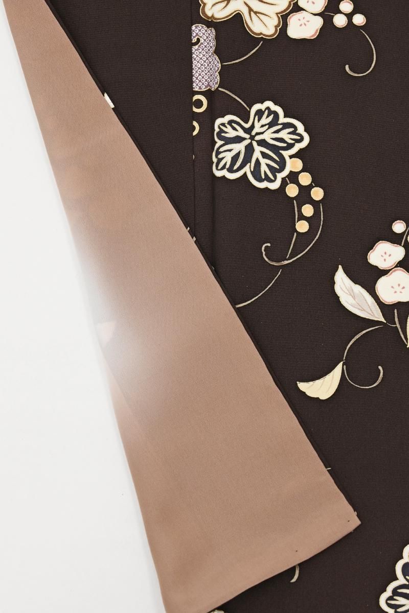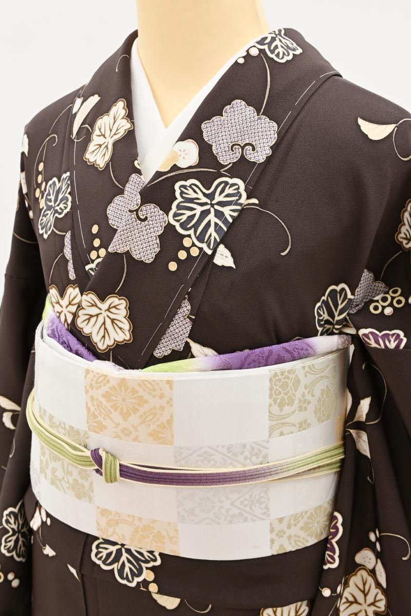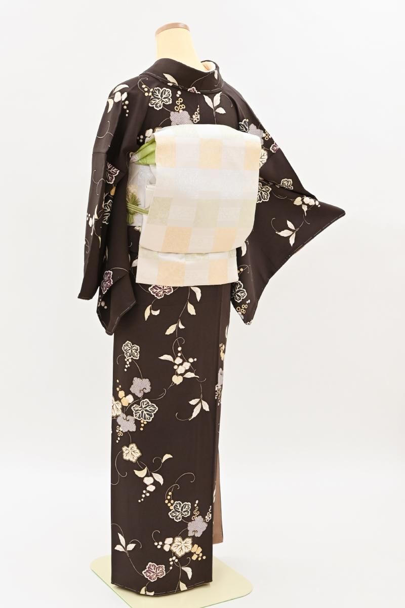 色を深めたココア色が近いでしょうか、ごく深い焦茶色の地に、おおらかに意匠化された山葡萄の図を配した小紋です。シックなお色目に、女性らしいたおやかで優美な意匠が映えるお品、さらりとあしらわれた金彩がほんのりドレッシーな印象の一枚は、染め帯はもちろんのこと洒落袋帯などを合わせてお食事会などにお召しになっても素敵ですね。秋のお出かけにいかがでしょうか。
