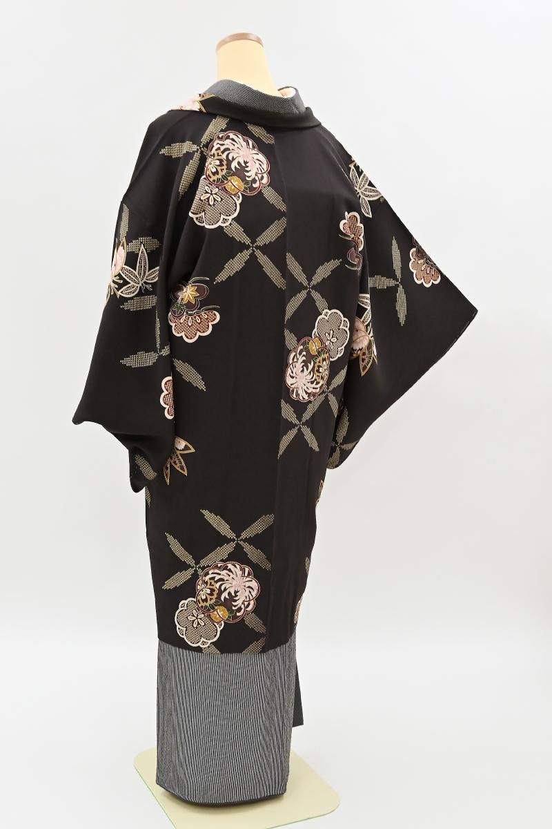 憲法色が近いでしょうか、ごく深い焦茶色の地に、松竹梅に菊などを配した羽織です。