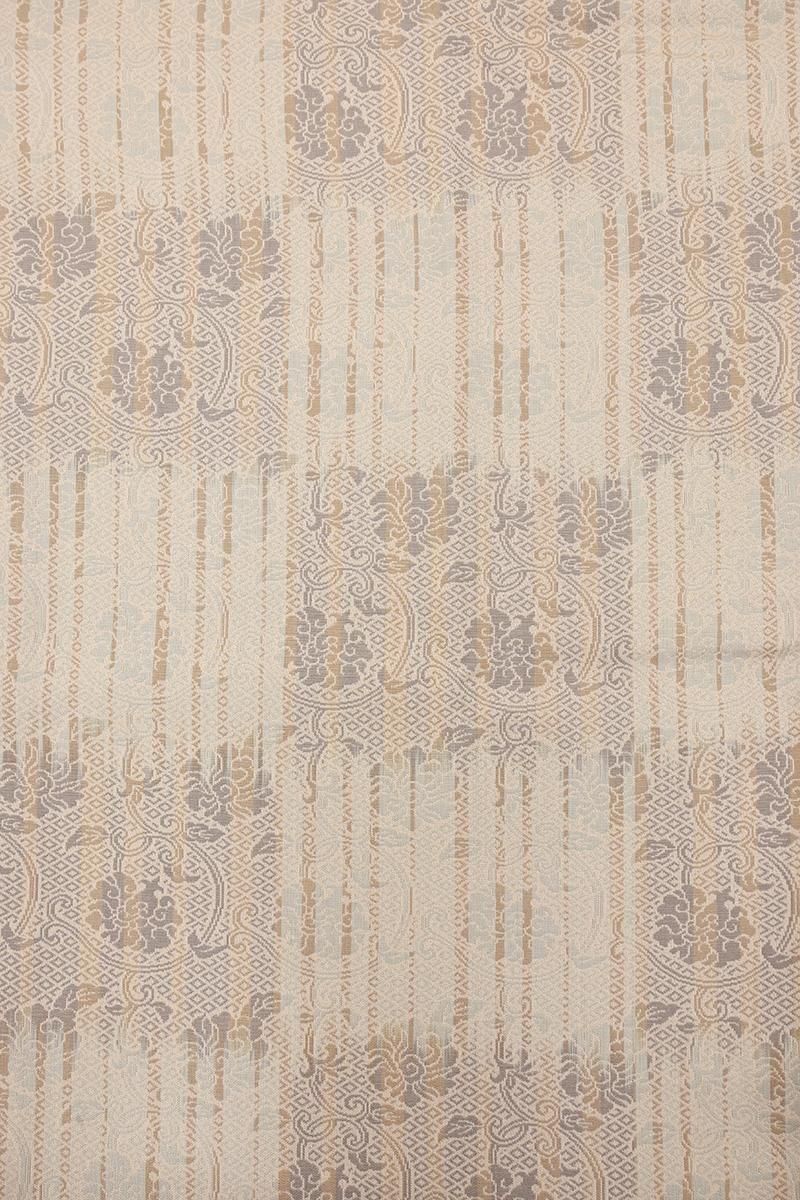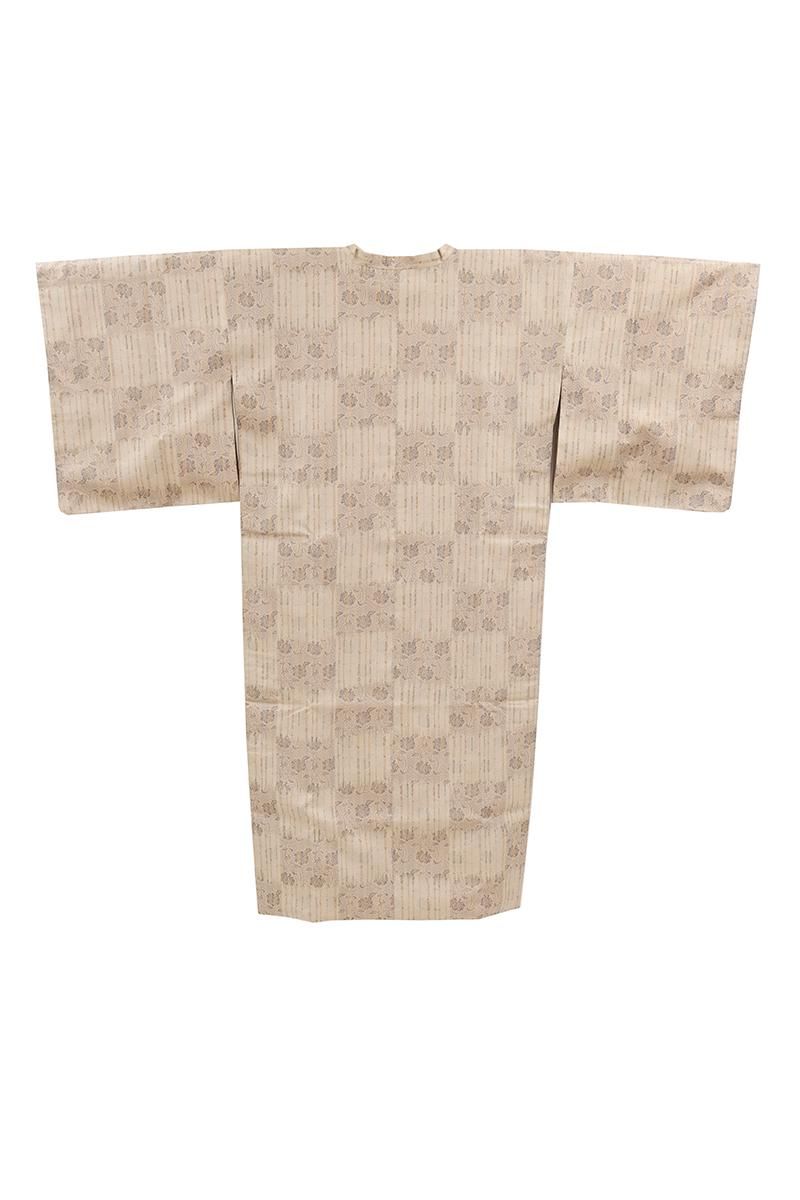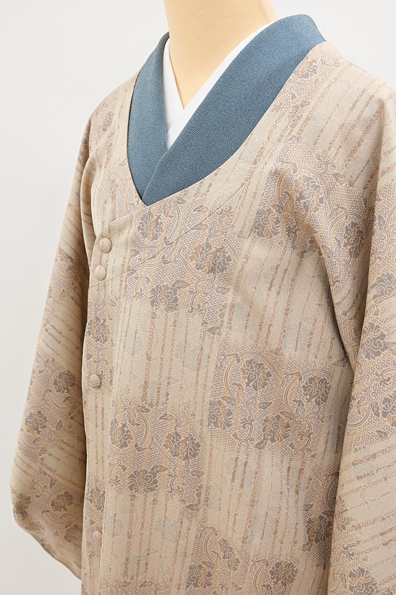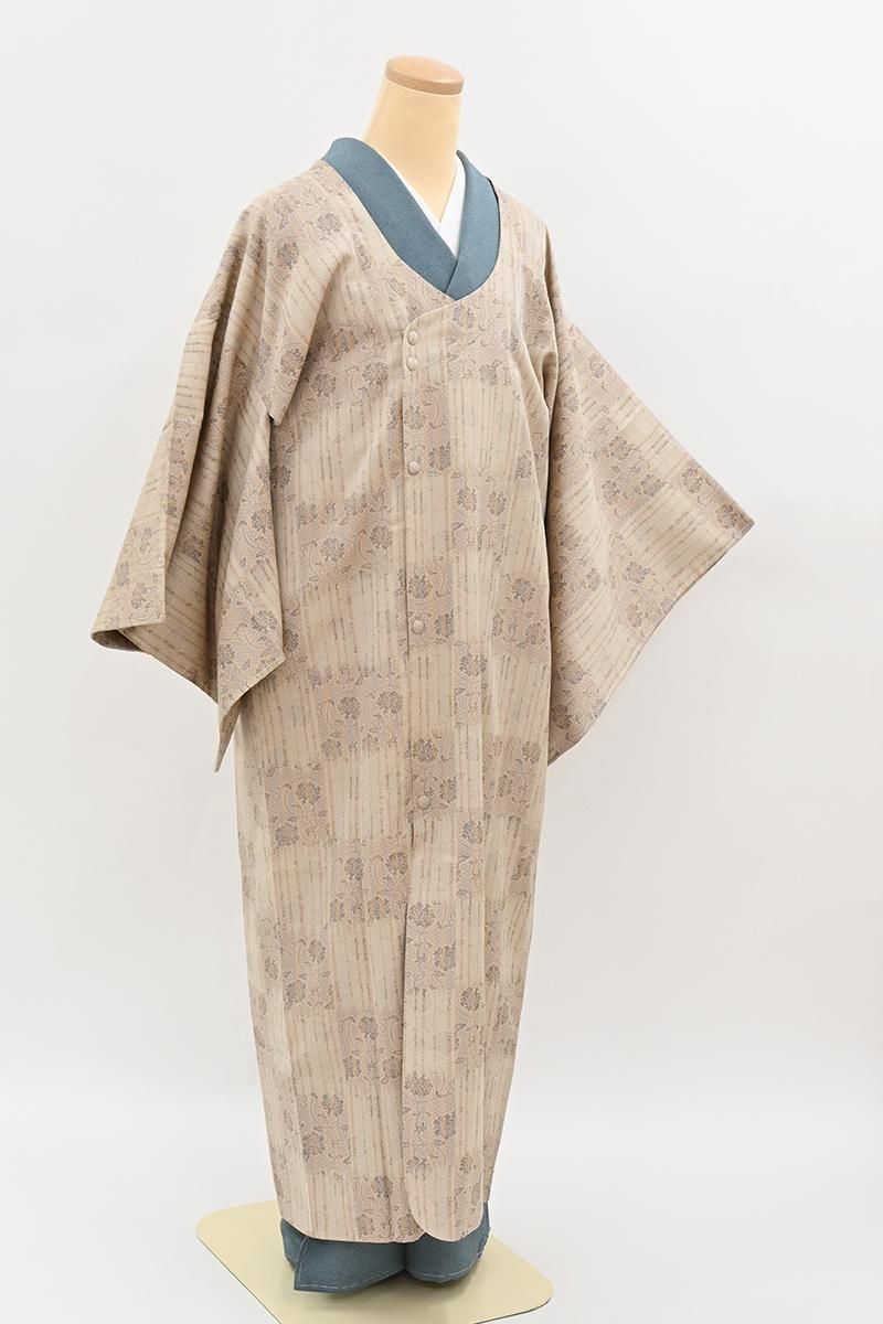全体の印象としては香色が近いでしょうか、灰みのベージュの地に、市松の形に牡丹唐草文を織り出した和装コートです。程よい張りのあるしなやかな地風が魅力の一品、女性らしい上品なお色目は合わせるお着物を選ばず、重宝にお使い頂けそうですね。大切なお着物を汚れから護るためにも一枚羽織っていただくと何かと安心なコート、この機会にいかがでしょうか。