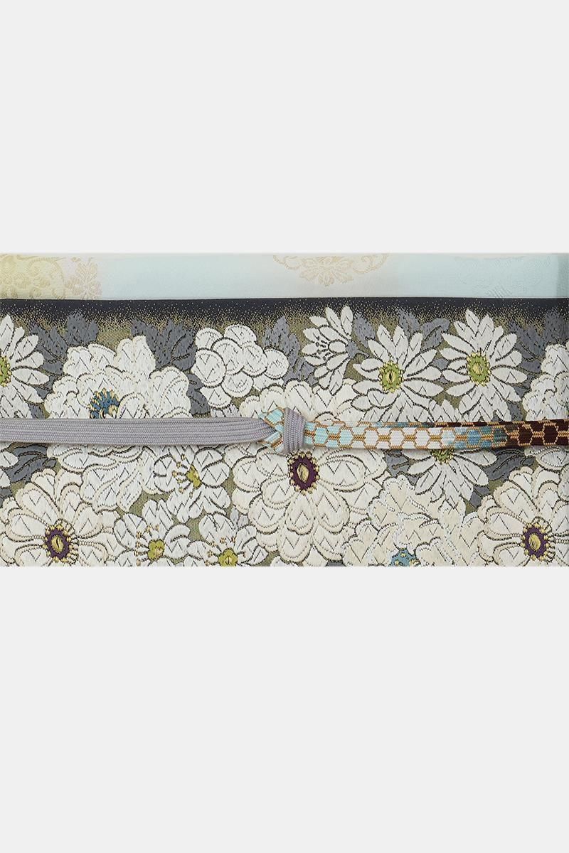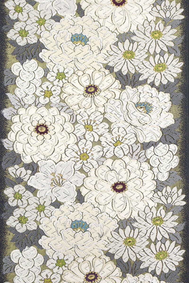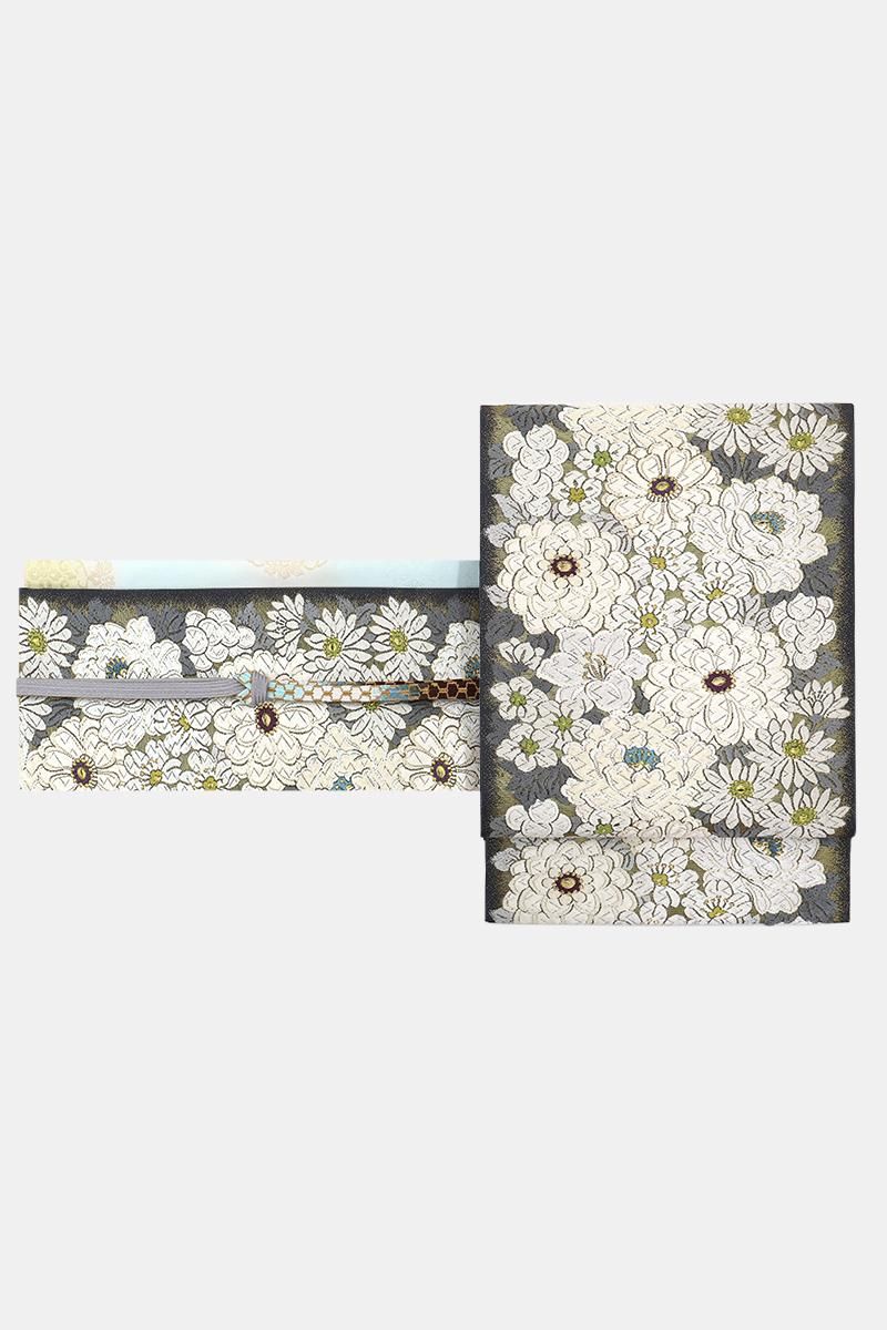 石板色が近いでしょうか。色を深めたごく暗いグレイの地に細やかな金糸を散りばめ、重ねて微かに色味の異なる二色の白糸を使い分け、菊花や薔薇、牡丹など様々な花たちを所狭しと配した袋帯です。光沢豊かな絹糸によるモチーフを刺繍のようにふっくらと表現したお品。華麗な柄構成ですが、葉にはグレイの濃淡色を、花芯には濃色や威光茶色、熨斗目色など落ち着いた鈍い彩りを置くことで、全体の印象が静かに引き締められていますね。西陣指折りの名門機屋 織文意匠鈴木さんならではの、高度な織技が光る優品。晴れやかなお席に相応しい重厚な存在感が、紋付色無地や訪問着などの社交着を、気品豊かに引き立ててくれることと思います。秋冬のお呼ばれにいかがでしょうか。
