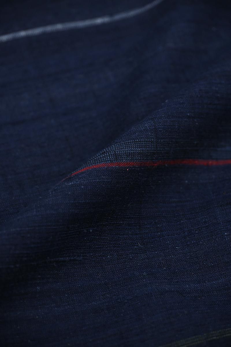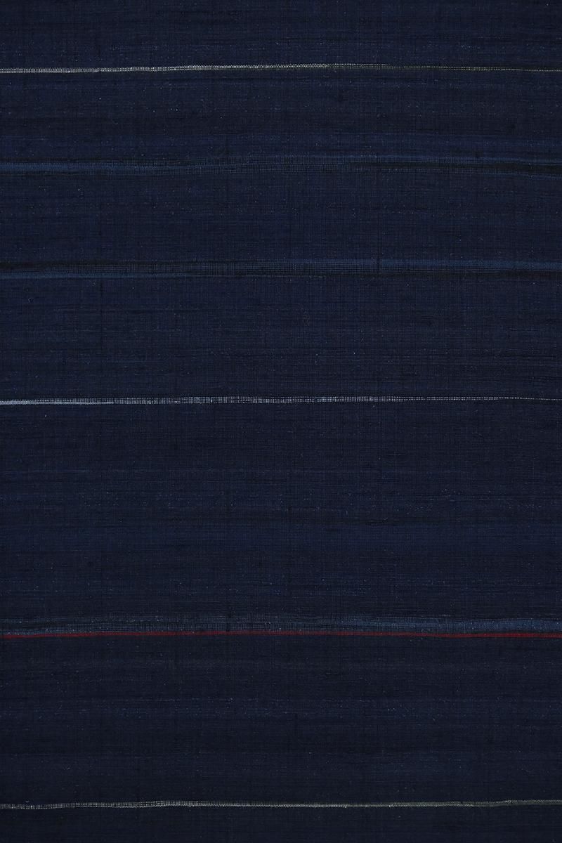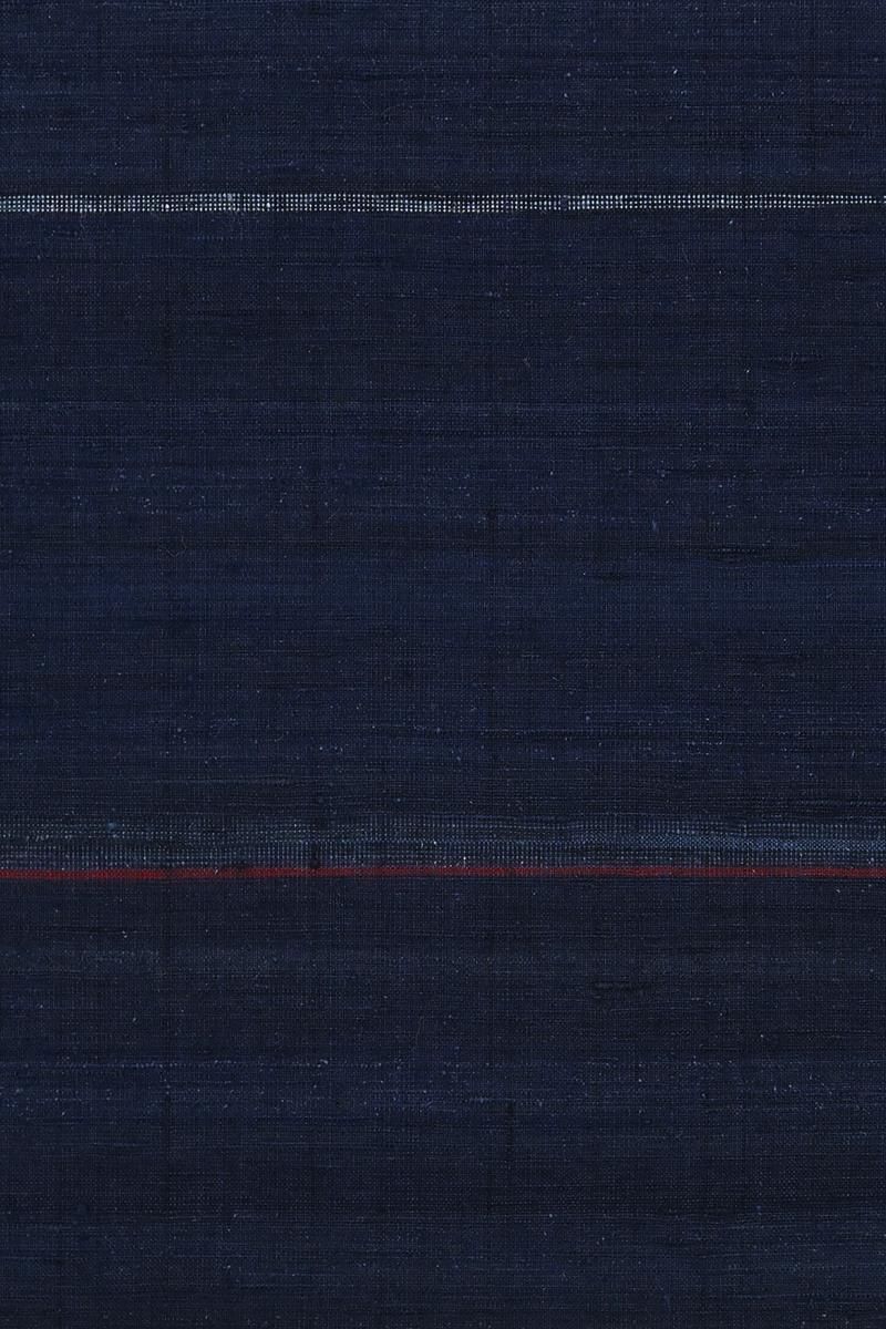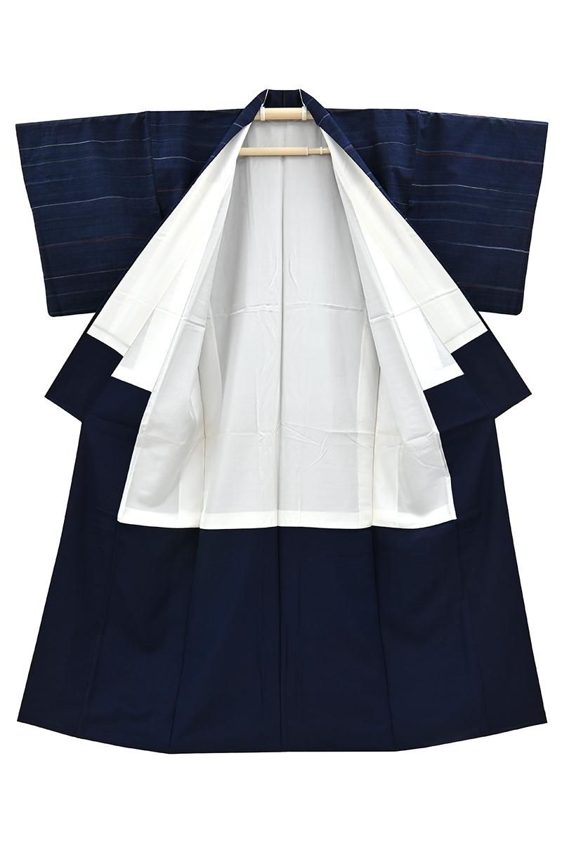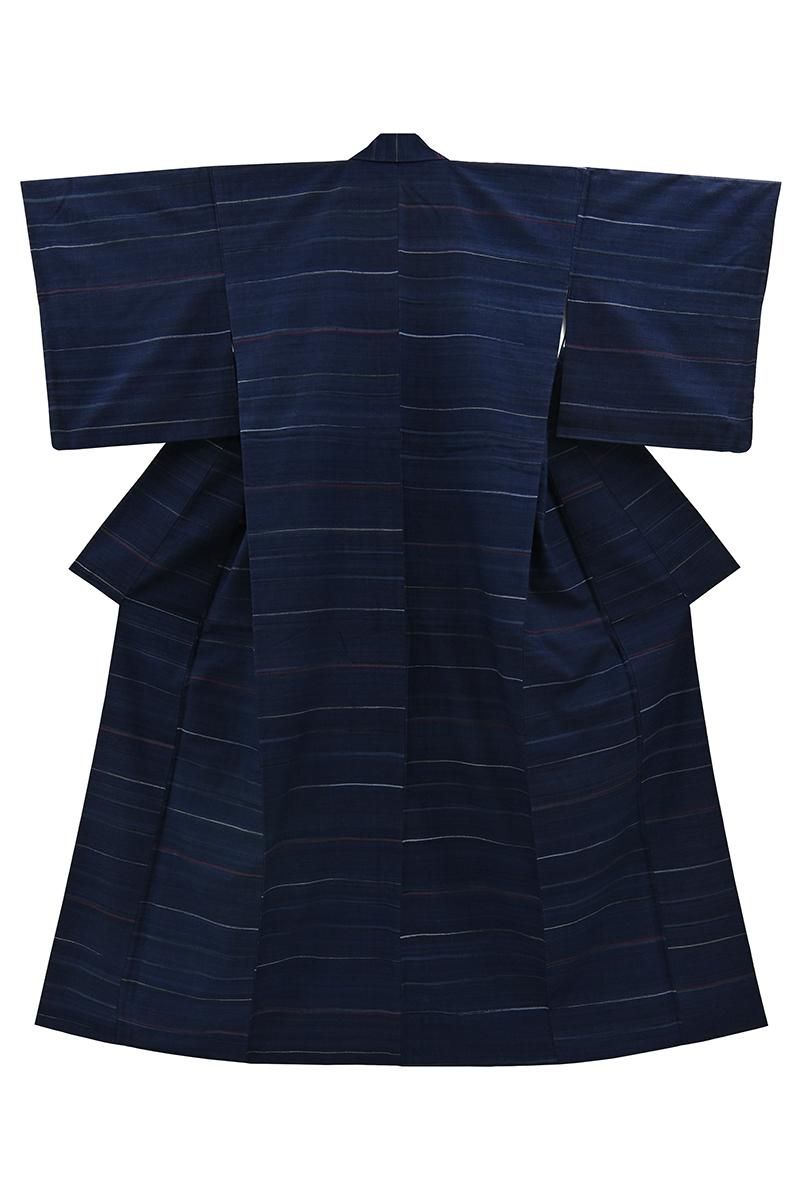 経糸は玉繭から引いた節のある玉糸を、緯糸には選び抜いた春繭の本真綿から手でつむいだ糸を用い、草木で丹念に染め、高機で織り上げられる極上の織物、郡上紬の着物です。この紬は結城と比肩されるほどの優しい暖かさを備えており、厳寒期にも着る人をしっかりと護ってくれる頼り甲斐のあるお品。今回のご紹介は色を深めた藍色が近いでしょうか。落ち着いた藍を背景に深い紅や淡い藍、水縹色、瓶覗色、灰緑色など草木染による美しい彩りをのせて、太さも様々に掠れたような横段が配された一枚。平板には収まらない陰影豊かな背景、単純な段模様とは全く異なる変化に富んだ表情に、繊細かつ力強い郡上の色構成ならではの個性が光っていますね。紬織の人間国宝 宗廣力三さんが大変な苦労を重ねて育て上げた織物は、一見素朴な表情ながら、あらゆる工程で丁寧なお仕事が積みあげられた布だけが持つ温かな力を備え、手に取る度に心を満たしてくれることと思います。残念ながら現在は既に生産も止まっているとのこと。心に響くお品に出会いましたら、ぜひお手元にお呼び下さいませ。紬織物の名門問屋 室町の加納さんの別誂えで、銀座きしやさんの扱いです。