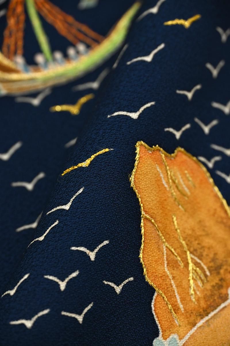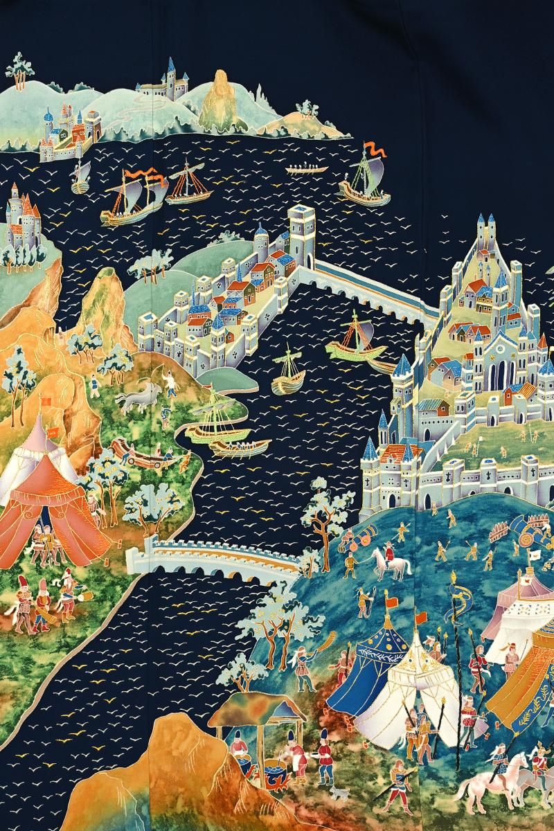 鉄紺色が近いでしょうか。深々とした暗く濃い青を背景に、様々な帆船が浮かぶ波立つ海を挟んで、城が聳える島や天幕に兵士や楽団などそれぞれ仕事に勤しむ人々の姿が生き生きと表現された色留袖です。城塞都市を俯瞰しているような景色は中世の絵画に基づくものでしょうか。繊細な筆と多彩な繍いを駆使して、時空を超えた遠い異国の世界を鮮やかに表現していますね。こちらは染繍の最高峰の技術を用いて重厚な着物や帯を制作なさった江戸友禅の名門 大彦さん、贅を尽くしたその作品たちは美術品としての価値をも備えることで良く知られています。今回のご紹介は彦兵衛さん、真造さんに続く三代目・野口彦太郎さんのお品。大彦さんの作品は古典的なものから西欧の趣きを大胆に取り入れたものまで、実に多様なモチーフが用いられていますが、こちらは独特の絵画的な表現が斬新な一点。小袖の美を忠実に再現したものとはまた趣きが異なりますが、異空間に入り込んでしまったかのような個性的な景色が、ホテルなど広い洋の空間ではとりわけ印象的に映るであろう、大彦さんらしいモダンな逸品ですね。色留袖のかたちですが洒落の繍三ッ紋ですので着用の機会も広くお楽しみいただけることと思います。ぜひお手に取ってご覧くださいませ。