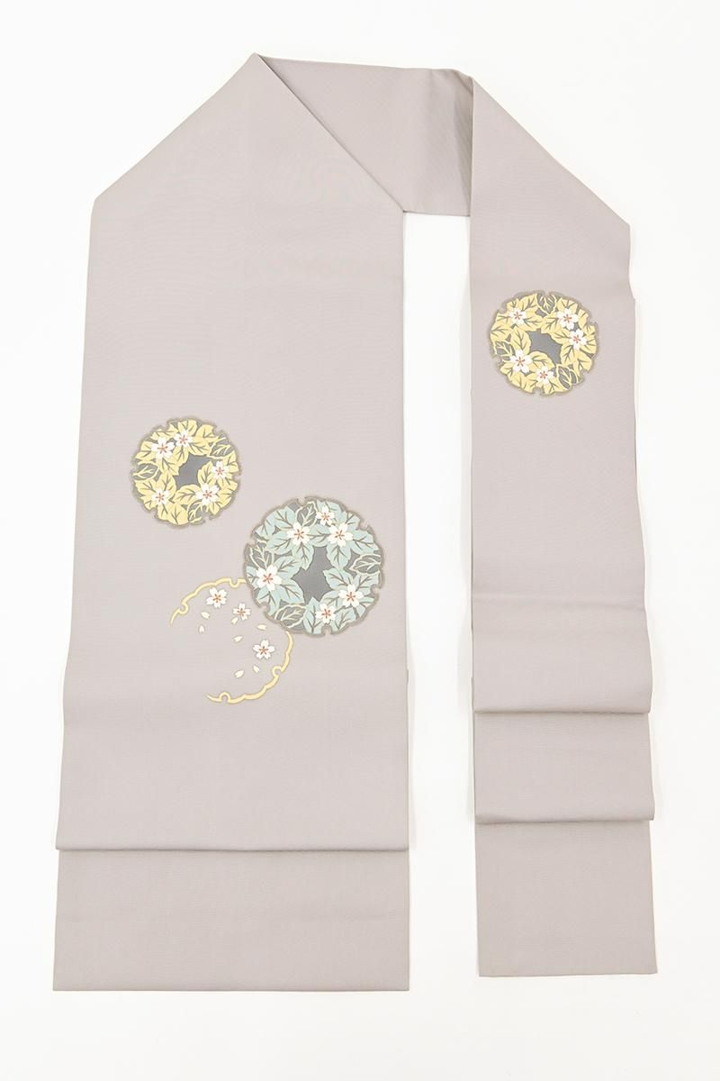 灰色が近いでしょうか、温かみのあるグレーの塩瀬地に、雪輪に桜の図を配した名古屋帯です。