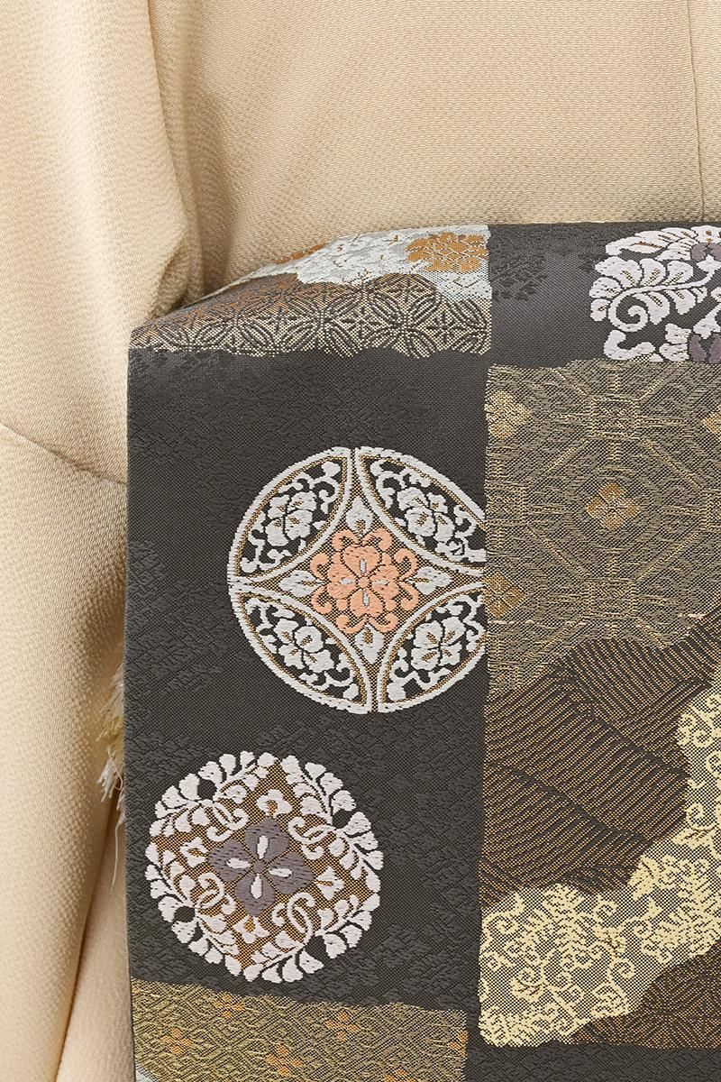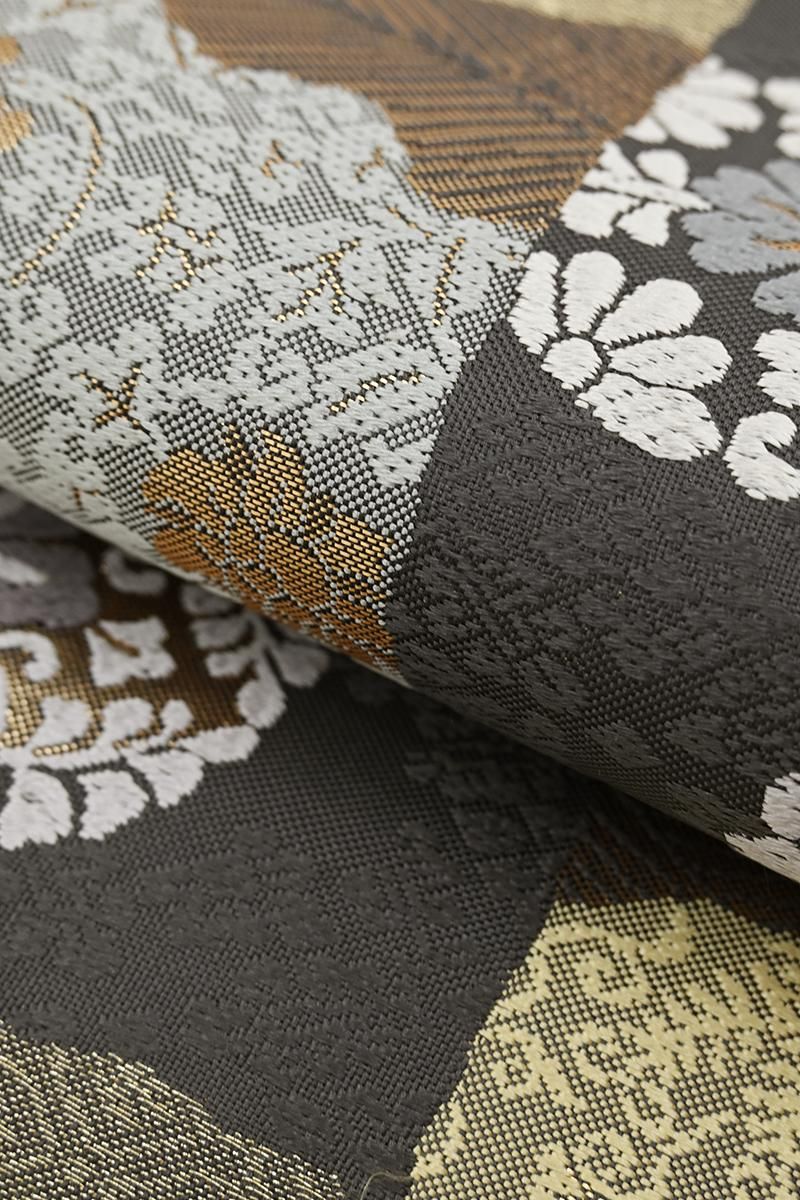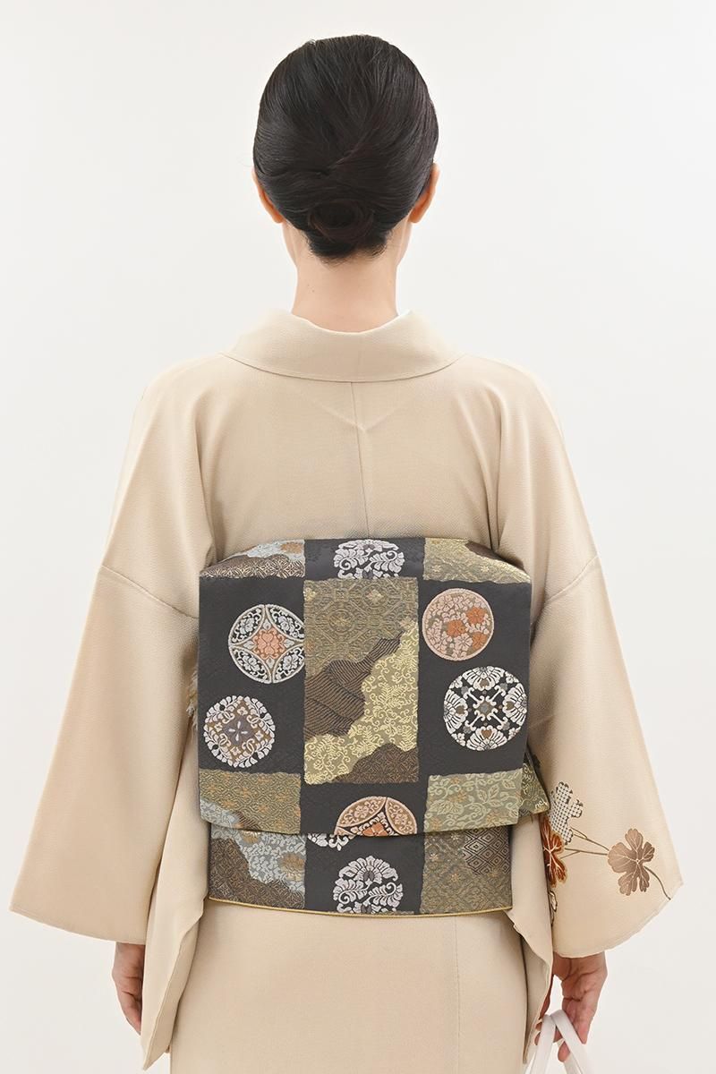 ぐっと色を深めた鳩羽鼠色が近いでしょうか、わずかに紫みを含んだごく深いグレーの地に、変わり市松に道長取りや有職丸文を織り出した袋帯です。きりりとしたお色目に優美な色遣いで表現された古典意匠がモダンな表情のお品、金糸の煌めきが気品を添え、改まったお出かけやお茶の席などに相応しい、端正で格調ある装いをお楽しみいただけることと思います。色無地や付下げ、訪問着などに合わせていかがでしょうか。