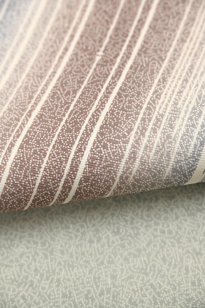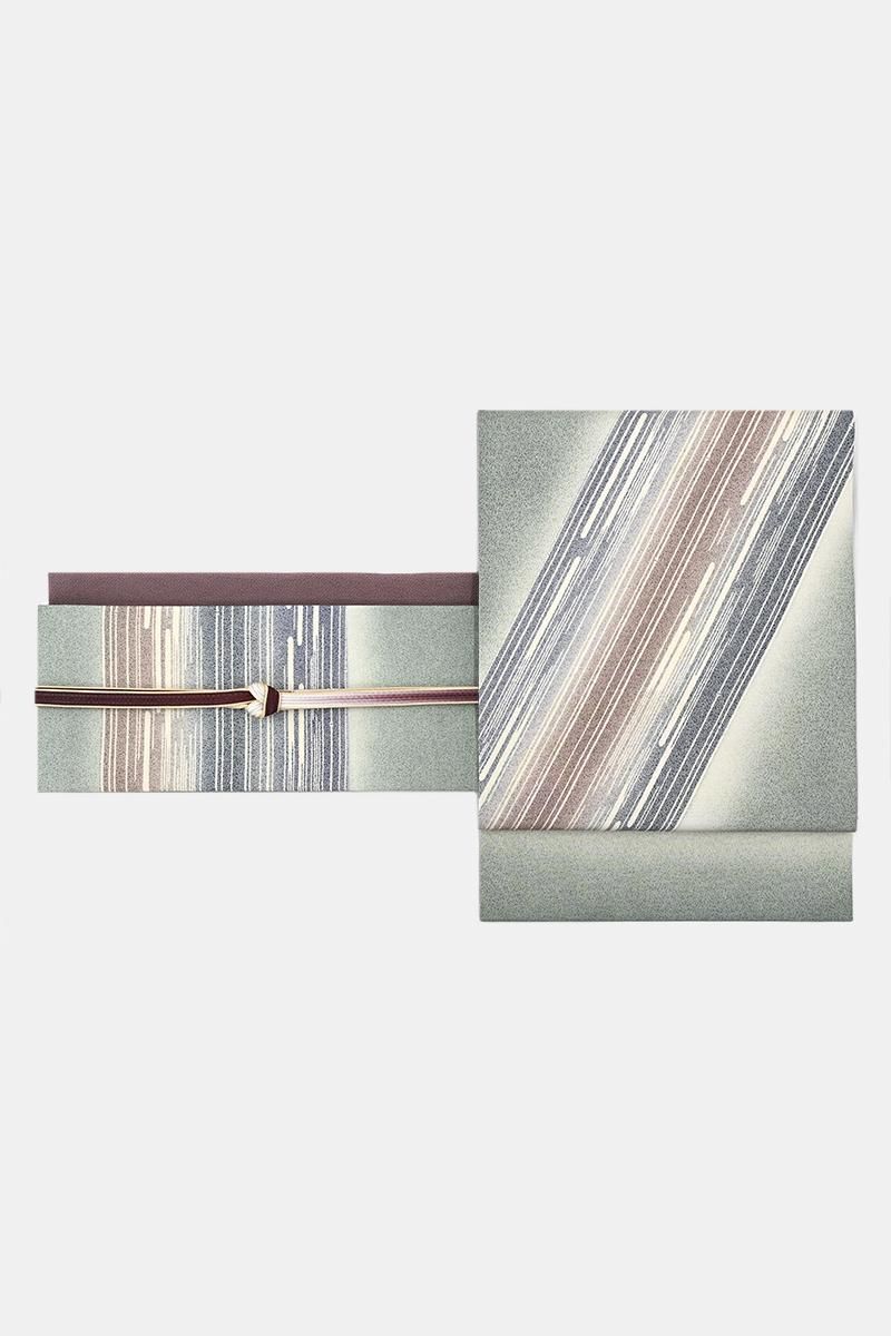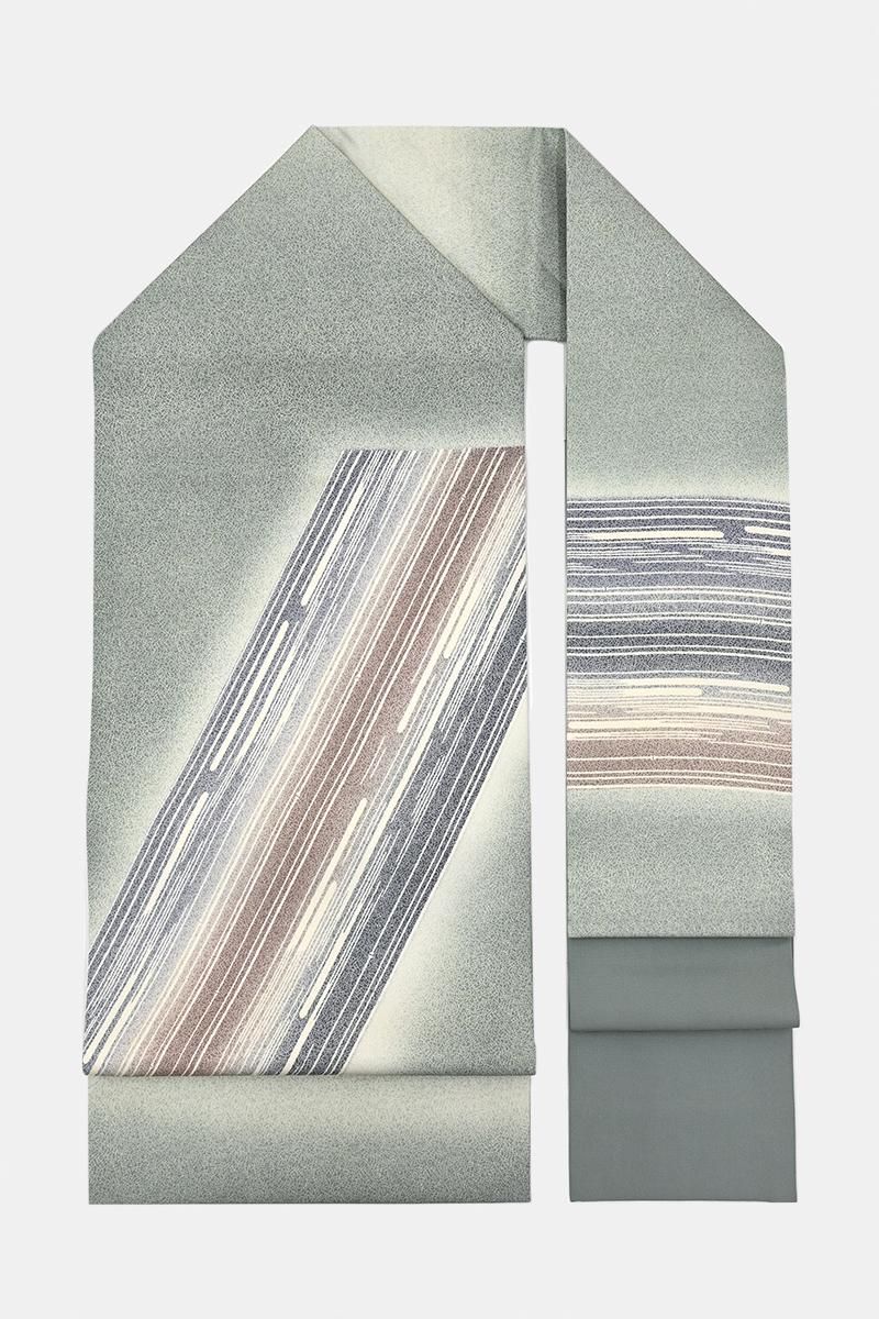 江戸小紋の第一人者として活躍なさった日本工芸会正会員・藍田正雄さんの作品から、やや灰みを強めた老竹色が近いでしょうか。グレイッシュな渋い緑系の塩瀬地に一面錐彫による雪月花の型を置き、重ねて竹の節にも水の流れにも見える様々な直線や破線が重ねられた染名古屋帯です。精緻な江戸小紋の仕事に加えて、独特の柔らかな暈しと共に紺鼠色や橡色の彩りが、大きく手綱のように帯を横切ってゆく景色がとてもモダンな印象のお品。一見シンプルな構図ながら、隅々まで目の行き届いた藍田さんならではの高度な仕事がなされており、江戸小紋らしい洒落みのある小粋な存在感が光っていますね。シックなお色目は合わせる着物を選ばず、シャープなモチーフが紬や小紋の装いをきりりと引き締めてくれることと思います。ぜひこの機会にお手に取ってご覧くださいませ。
