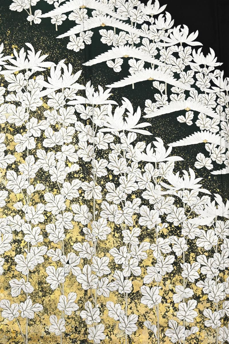 深々とした黒を背景に、刺繍による菊花で裾を埋め尽くした贅沢な総刺繍の黒留袖です。極細い糸を用いた蘇州刺繍の高度な技術によって、清々しい菊花がふっくらと配されたお品。ひとつは乱菊のように、もうひとつは鶴が羽を広げたかのように、花々は二種類の端正な横菊の形に揃えられており、裾にほんのりと暈された黒緑の色と鈍い金彩の煌めきが、晴れやかな花景色に一層の華やぎと奥行きを添えています。腰から裾へとゆったりと広がる、膨大な時間が費やされた刺繍ならではの重厚華麗な表情は、晴れやかな式典のお席でも圧倒的な存在感をお楽しみ頂けることと思います。お探しの方、ぜひこの機会にお手に取ってご覧くださいませ。