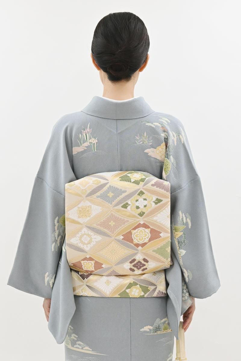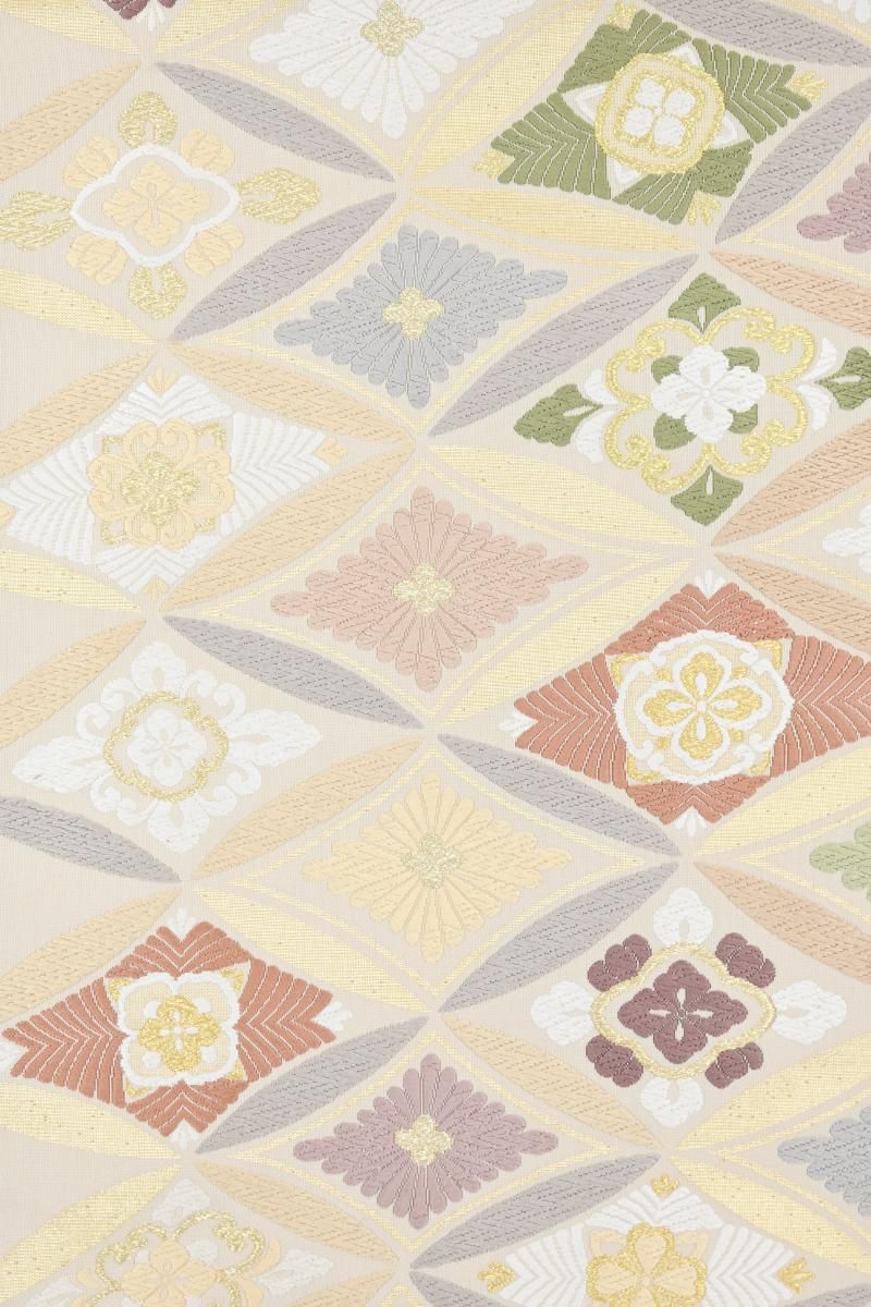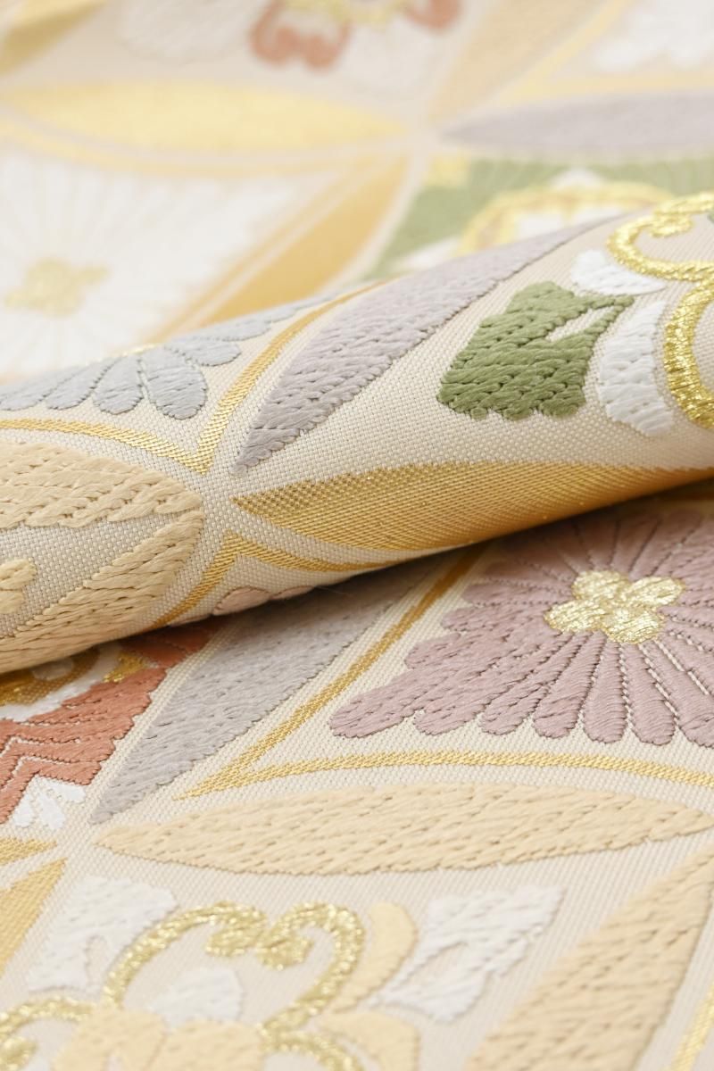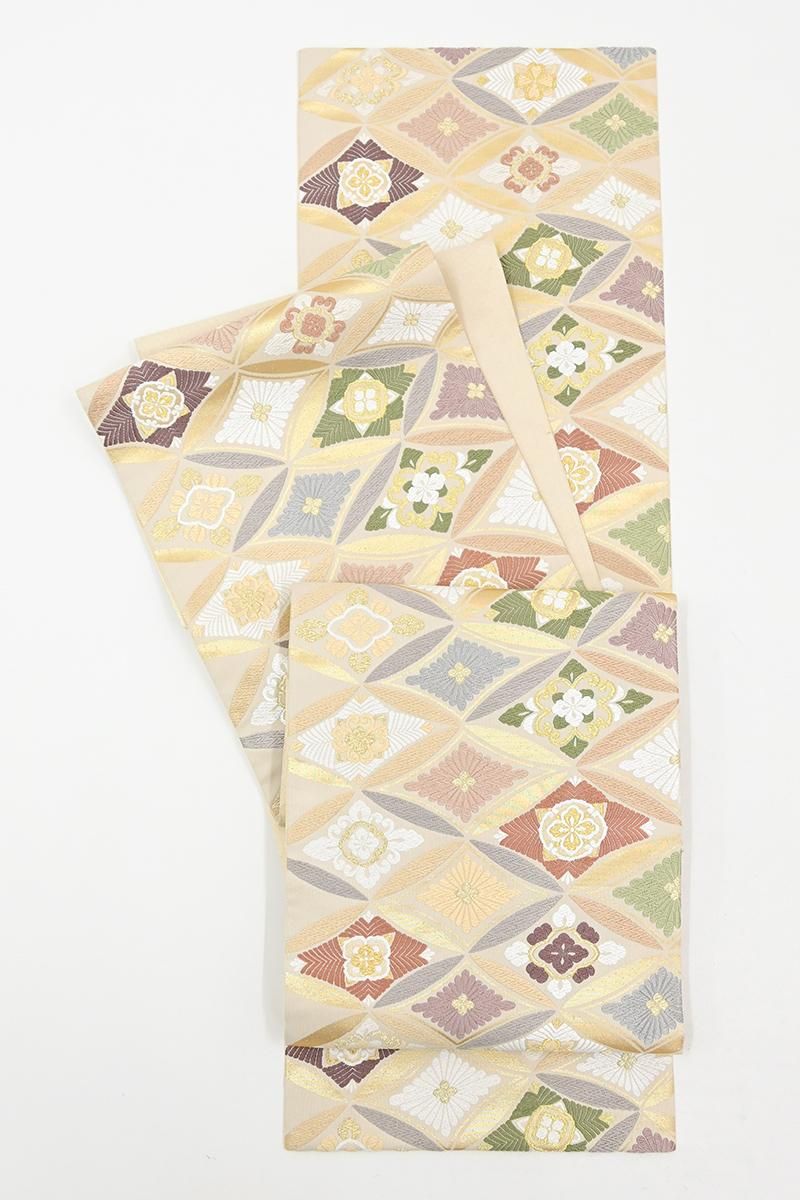 象牙色が近いでしょうか、ほのかに灰みを含んだクリーム色の地に七宝花菱文を織り出した袋帯です。ふっくらとした立体的な絹糸の風合いと穏やかな彩りが美しく調和し、格調高い古典意匠を気品豊かに引き立てる一本、季節を選ばない文様の白系の帯は合わせる着物の色柄ゆきも幅広く、重宝にお使いいただけることと思います。色無地や付下げ、訪問着などに合わせてお祝いのお席やお茶席などの改まったお席にいかがでしょうか。