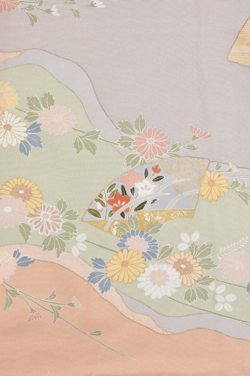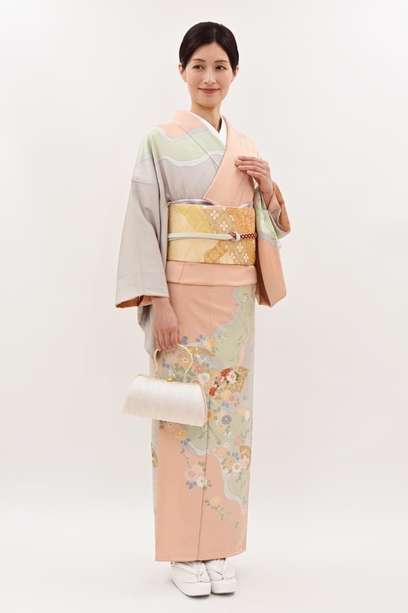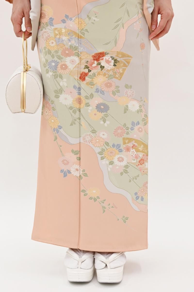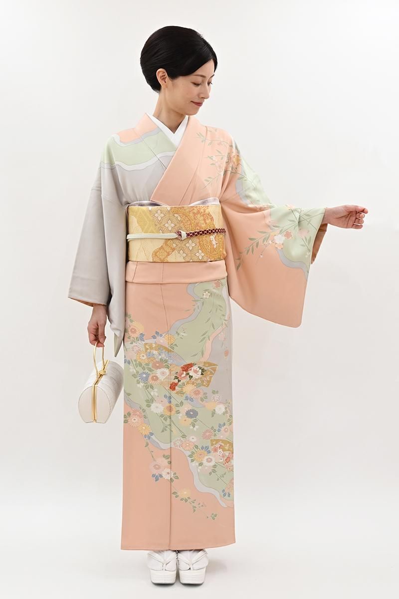 ややピンクみを足した赤白橡色が近いでしょうか、明るいサーモンピンクや淡いグレー、薄緑色で道長取りのかたちに場を分け、四季花をあしらった地紙や、枝垂れ柳、菊などをゆったりと配した訪問着です。