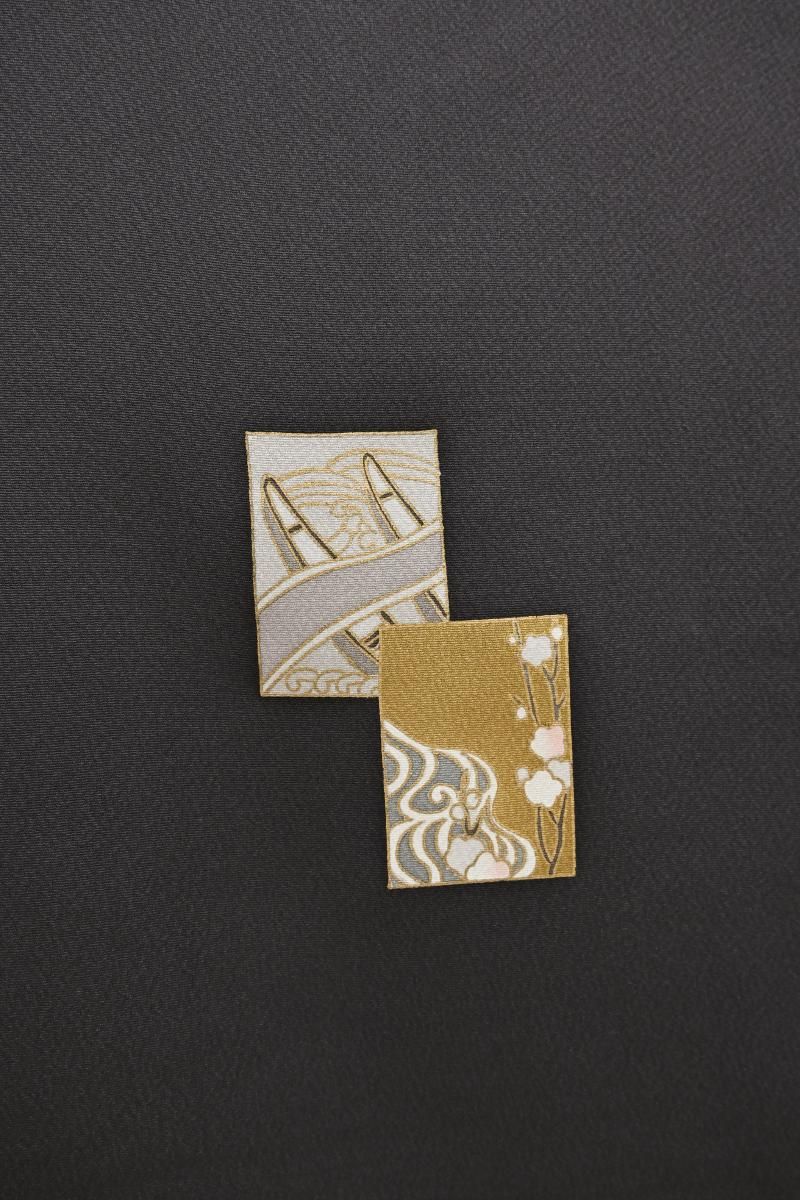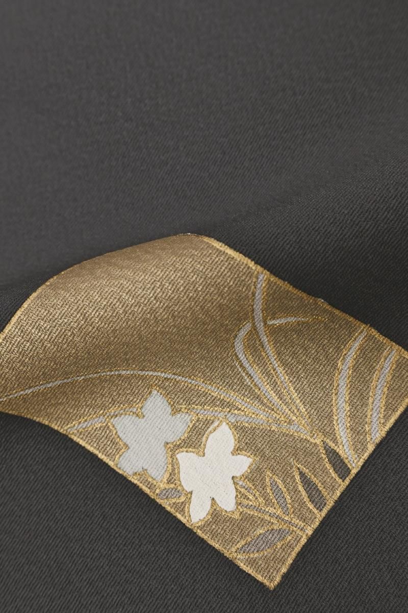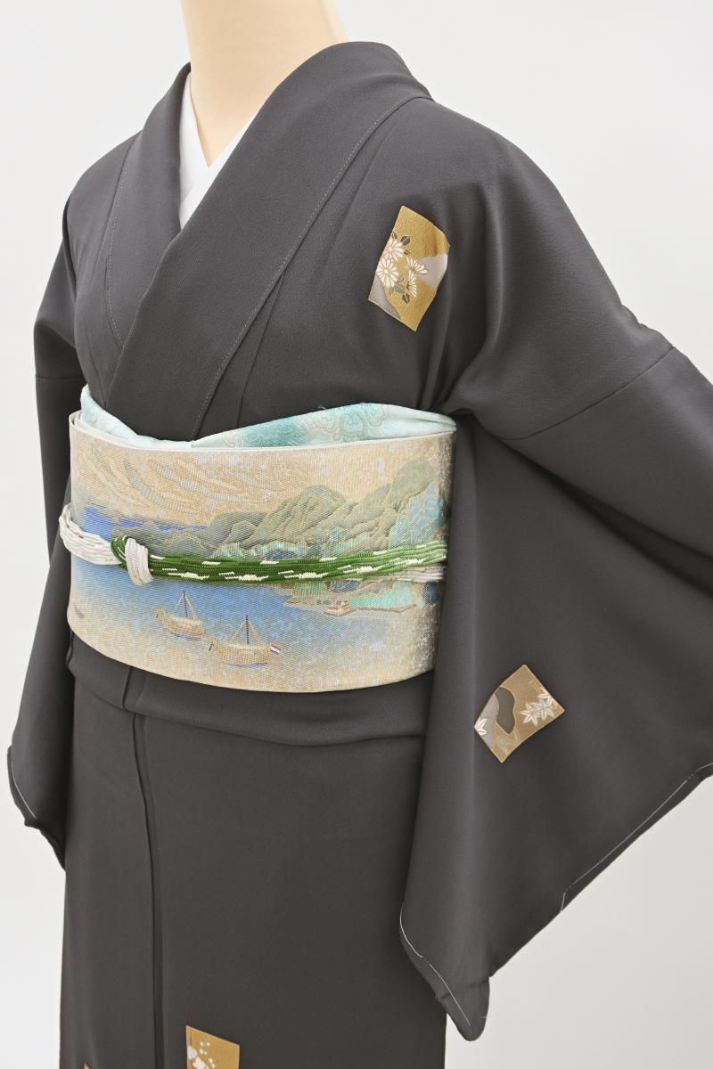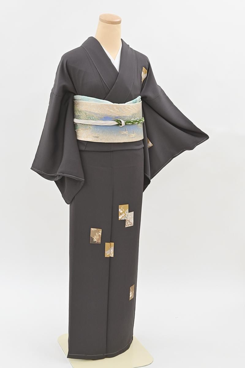 ぐっとシックなお色目に、渋みのある抑えた色遣いで表現された風情豊かな意匠に大人の洒落みが香るお品、金彩の落ち着いた輝きも静かな気品を添えていますね。一歩控えた趣の古典意匠の付け下げは、一枚ご用意いただきますと何かと活躍の機会も多いことと思います。ちょっとした集まりから観劇、お茶席などの改まったお席などにいかがでしょうか。