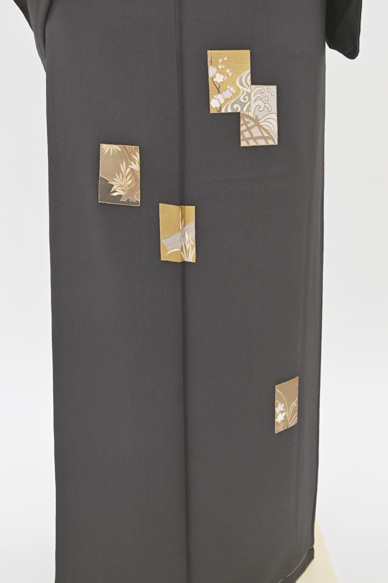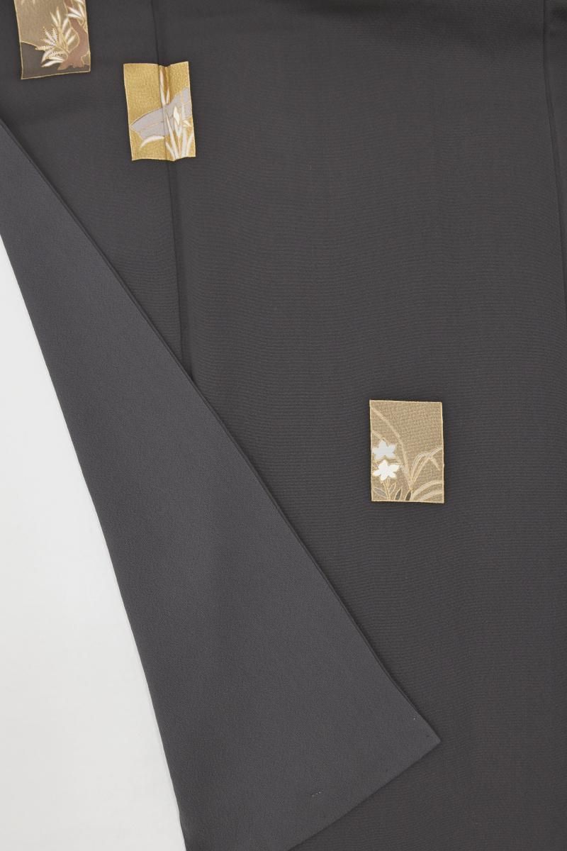 消炭色が近いでしょうか、細かなシボを帯びた深いグレーの縮緬地に、流水に梅や、蛇籠、八橋文など折々の景色をあしらった色紙を散らした付下げです。
