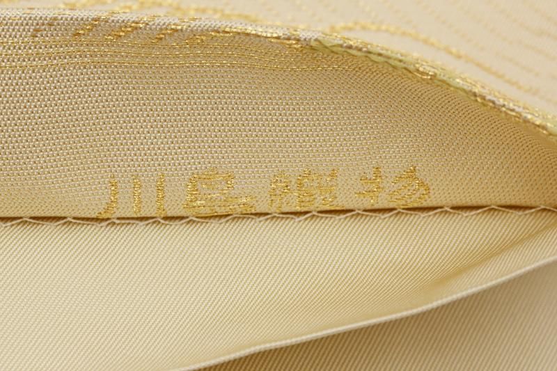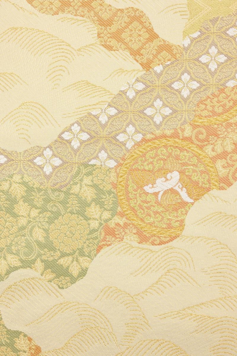 金で波を織り出したクリームイエロー系の地に、花唐草や七宝花文などを道長取りの形に寄せた本袋帯です。