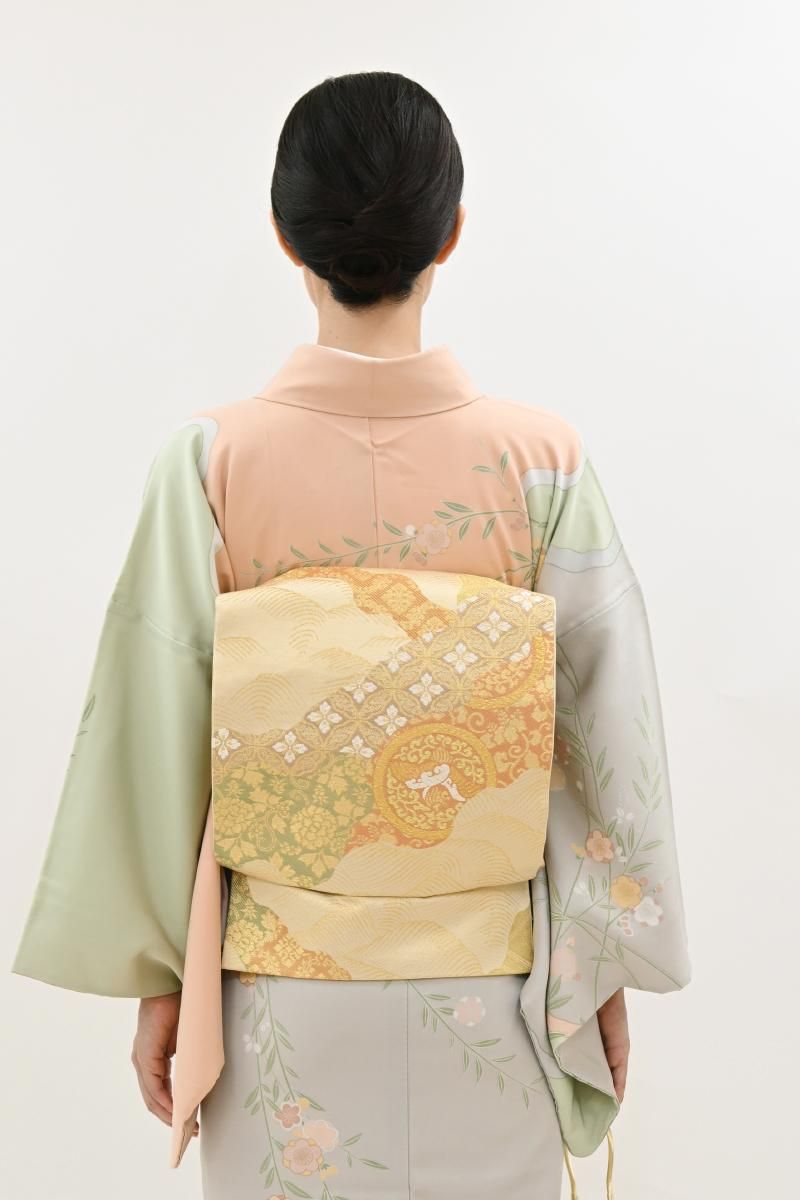 柔らかな地色に置かれた薄紫や薄緑、オレンジ色などの優しい彩りが穏やかな調和を見せるお品、紋付や訪問着などのフォーマルな装いの際に、着物の色柄を選ぶことなく安心してお使いいただけますね。西陣を代表する老舗機屋・川島織物さんの本袋帯、その締め心地と共に正統派の古典意匠ならではの静かな格調をお楽しみくださいませ。
