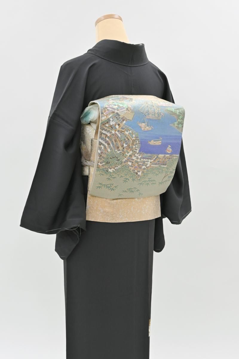 こちらは川原慶賀の描いた長崎港図を題材とした異国情緒溢れるお品、たっぷりと用いられた平箔糸や螺鈿ならではの深く豊かな煌めきが圧倒的な存在感で着姿を引き立ててくれますね。こちらは西陣の名門・川島織物さんの作。上質な素材を確かな技術で織り上げた本袋帯は、軽くしなやかな締め心地や美しく整うお太鼓のかたちにも定評があります。晴れやかなパーティやお祝いのお席に、ぱっと目を惹く印象的な装いをお楽しみくださいませ。