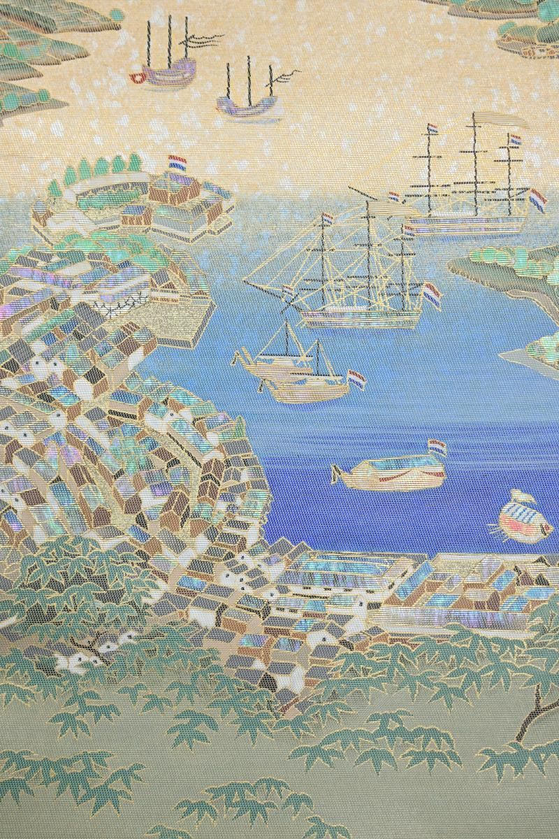 金銀の箔糸の煌めく華やかな地に、南蛮船の寄る港町の風景を表した本袋帯です。