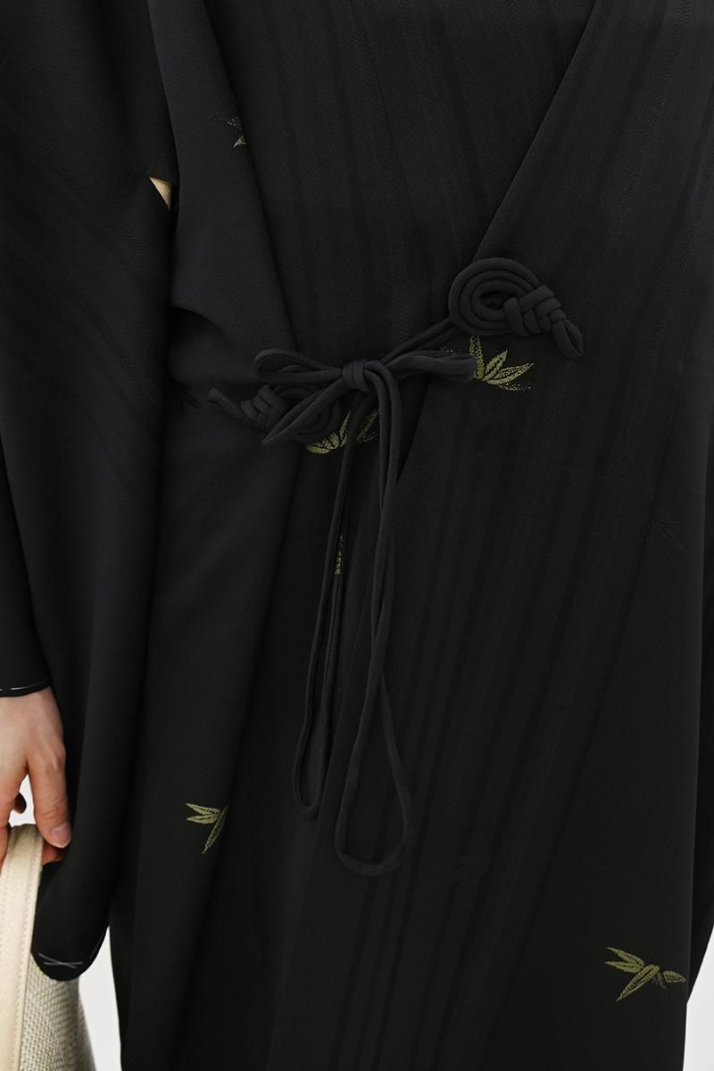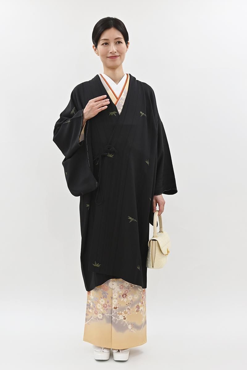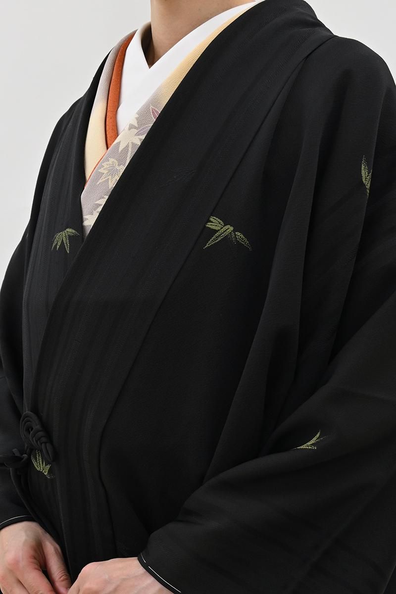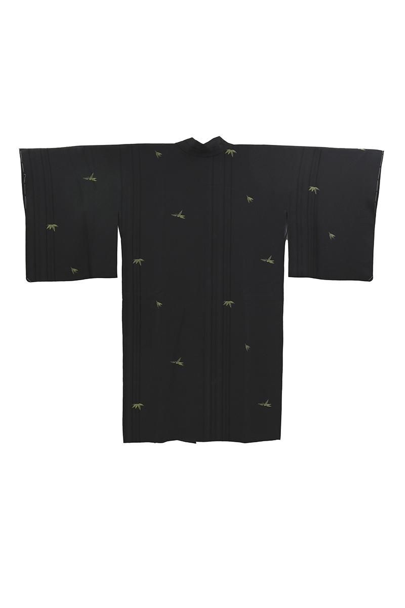 黒色の地に、すらりと伸びる笹竹の図を配した道中着です。