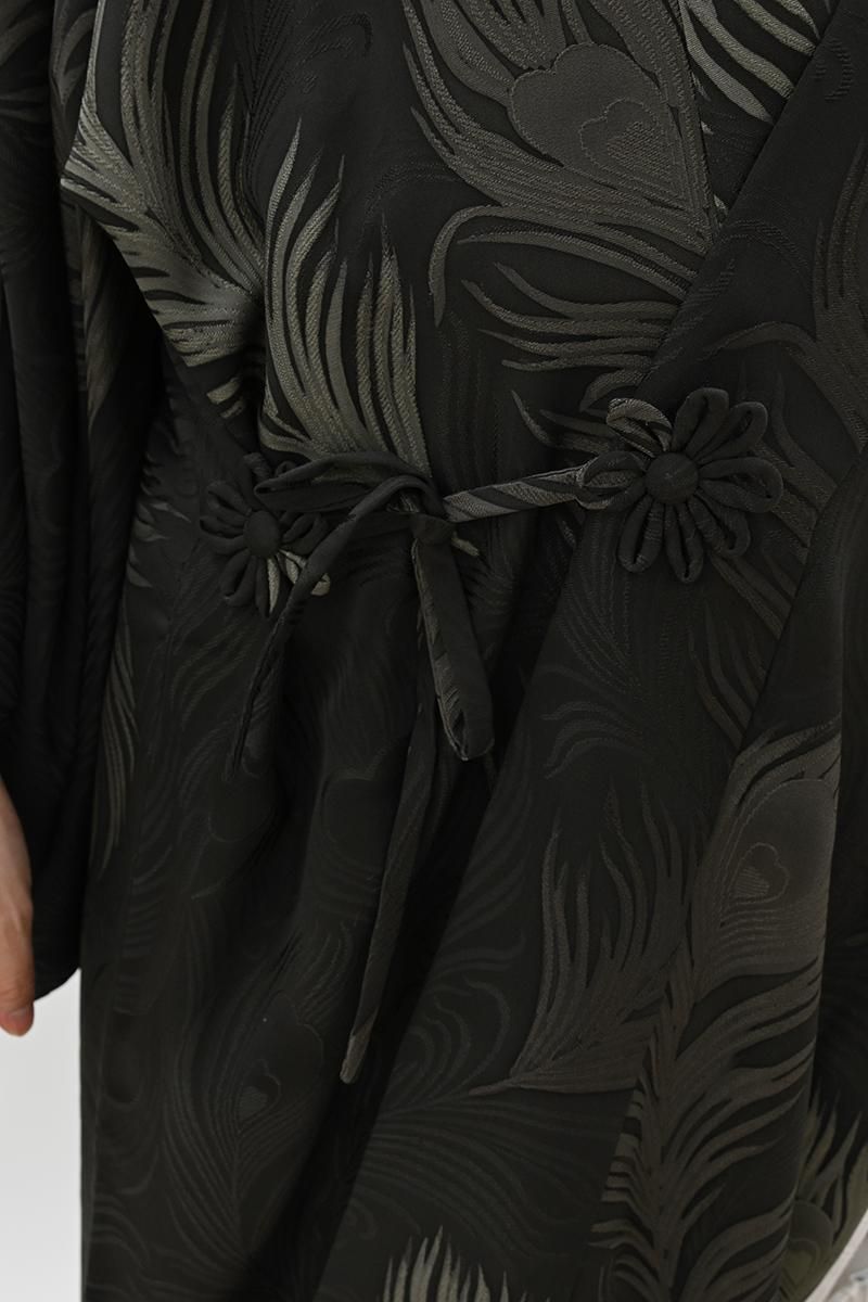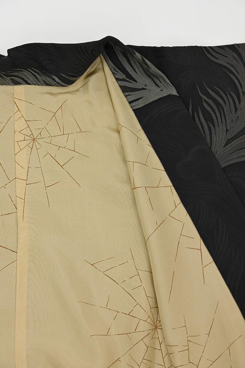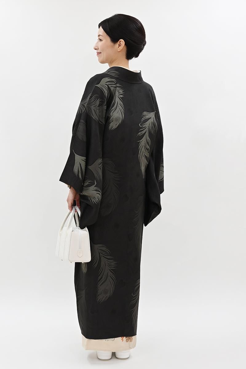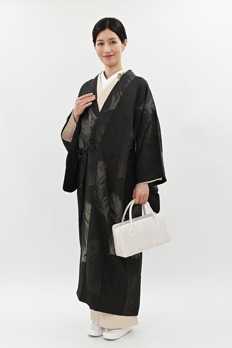 憲法色が近いでしょうか、黒に近いほどに色を深めた焦茶色の地に、躍動感あふれる羽根の図を配した道中着です。シックなお色目に、陰影豊かに浮かぶ優雅なモチーフが上品でモダンな印象のお品、様々なお着物に合わせやすく、装いをすっきりと引き締めてくれそうですね。防寒に、また大切なお着物を護るためにも必需品のコート、凛とした表情の一枚をこの機会にいかがでしょうか。