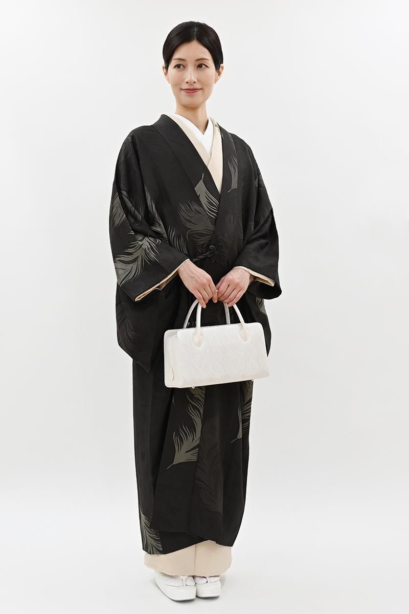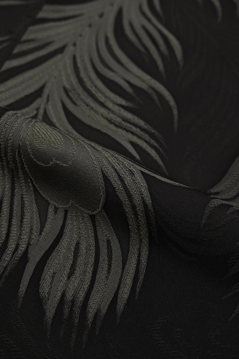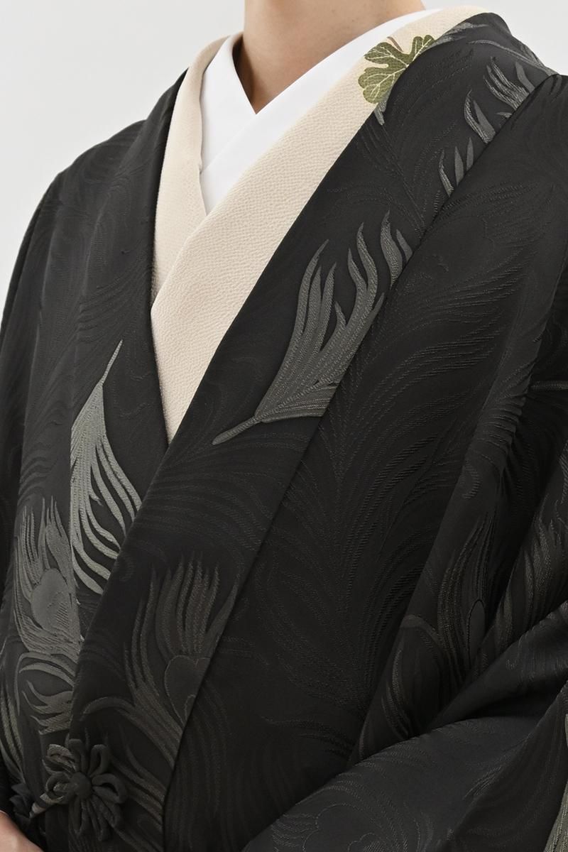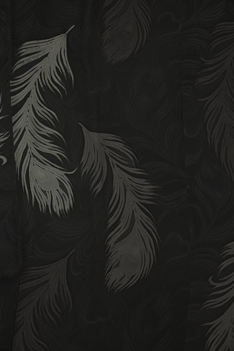 憲法色が近いでしょうか、黒に近いほどに色を深めた焦茶色の地に、躍動感あふれる羽根の図を配した道中着です。シックなお色目に、陰影豊かに浮かぶ優雅なモチーフが上品でモダンな印象のお品、様々なお着物に合わせやすく、装いをすっきりと引き締めてくれそうですね。防寒に、また大切なお着物を護るためにも必需品のコート、凛とした表情の一枚をこの機会にいかがでしょうか。