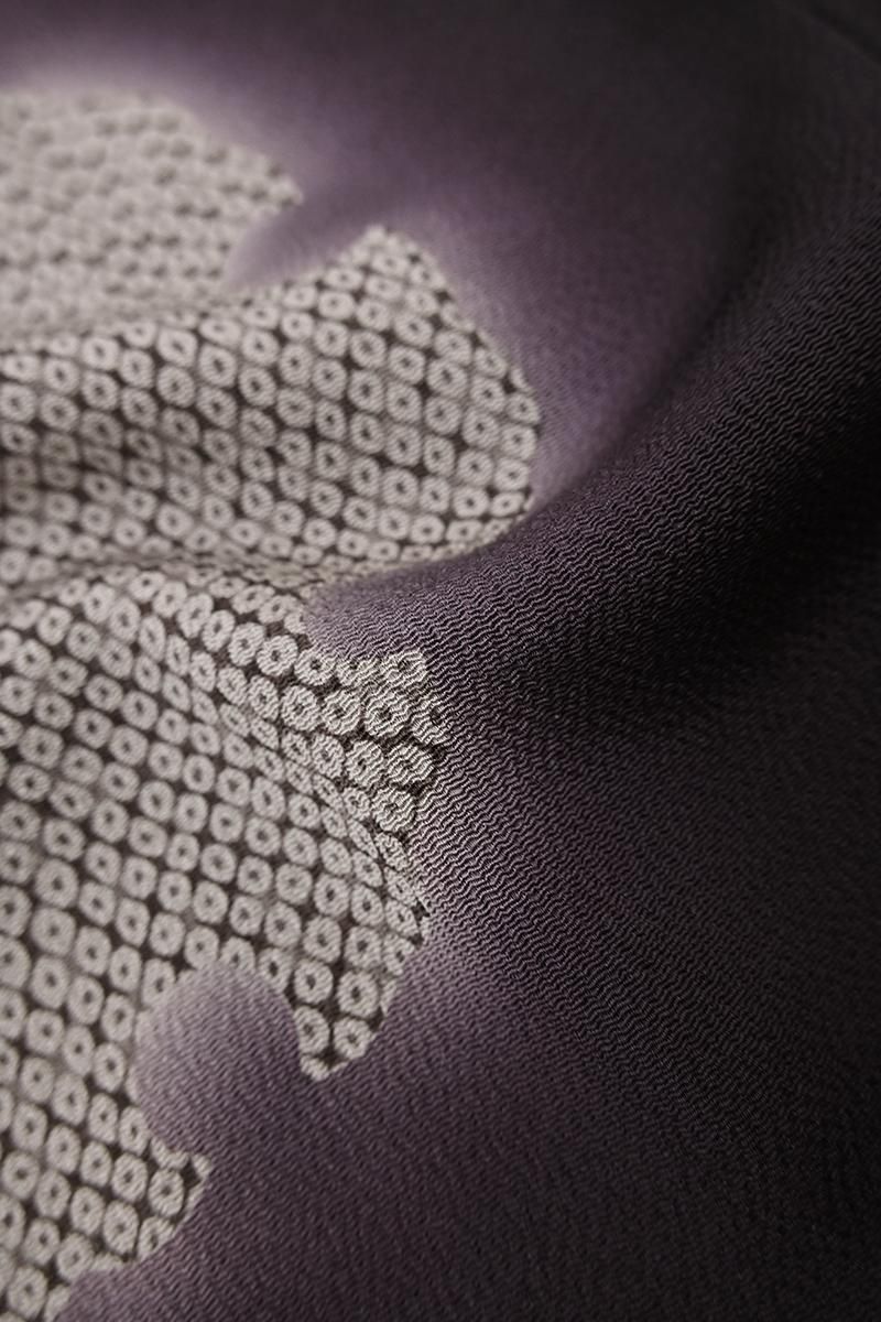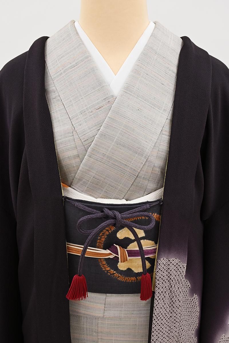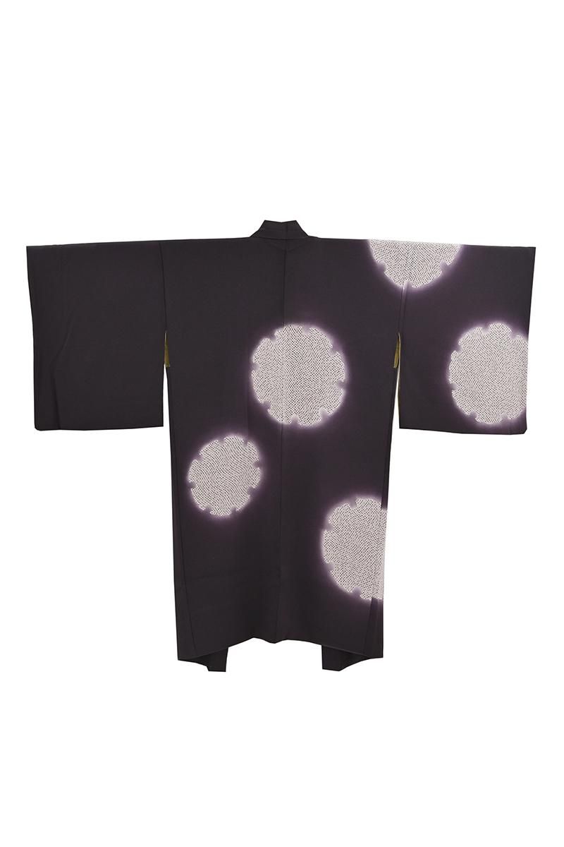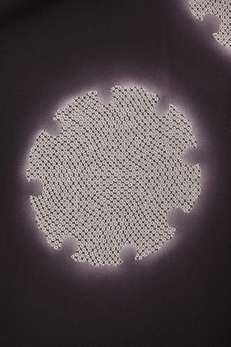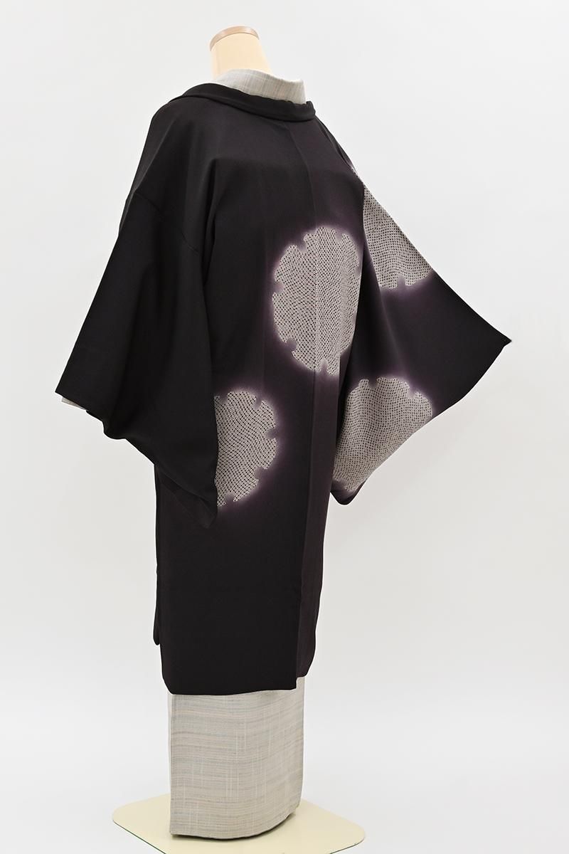 黒紫色が近いでしょうか、黒みを帯びたごく深い紫色の地に、疋田の雪輪暈かし文を配した羽織です。ふっくらしぼを帯びた地風に、おおらかな柄付けがパッと目を惹くお品、シックなお色目が全体をきりりと引き締めていますね。防寒や塵除けとして、また装いのアクセントとしてもお楽しみいただける羽織は、お着物に合わせて揃えたいですね。この機会にいかがでしょうか。