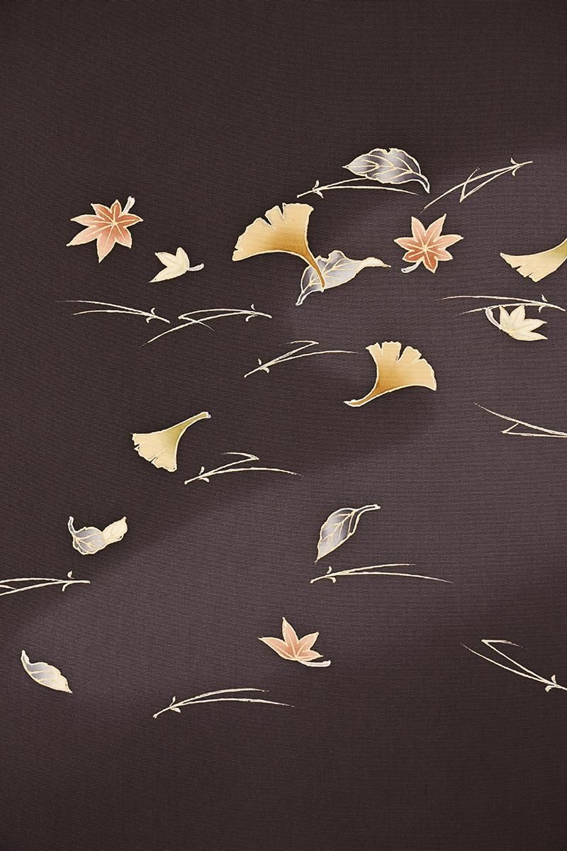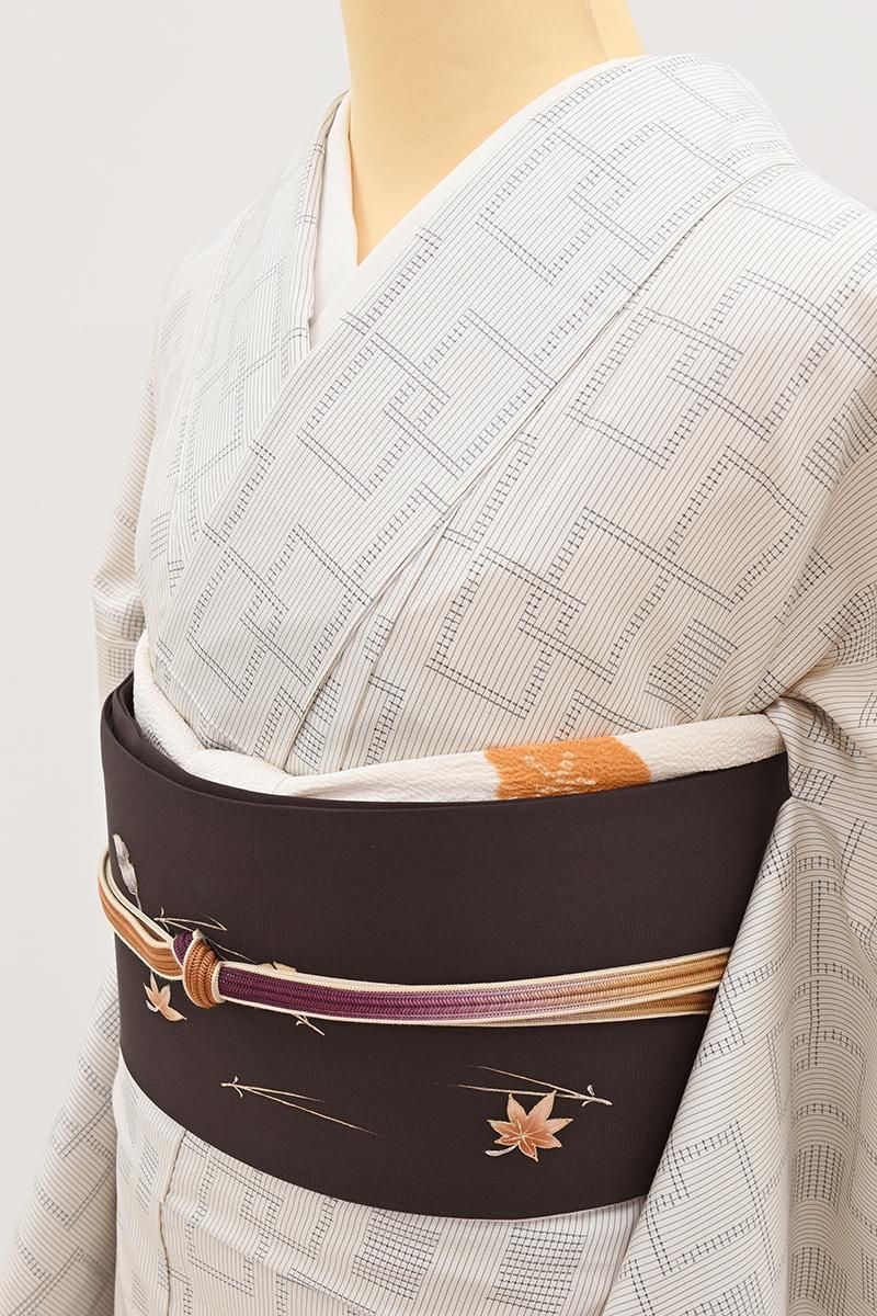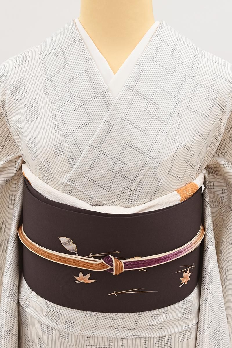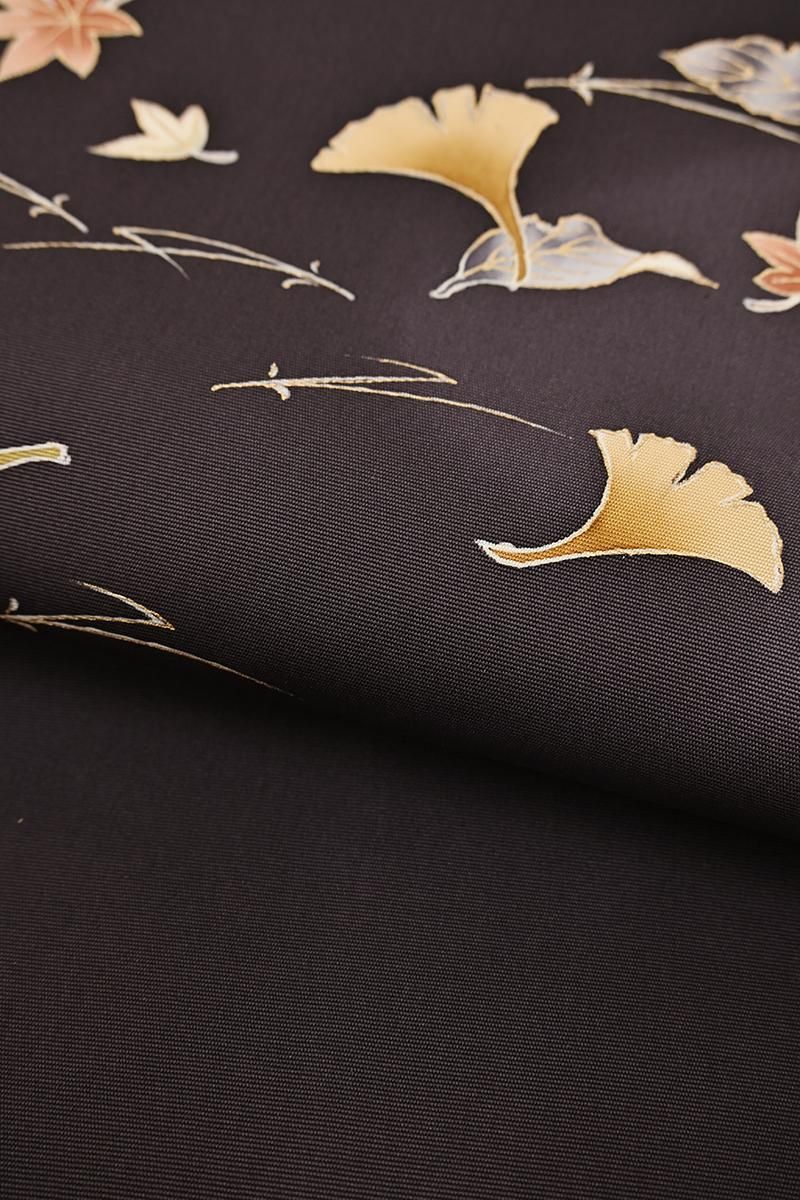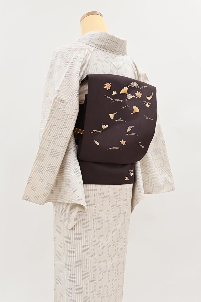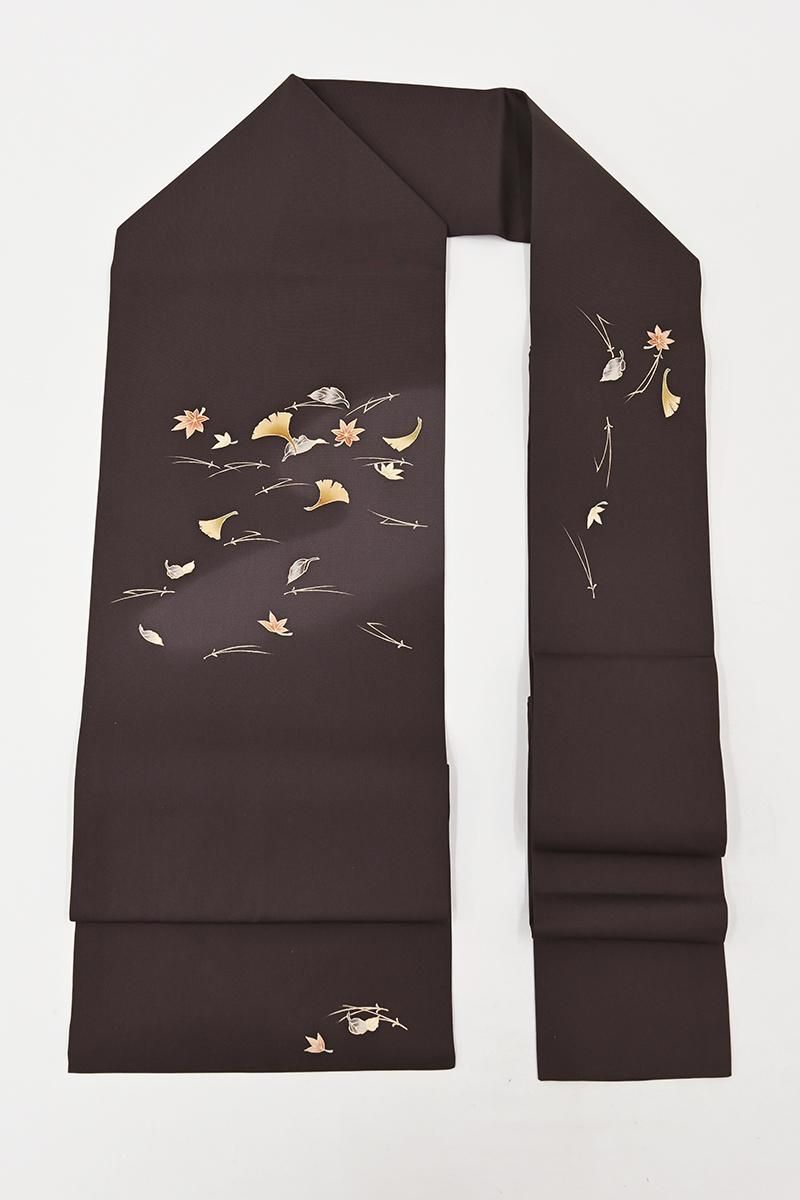 黒紫色が近いでしょうか、黒みを帯びたごく深い紫色の塩瀬地に、ふわりと暈かしを配し、銀杏や紅葉、松葉などが吹き寄せられた図を描いた名古屋帯です。さらりとした地風のシックなお色目に、繊細な筆致で表現されたモチーフが落ち着いた印象の彩りとともに秋冬の訪れの気配を運ぶお品、金彩の煌めきが気品を添えますね。紬や小紋、江戸小紋などに合わせて風情溢れる装いをお楽しみくださいませ。
