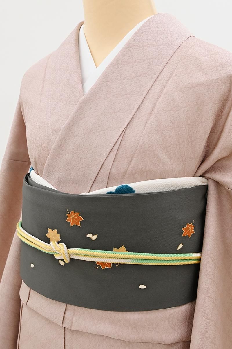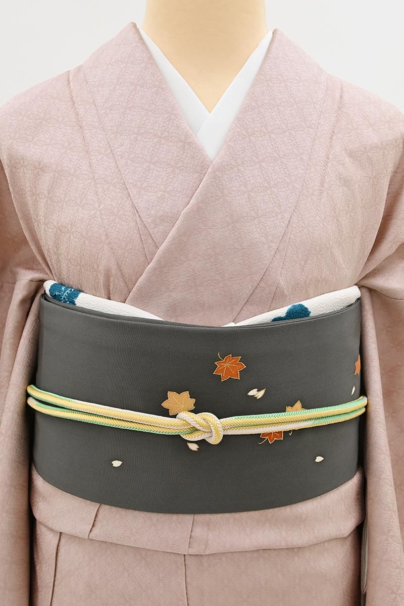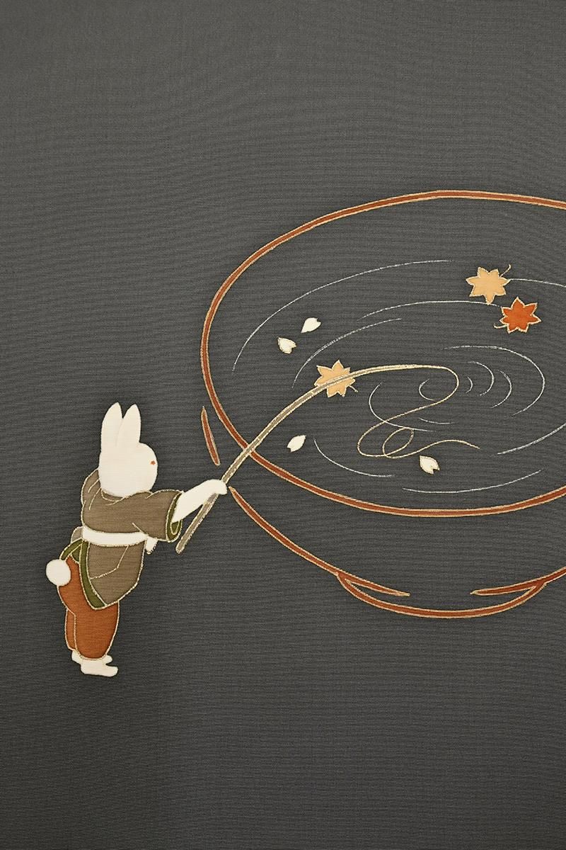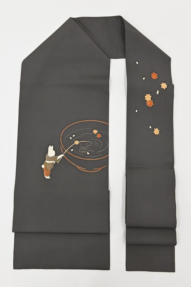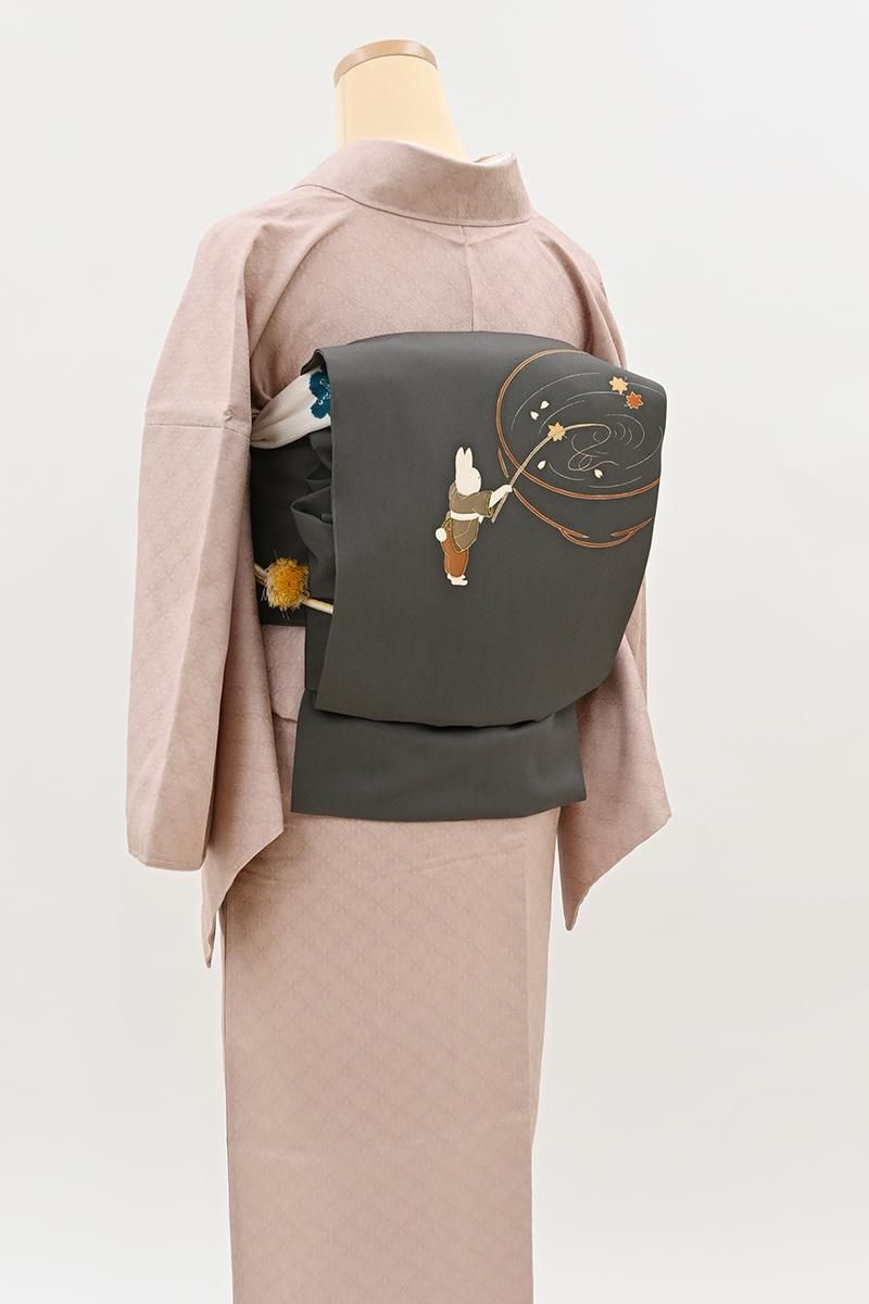 ぐっと色を深めた鳩羽鼠色が近いでしょうか、わずかに紫みを含んだ深いグレーの塩瀬地に、お茶碗で釣りをする兎の図を描いた名古屋帯です。シックなお色目を背景に、兎の愛嬌あふれる姿がどこかユーモラスな雰囲気のお品、遊び心あふれるモチーフはお出かけ先でも楽しい会話の糸口になってくれそうですね。紬や小紋などに合わせて、洒落味薫る装いをお楽しみ下さいませ。