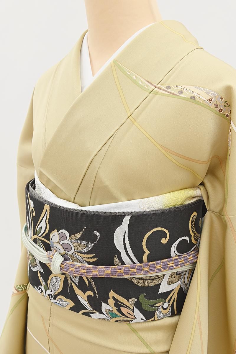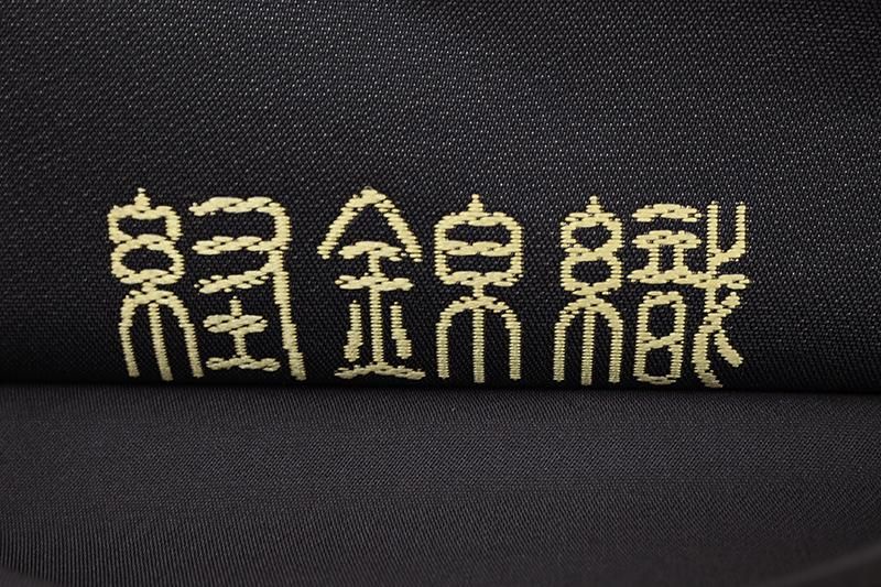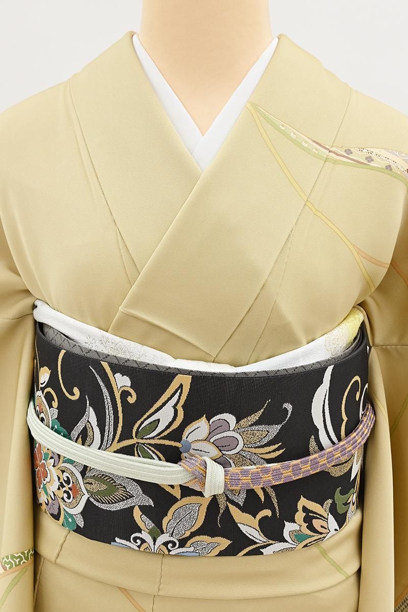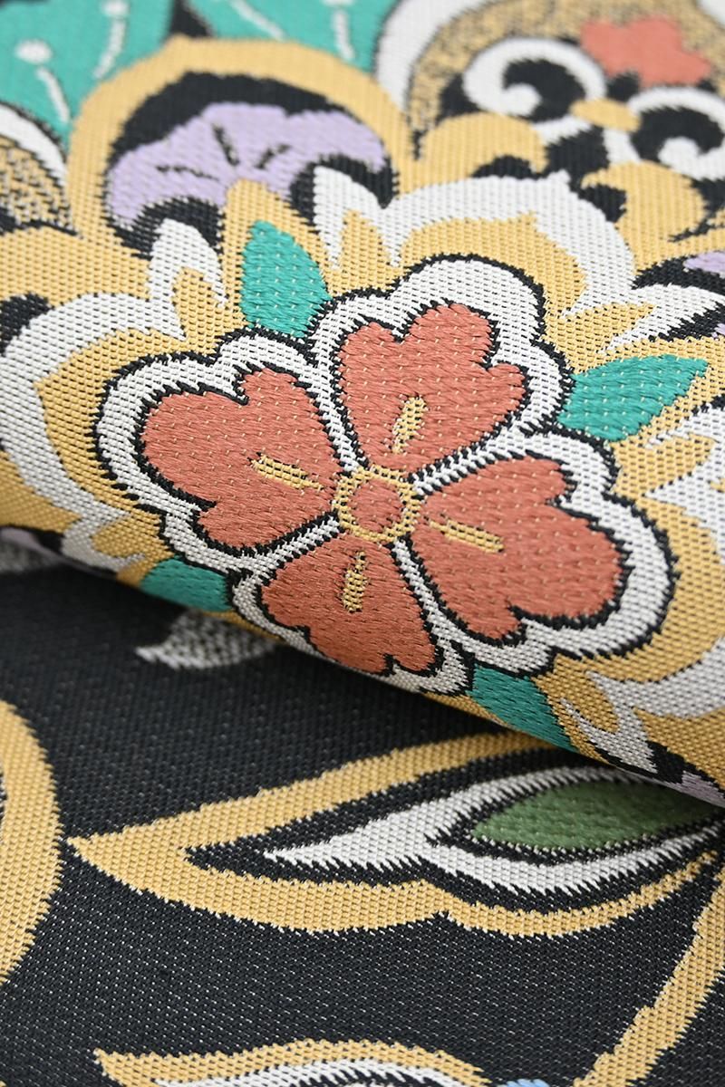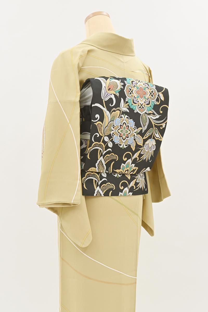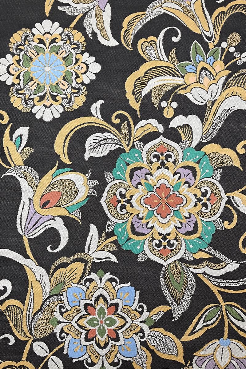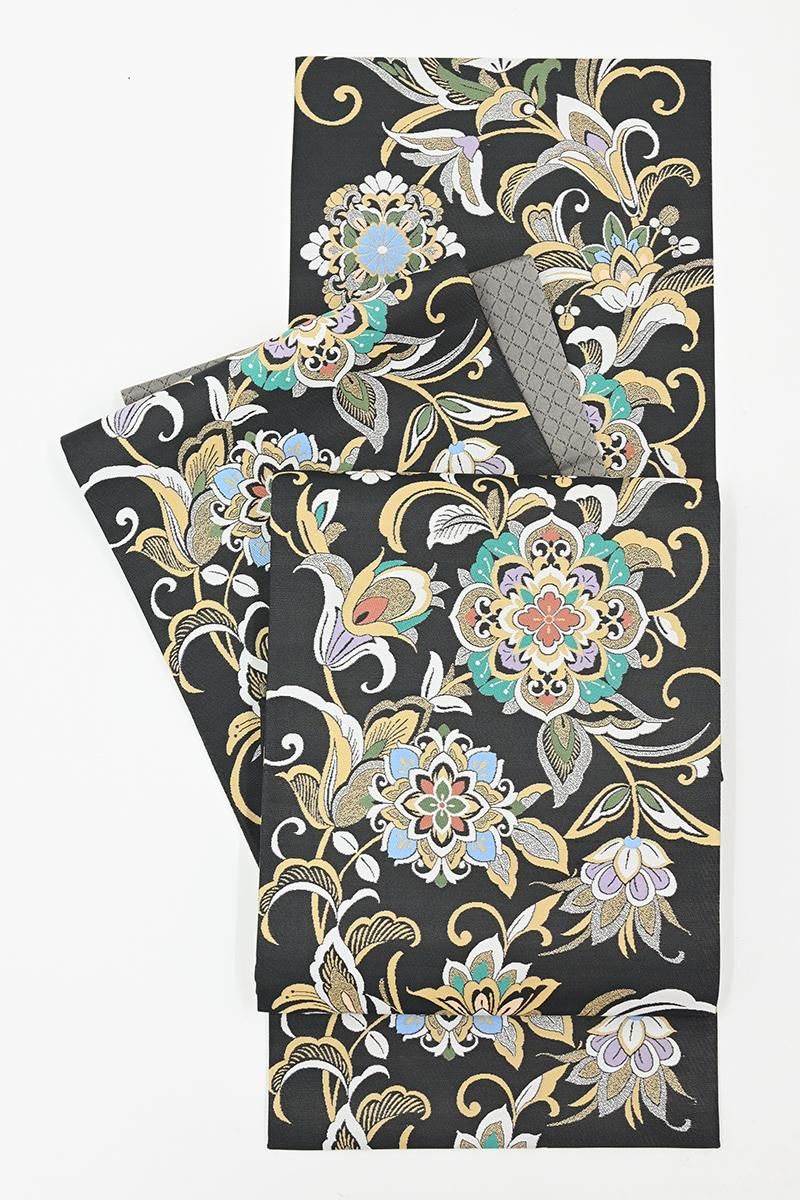 こちらは石板色が近いでしょうか、ごく深い青みのグレーの地に、華文や花唐草文を織り出したお品、華やかな意匠ながら金糸は用いておりませんので、上質感のある小紋から色無地、軽めの付下げまで様々なお着物に合わせてお楽しみ頂けそうですね。お茶席や観劇など少々改まった場面の装いにいかがでしょうか。