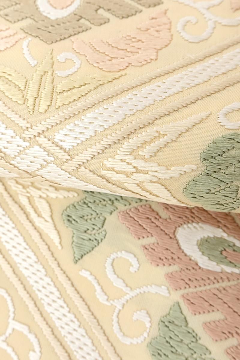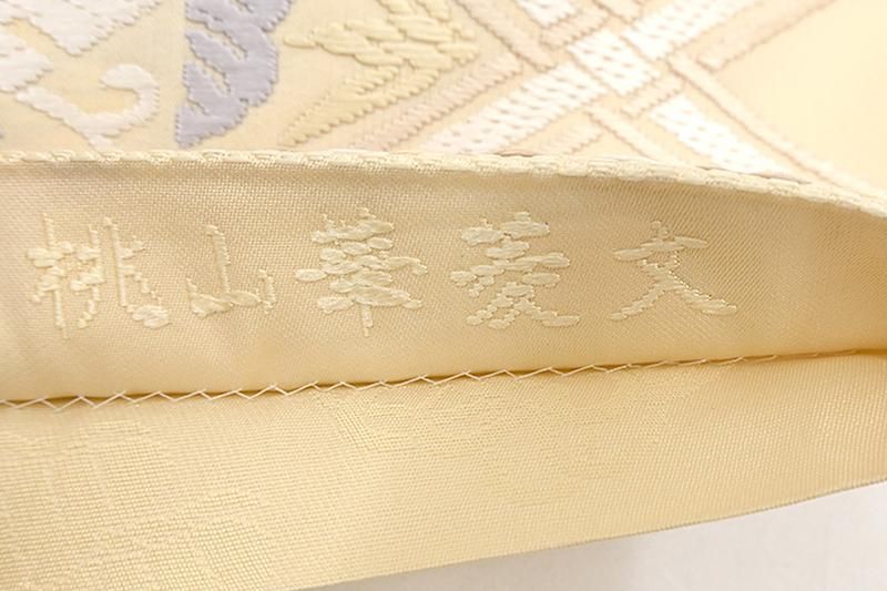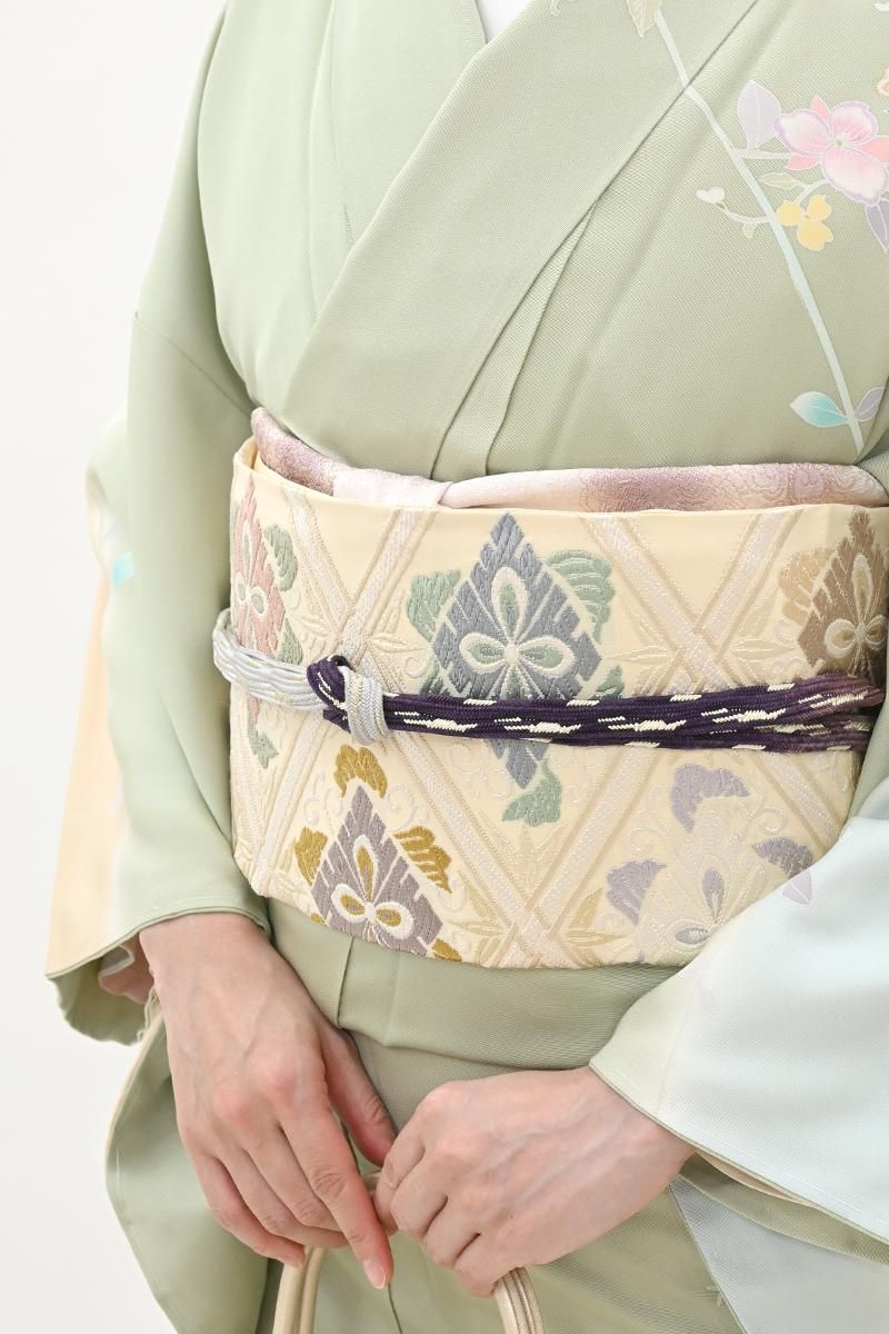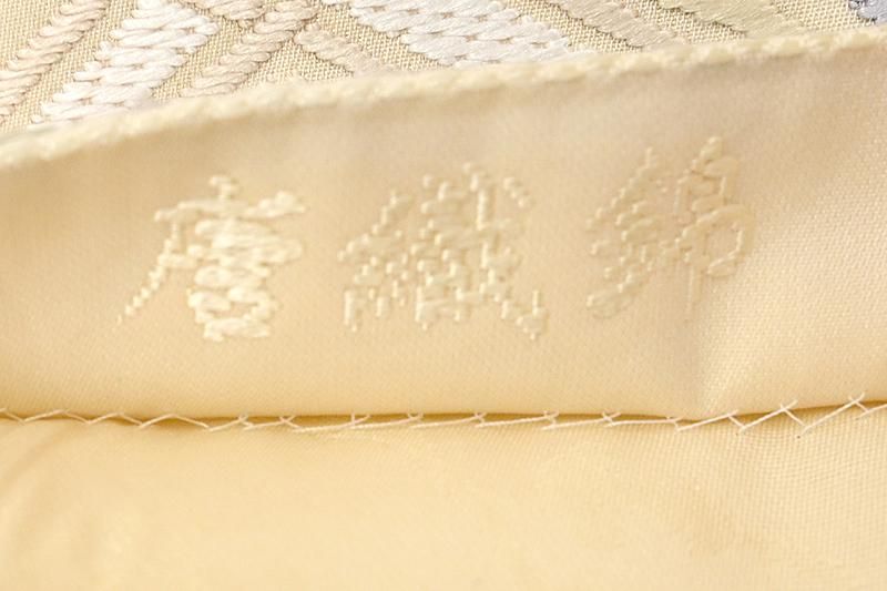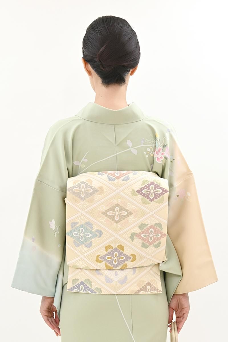 鳥の子色が近いでしょうか、クリーム色の地に優美なパステルカラーで、斜め格子に花菱文を配した袋帯です。唐織ならではのふっくらとした甘撚りの絹糸の光沢が着姿に豊かな気品を添えるお品、華やかな意匠ながら金糸は用いておりませんので、合わせる着物も幅広く、様々な場面でお使いいただけることと思います。江戸小紋や色無地、付下げなどに合わせて華やぎと格調のある装いをお楽しみくださいませ。