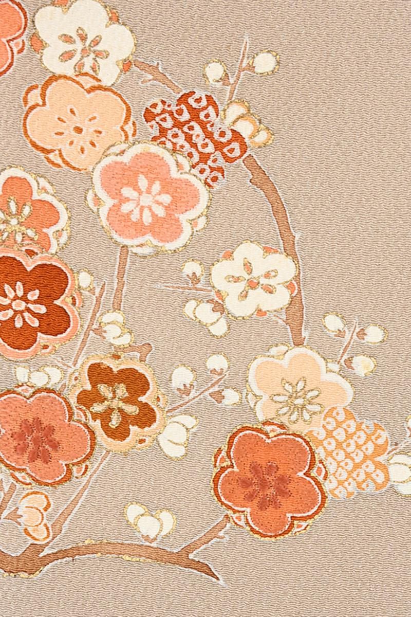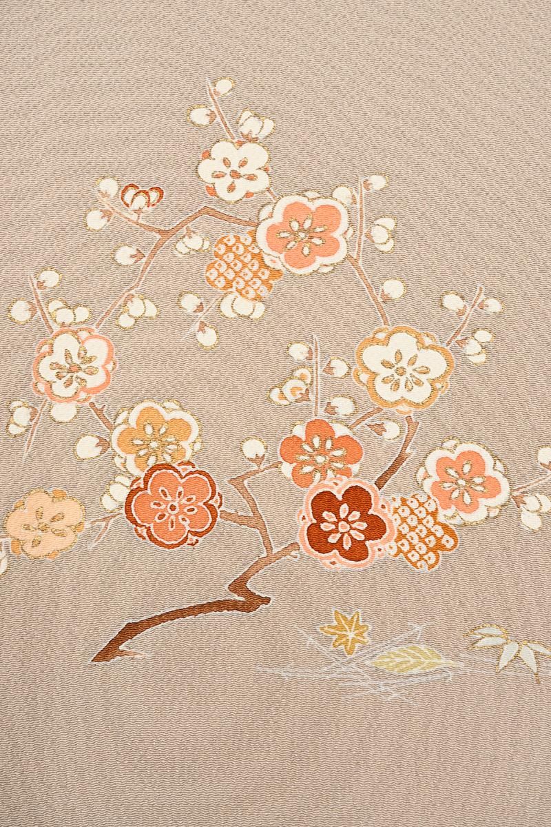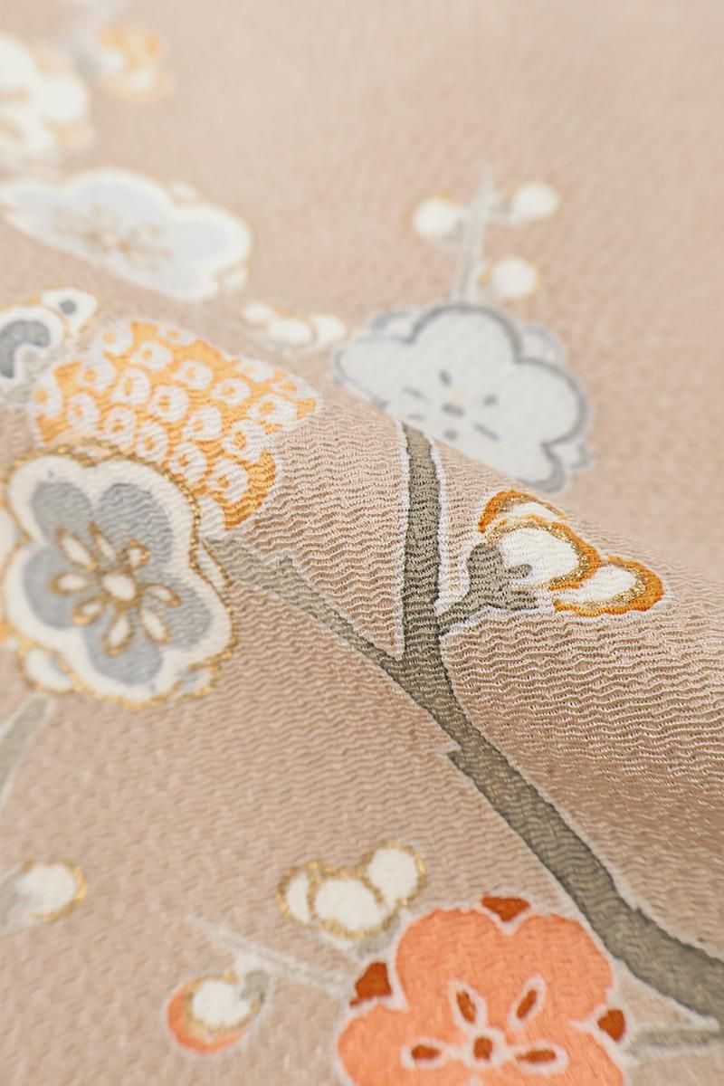 素色が近いでしょうか、灰みを含んだ淡いベージュの縮緬地に、梅の意匠や吹き寄せ文を配した訪問着です。