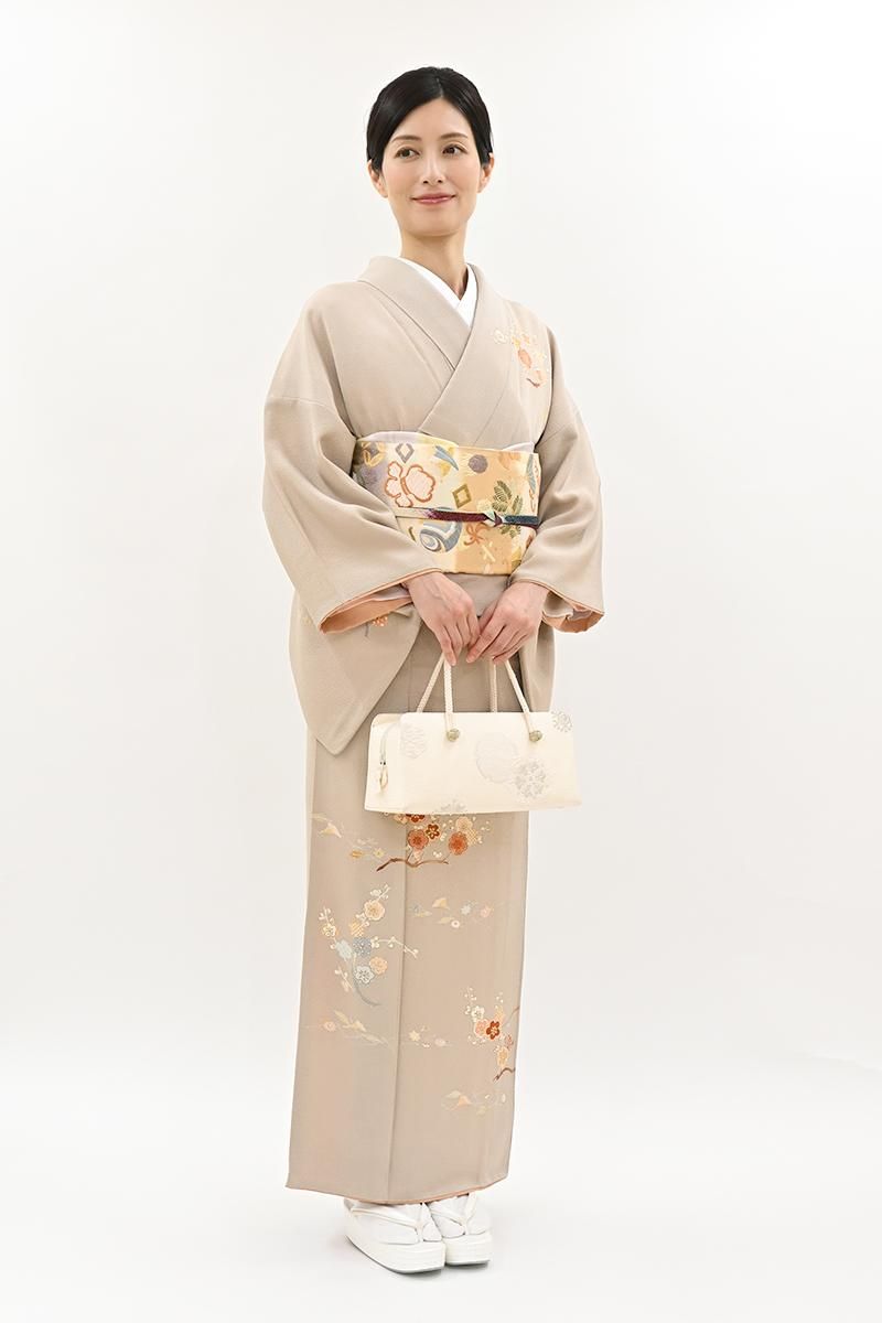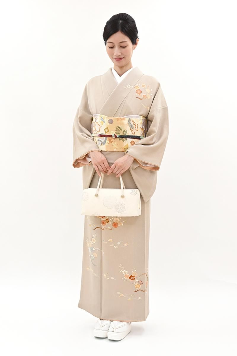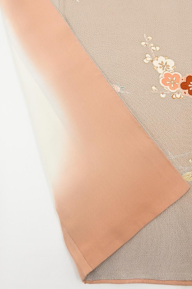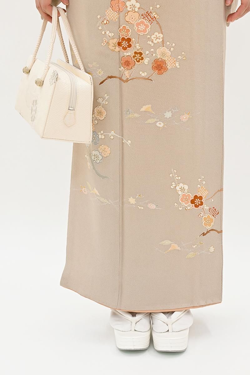 素色が近いでしょうか、灰みを含んだ淡いベージュの縮緬地に、梅の意匠や吹き寄せ文を配した訪問着です。