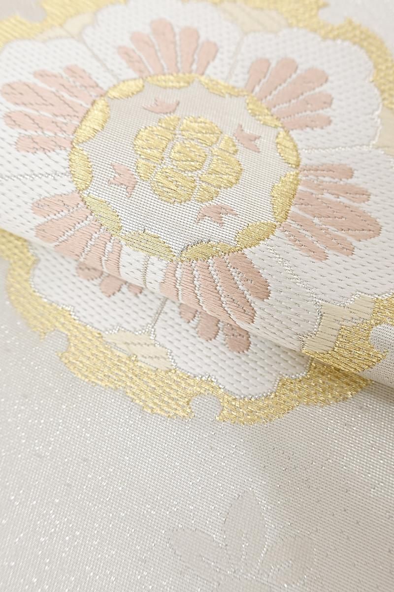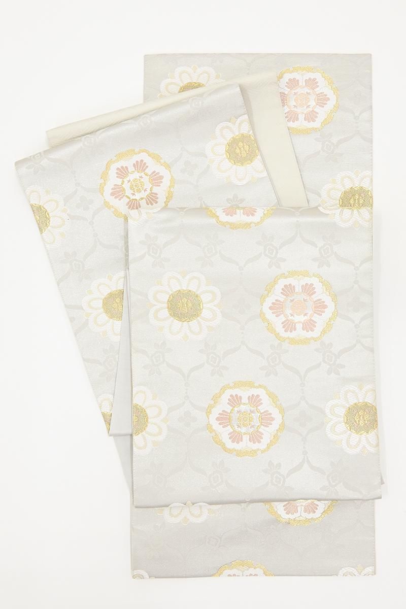 網目を思わせる装飾的な意匠の浮かぶ、ちらちらと銀糸のきらめく銀を通した灰みの白系の地に、花文をあしらった雪輪や華文を配した袋帯です。白と金銀糸のみの清々しい景色に、優しいピンクの彩りがアクセントとなり華を添えていますね。品格のある意匠の白系の帯は合わせる着物の色柄も幅広く、様々な場面で重宝にお使いいただけることと思います。式典やお呼ばれの増えるこれからの季節の装いにいかがでしょうか。